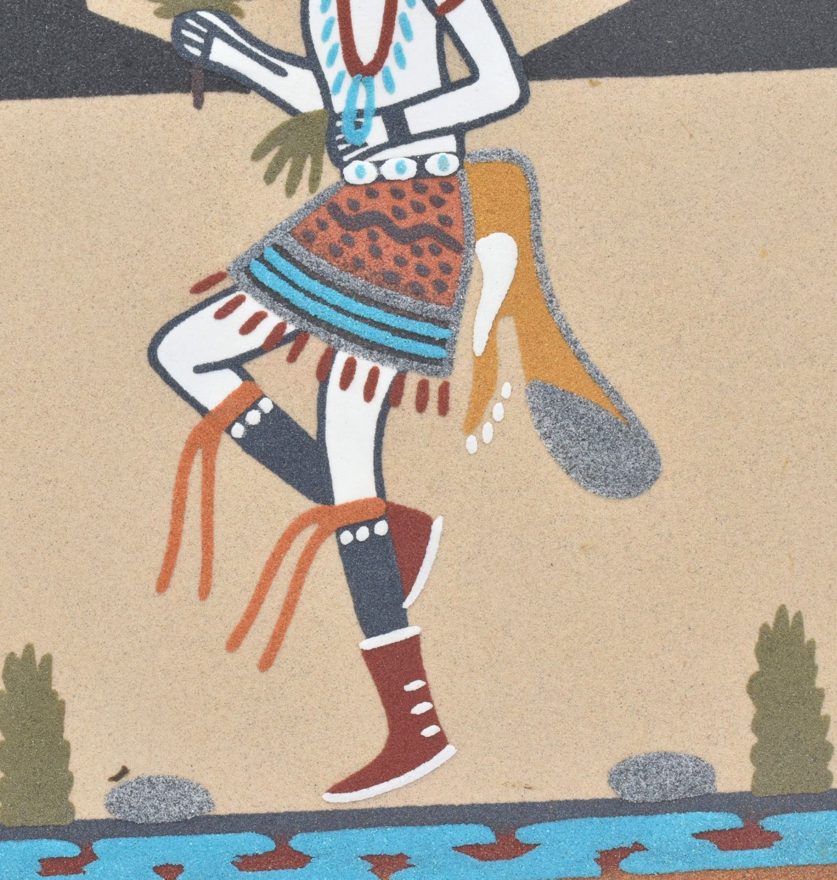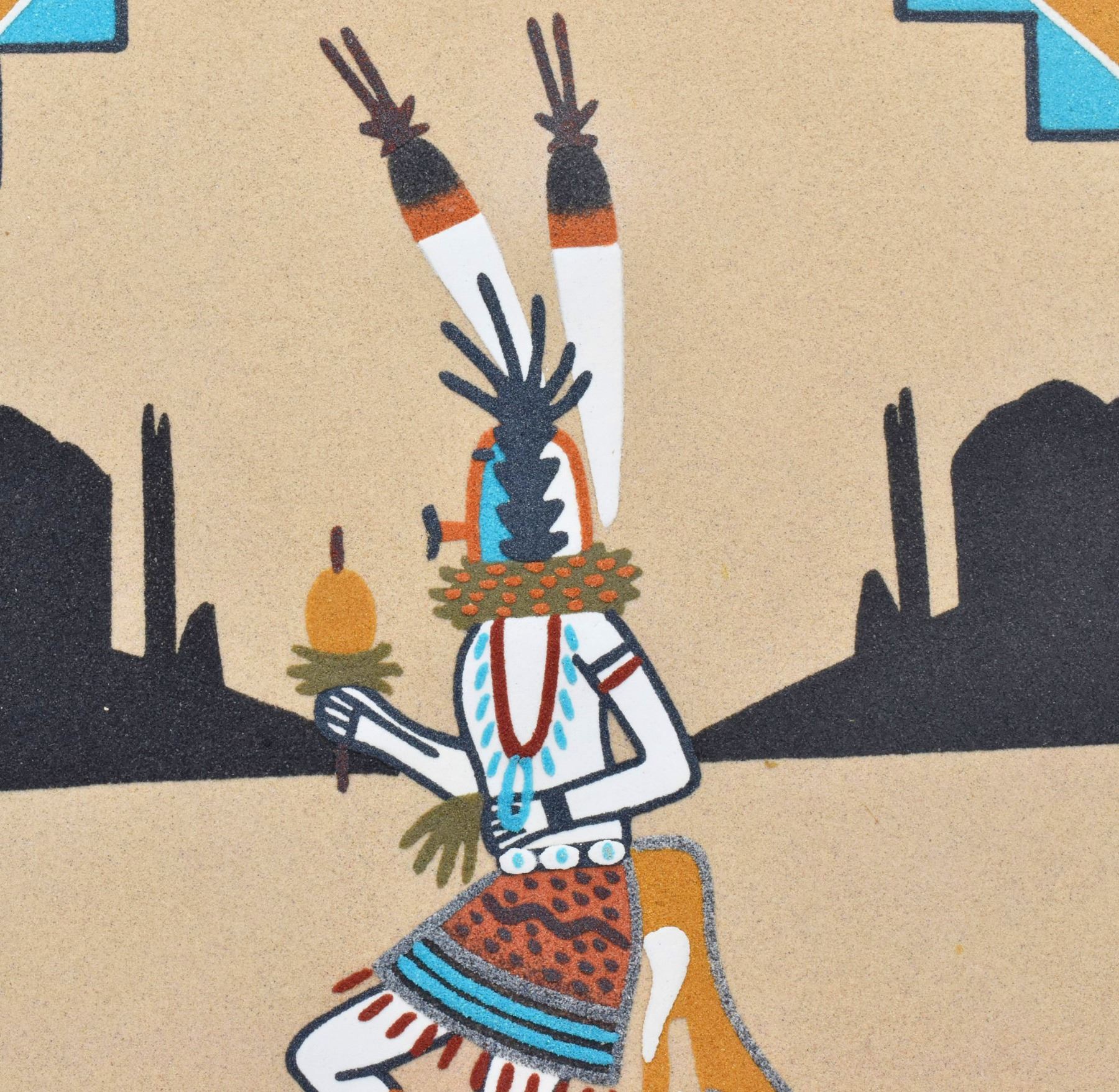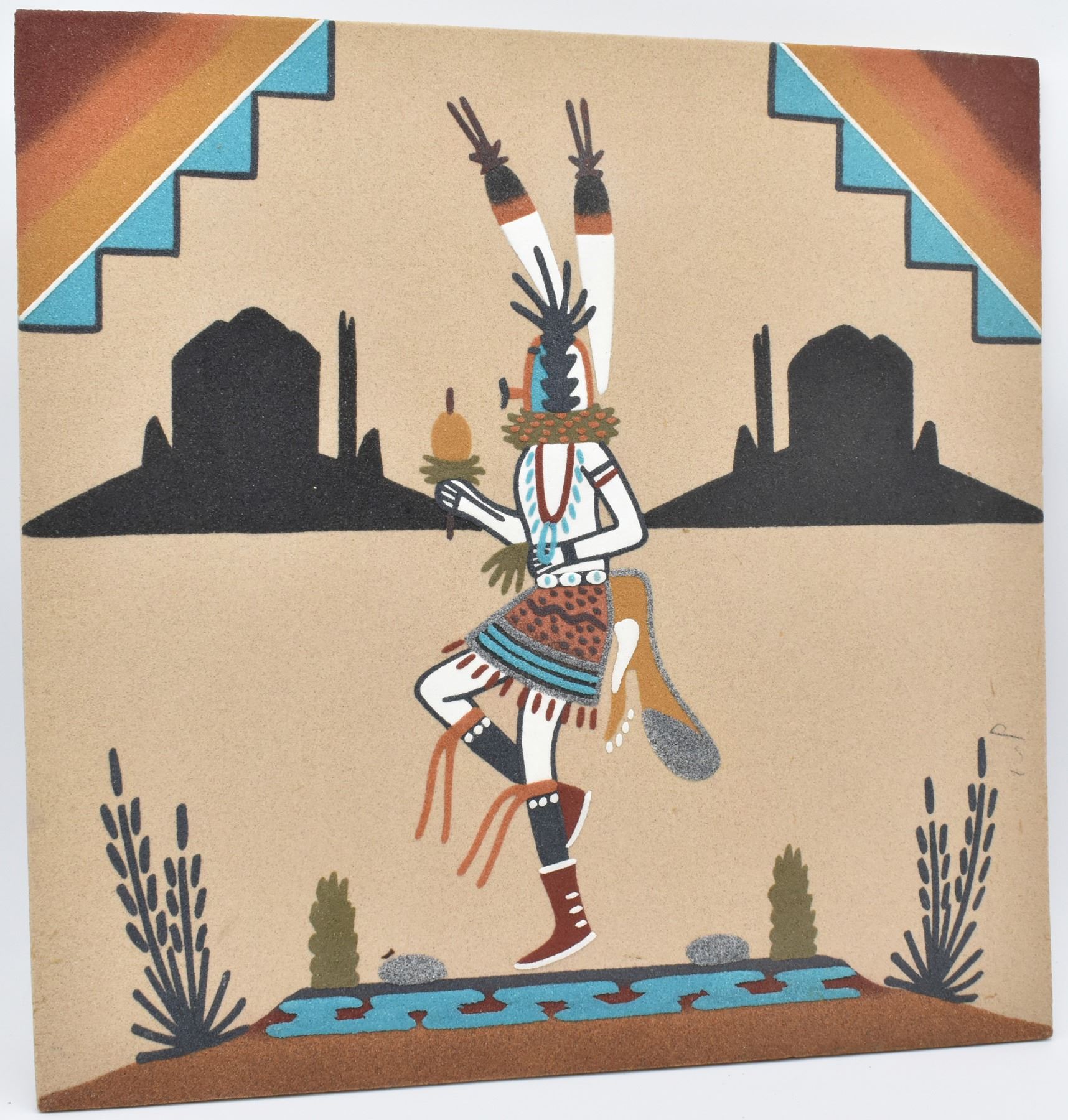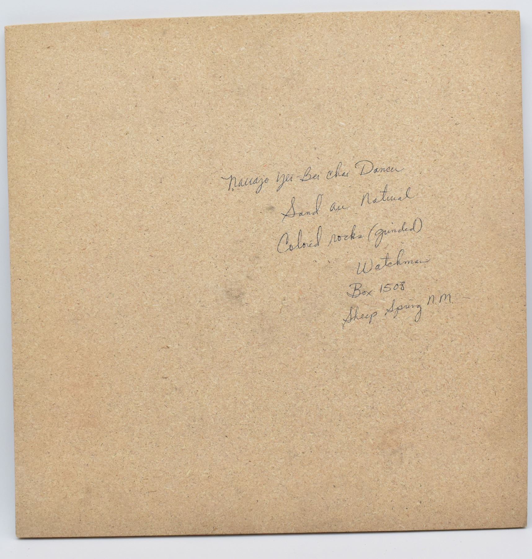 Native American Navajo Yei-Bei-Chai Dancer Sand Painting by Watchman, measures 16" square and is signed on the back, made from natural sand and ground colored rocks