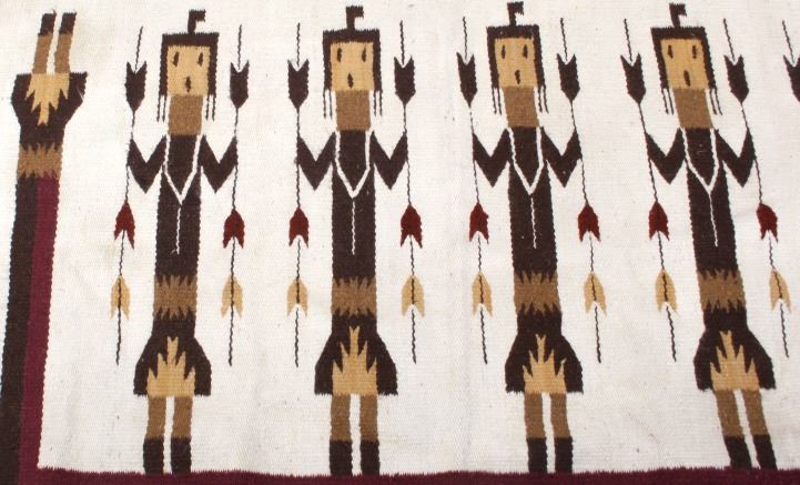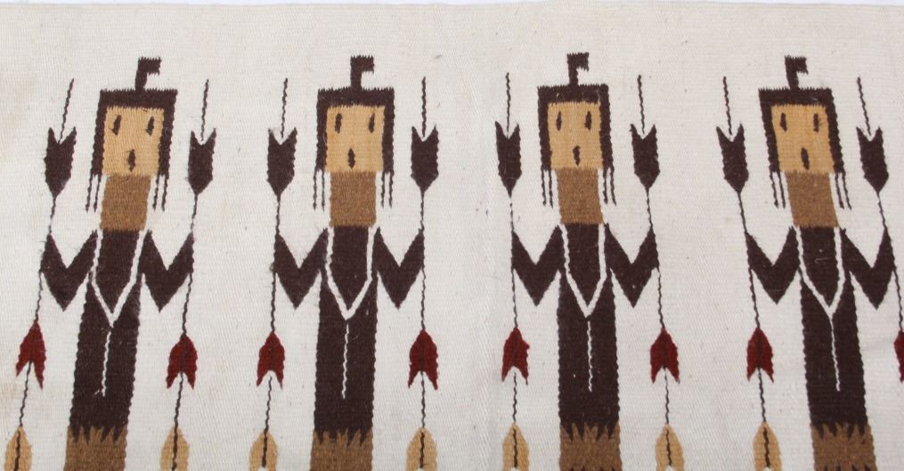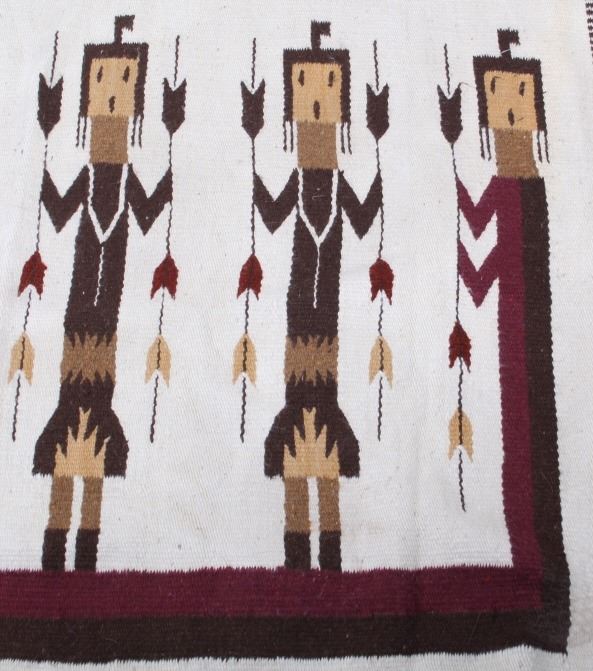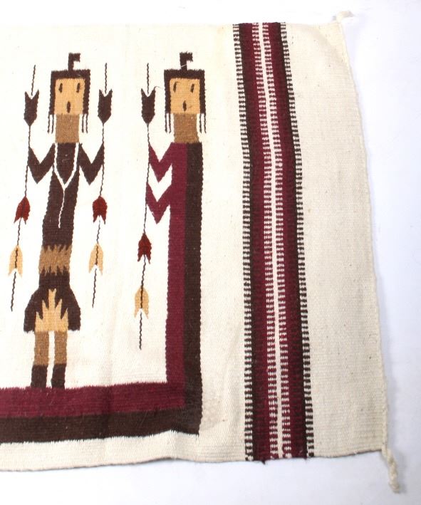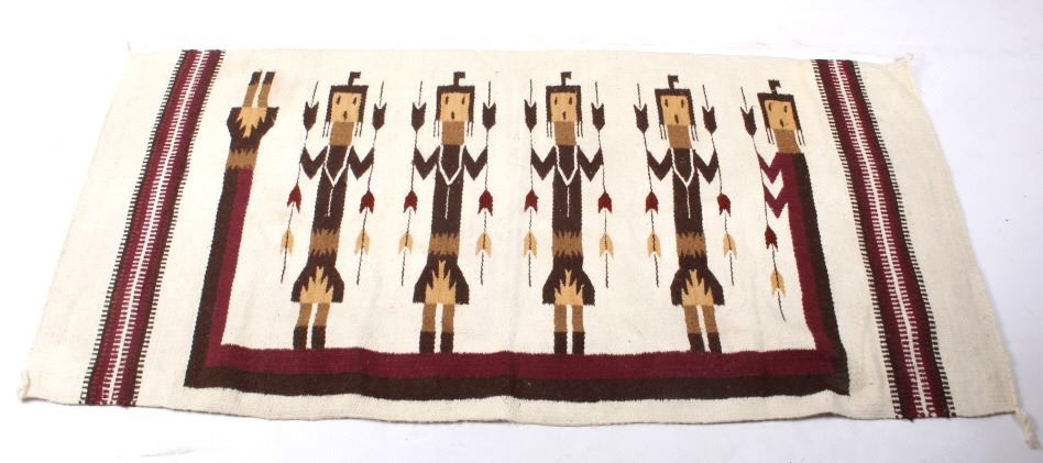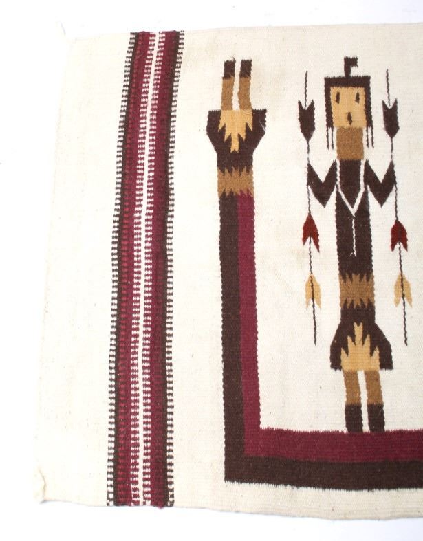 This lot features a Navajo Yei rug form the Lukachukai area. The Yei Navajo rugs begin in the Northwest corner of the reservation, in the early part of the 20 century Developed by Will Evans Trader and owner of the Shiprock trading Company. Yei are religious deities taken from the Navajo Sand paintings. But these weavings do not have any religious significance. In these weavings the male Yei have round heads & the female Yei have square heads. The Lukachukai area is west and south of the Lukachuka mountains from Shiprock. The Yei and Yeibichai weavings of this area are usually of a larger size, less colorful, made with hand spun wool and the backgrounds are much darker that in the Shiprock Yeis & Yeibichais. The rug is in good condition for its age. Measures: 62" L x 32" W