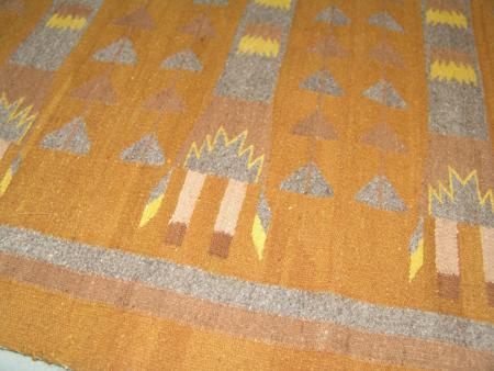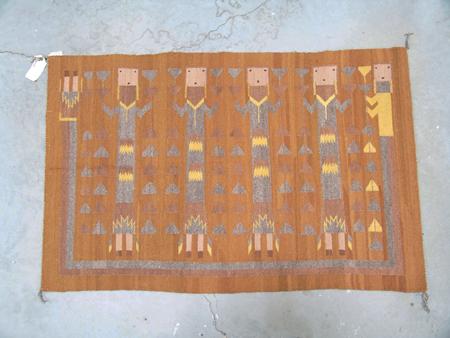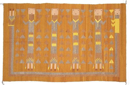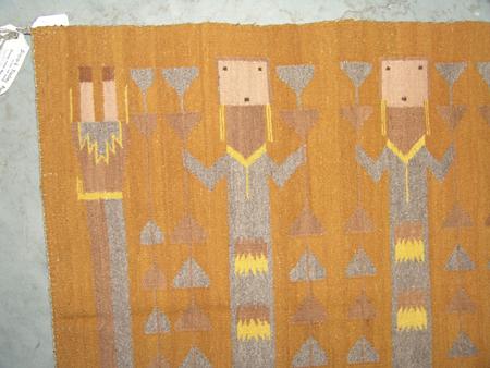Very unique gold background weaving with traditional Yei figures done in vegetal dye earth tone colors. Condition: very good. 46" x 29"