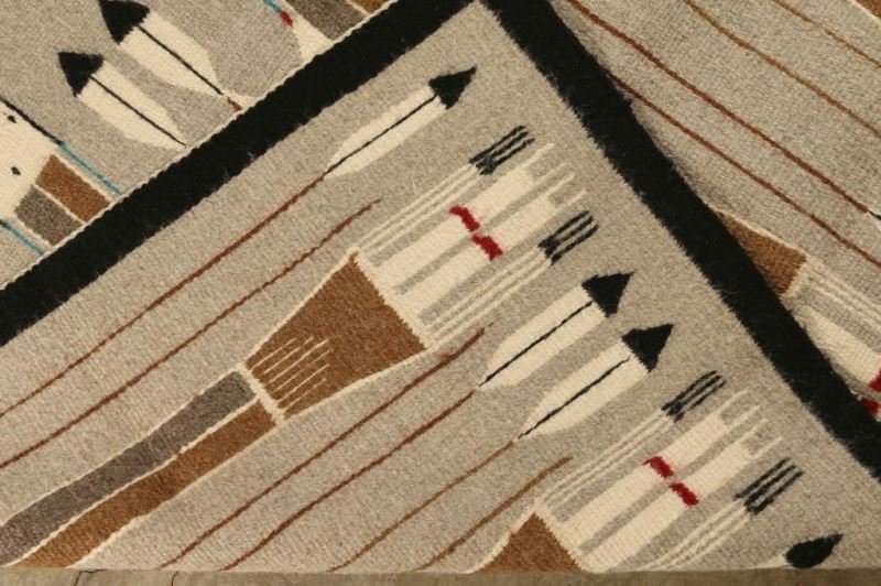 Black border with gray background and five yei figures holding feathered spears in black, gray, brown, red, blue and white. Measures 47"x30". Good condition.