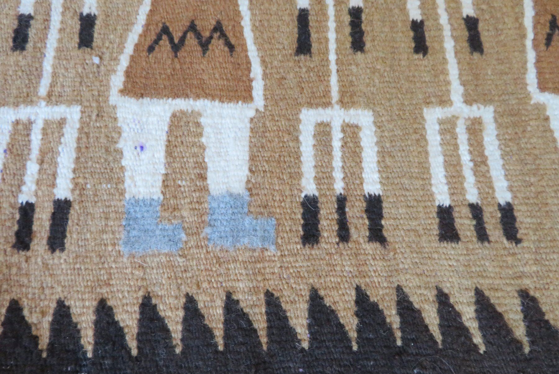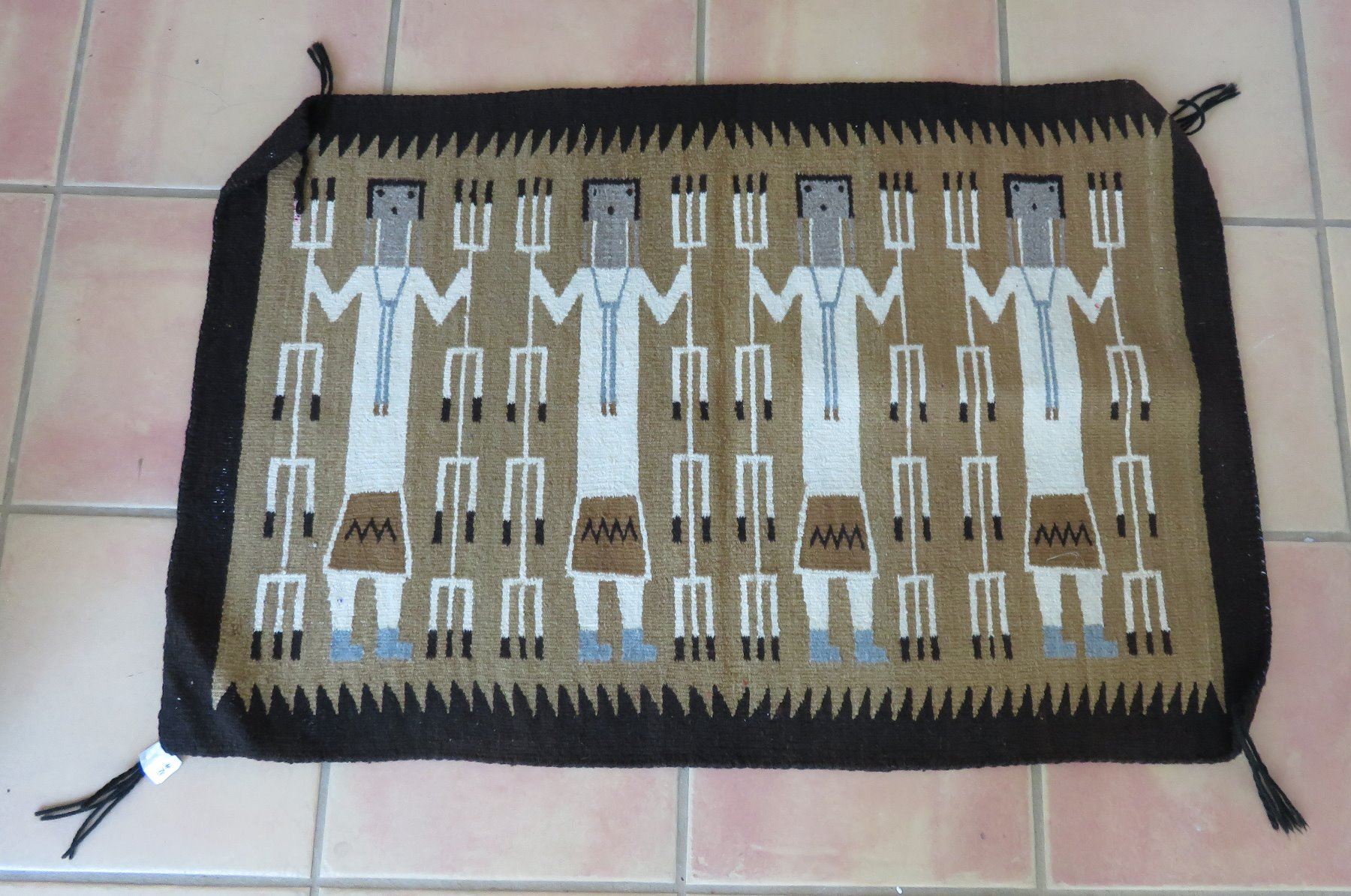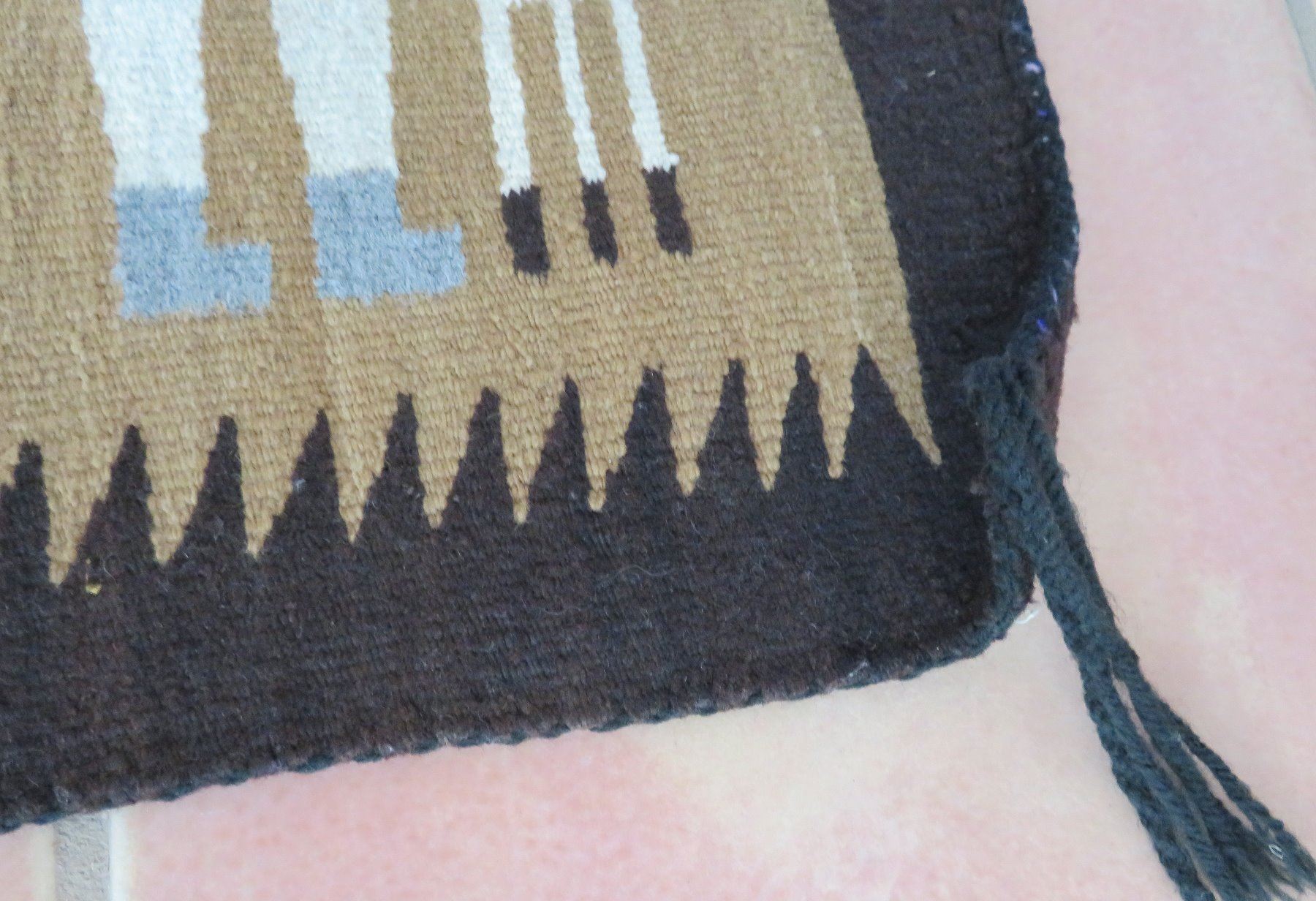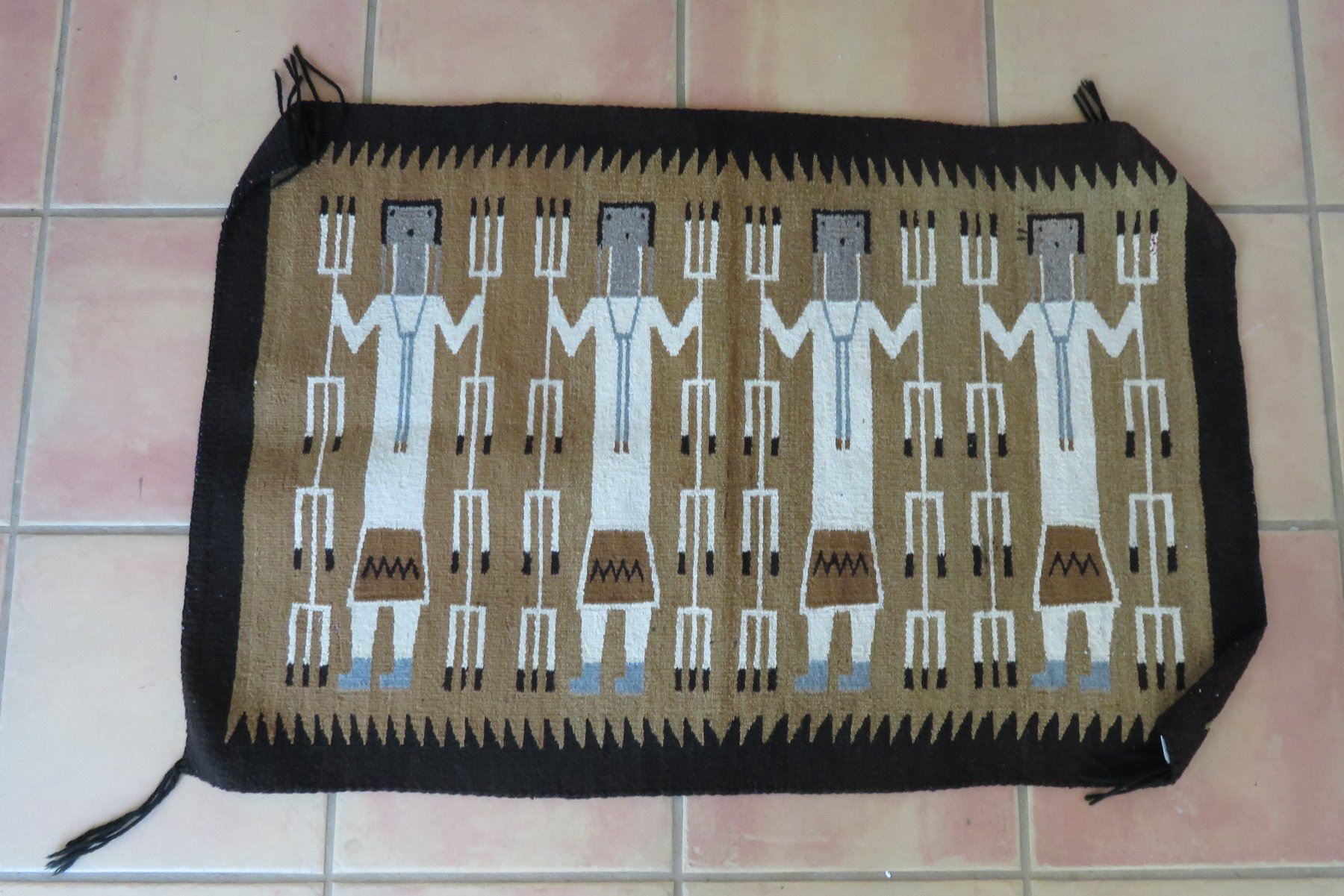Navajo Yei Rug, c. 1930-40s. Made of wool and dyed yarn, the item measures 2' x 3'. Navajo Pictorial Yei, polychrome rug. Condition: Excellent with no visible weave damage, see images. Shipping: $26.50 w/insurance and signature, due to value.