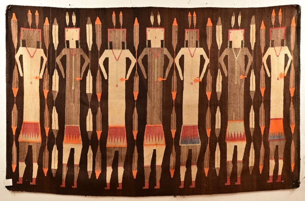 46" x 75" early vegetable dyed Navajo Yei pictoral rug.
