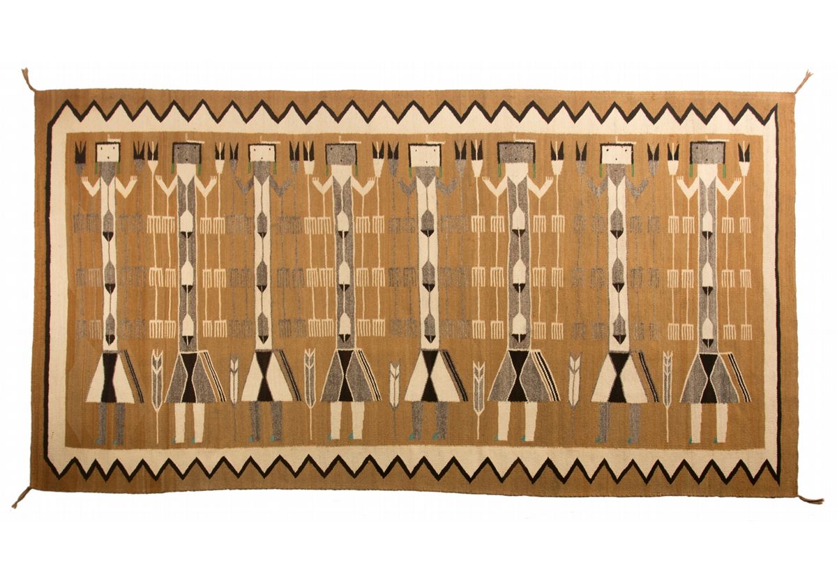 Navajo Yei Weaving. 8'9" x 4'8" pictorial with eight Yei figures inside a saw tooth border. Grey, white, brown with turquoise accents. Circa 1920s.
