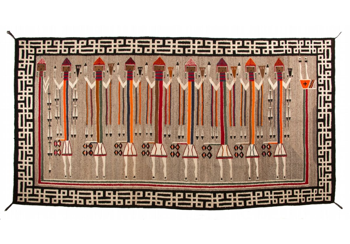 Navajo Yei Weaving. 9' x 4'9". Eight Yei figures surrounded by a Rainbow Guardian. Wide intricate border. Bold accent colors of red, green and orange. Circa 1920s.