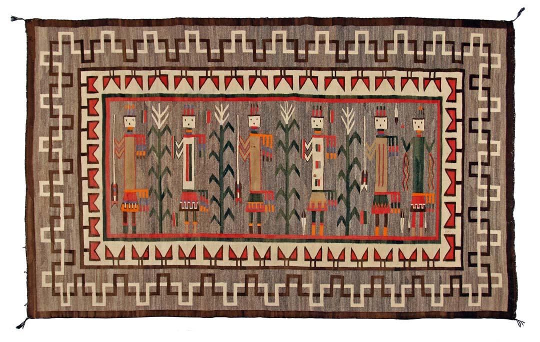 Navajo Yei Weaving. 90" x 55". Six figures separated by cornstalks. Five turned to the side holding various objects, one facing forward holding a feather & staff. Wide border. Circa 1930s-40s. (est $4,000-6,000). For condition reports please visit: www.auctioninsantafe.com/cr2011.pdf