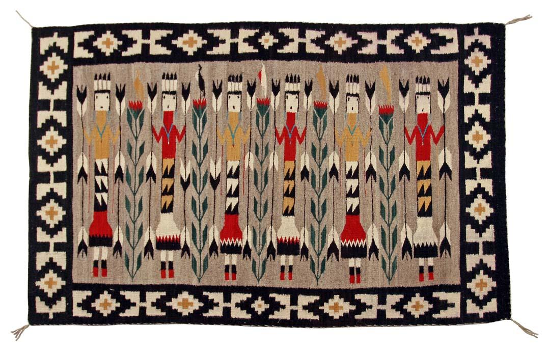 Navajo Yei Weaving. 75" x 48". 6 figures holding arrows separated by stalks with perched birds. Wide variety of dyed handspun wool. Circa 1940s. (est $2,000-4,000). For condition reports please visit: www.auctioninsantafe.com/cr2011.pdf