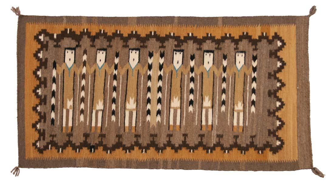 Navajo Yei Weaving. 59" x 32". Woven by Mary B. Charley in 1974. Crownpoint Rug Weaver's tag attached. (est $600-800). For condition reports please visit: www.auctioninsantafe.com/cr2011.pdf