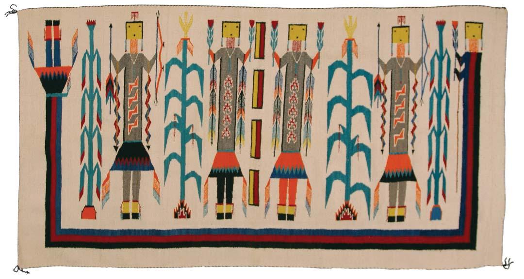 Navajo Yei Weaving. 75 ½" x 43". Four figures holding bows, arrows & flowers, separated by cornstalks & surrounded by the Rainbow Guardian. Circa 1950s. (est $2,000-3,000). For condition reports please visit: www.auctioninsantafe.com/cr2011.pdf