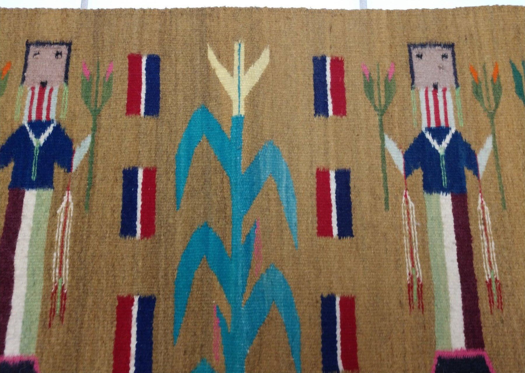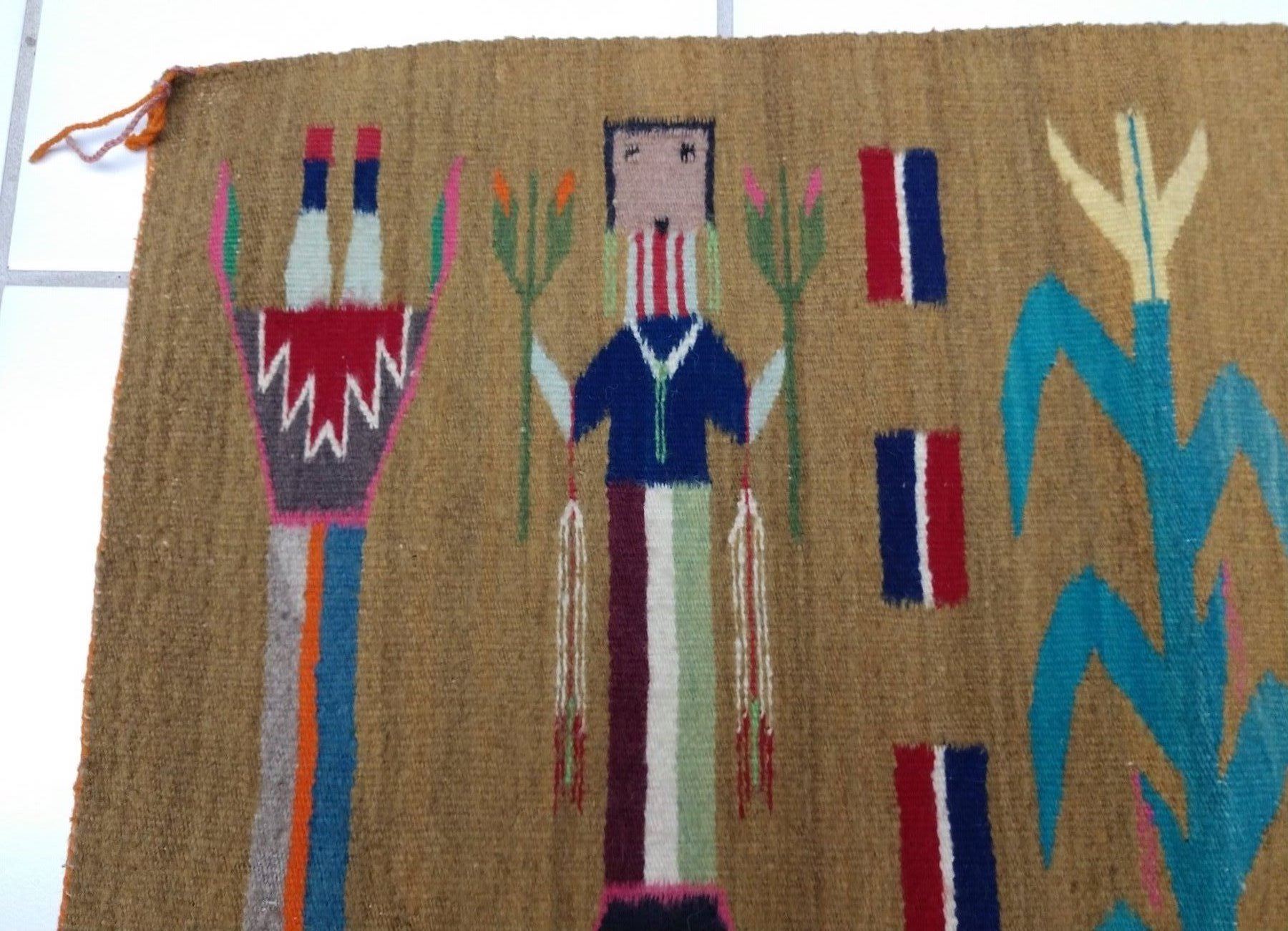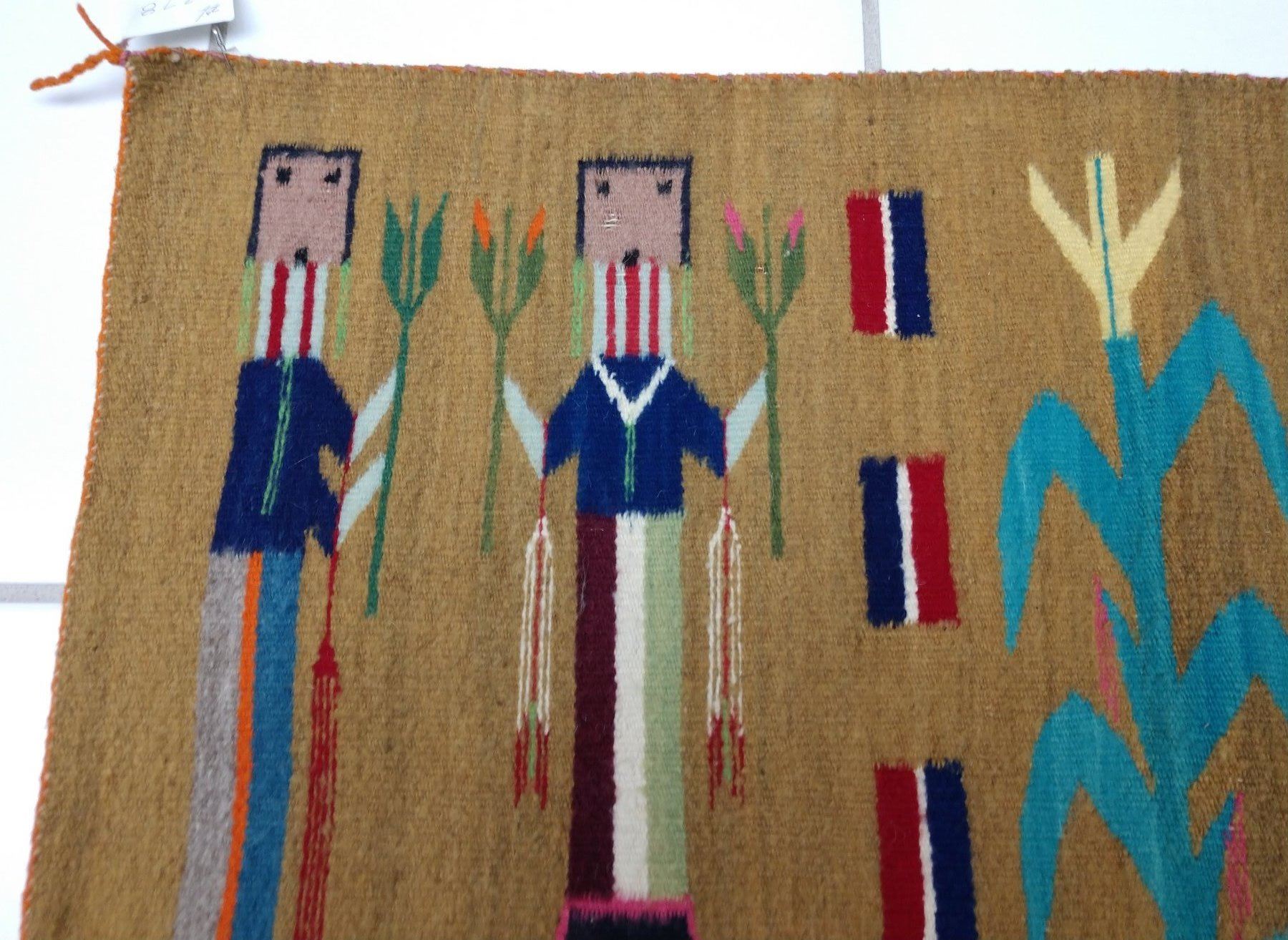 Navajo Yei Weaving, c. 1950s. Made of wool and dye, the item measures 33" x 24". Navajo, New Mexico. Nice figures and stalk of life. Condition: Good, see images. Shipping: $23.50 w/insurance and signature, due to value.