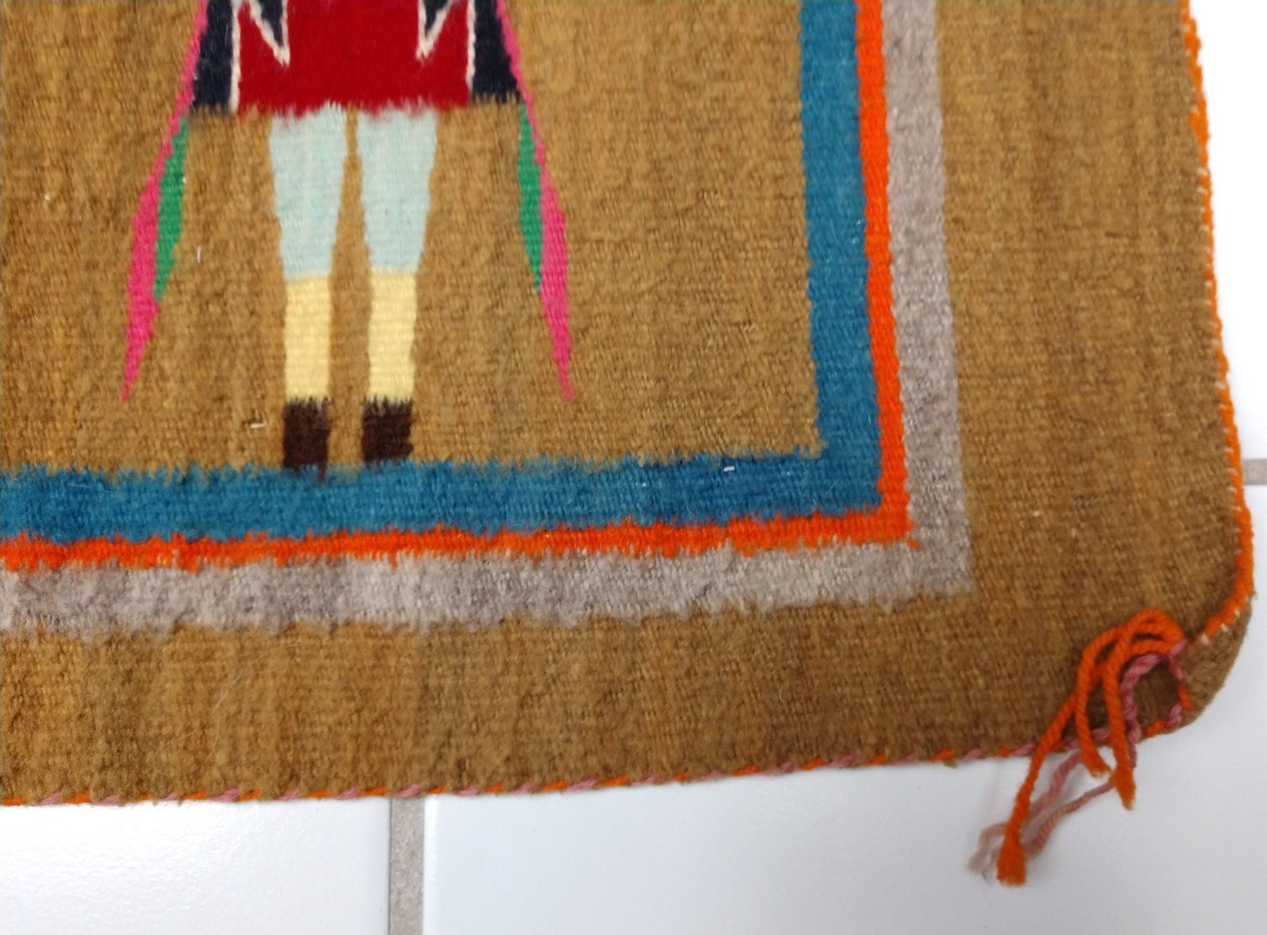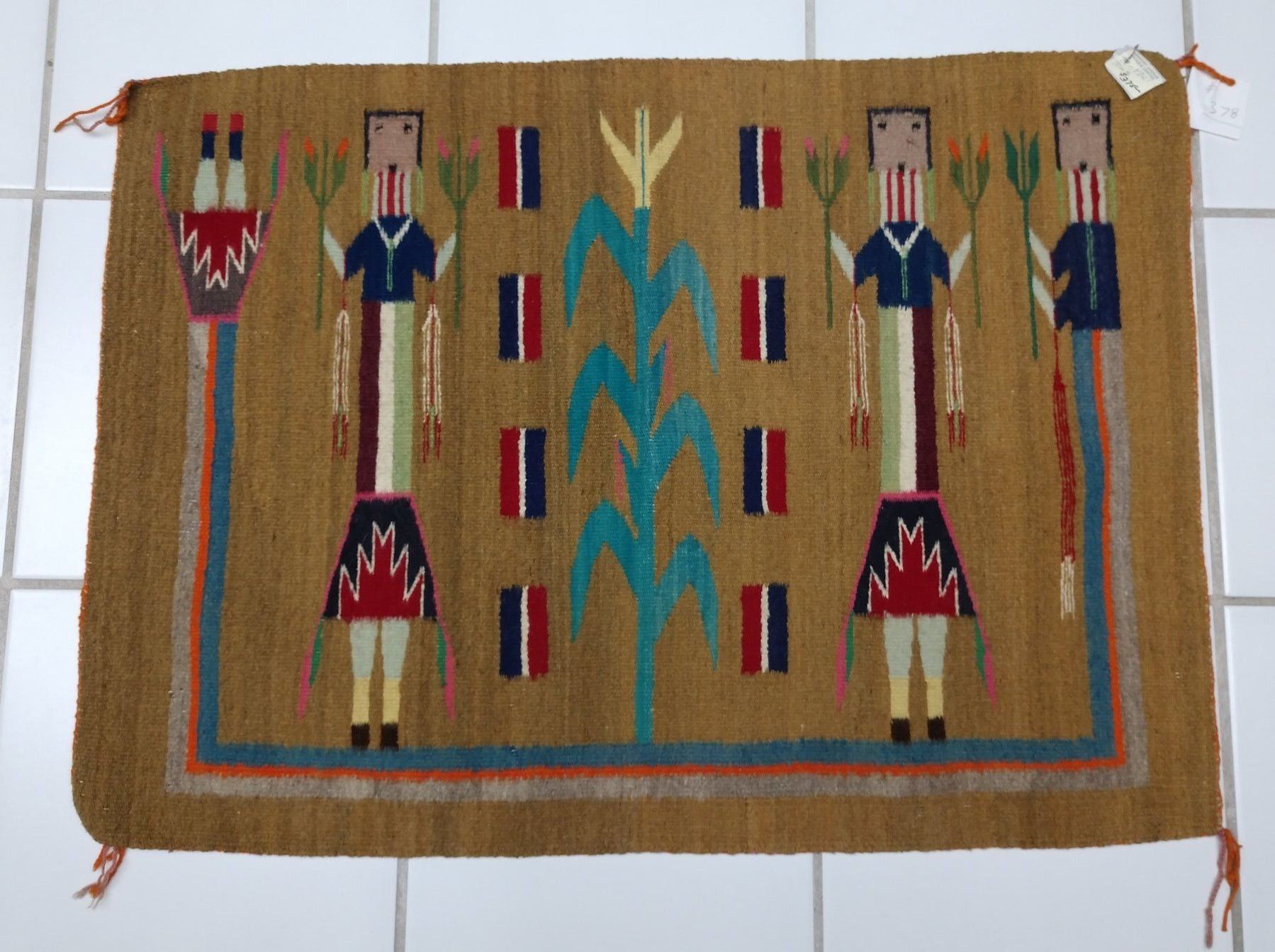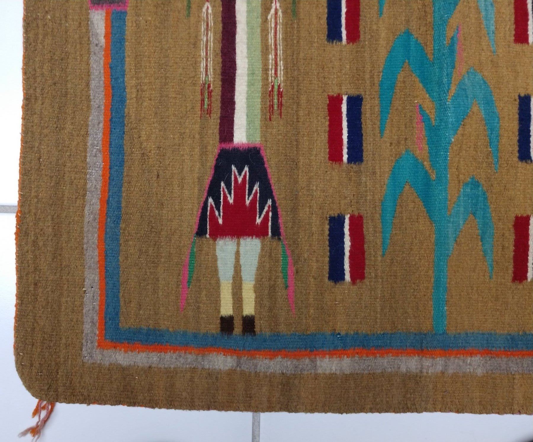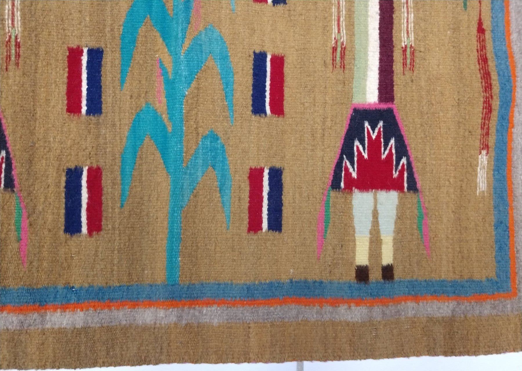 Navajo Yei Weaving, c. 1950s. Made of wool and dye, the item measures 33" x 24". Navajo, New Mexico. Nice figures and stalk of life. Condition: Good, see images. Shipping: $23.50 w/insurance and signature, due to value.