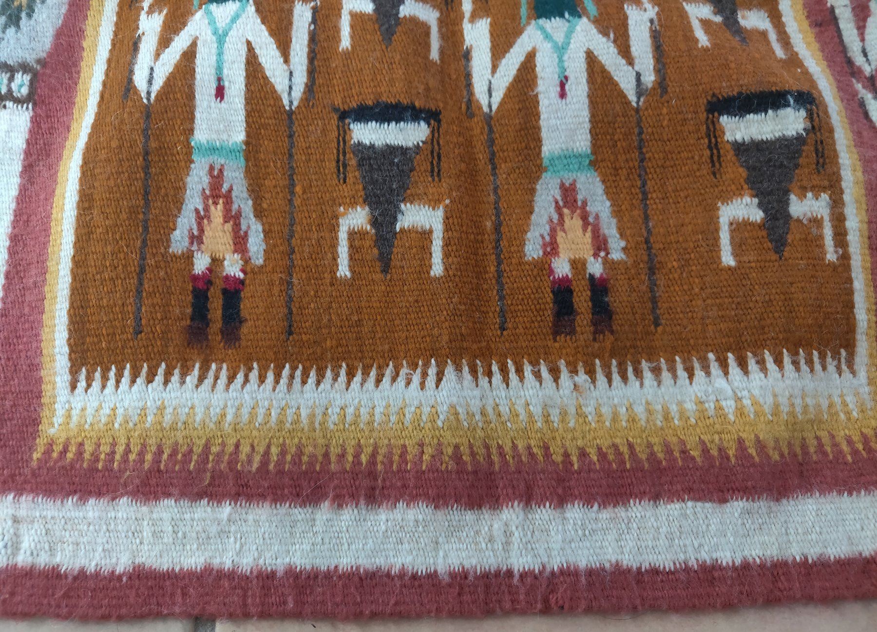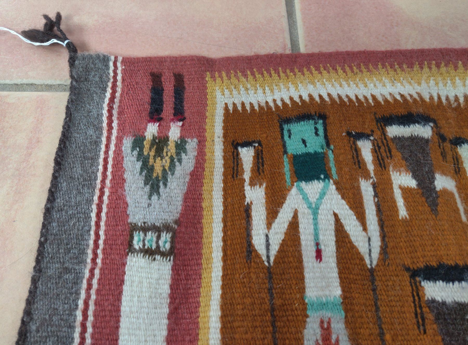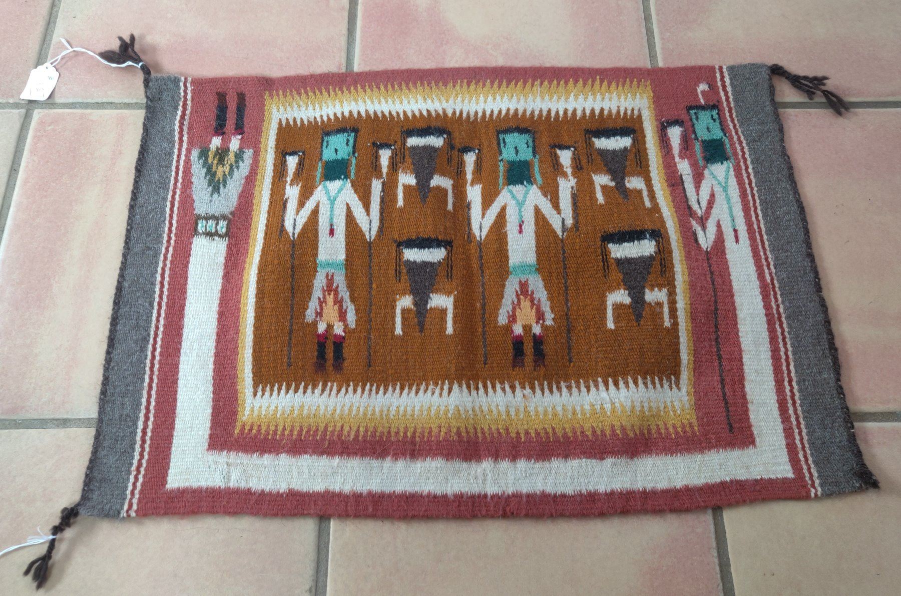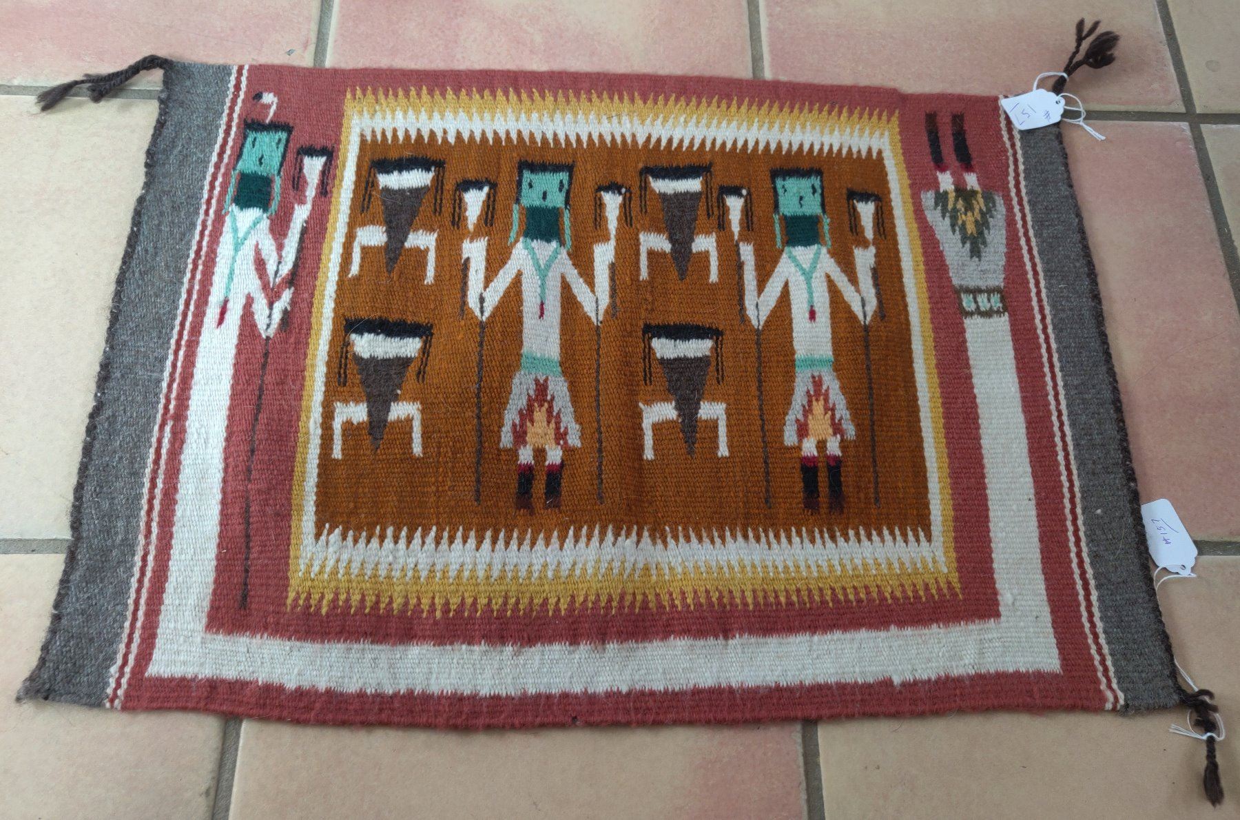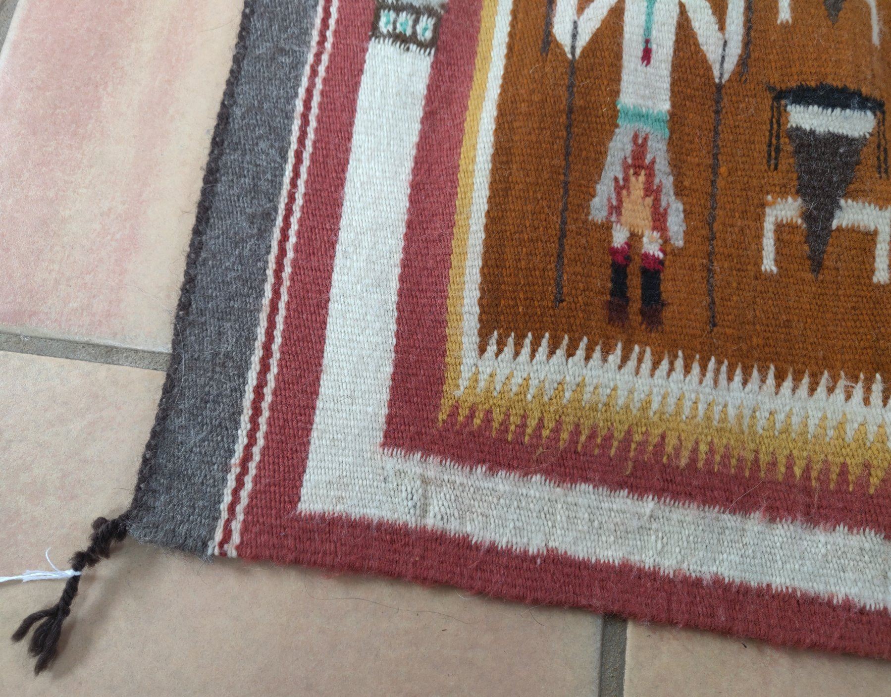 Navajo Yei Weaving, c. 1940s. Made of wool, the item measures 25" x 16". New Mexico. Figured Navajo Yei small rug. Condition: Good, see images. Shipping: $20.00 w/insurance and signature, due to value.