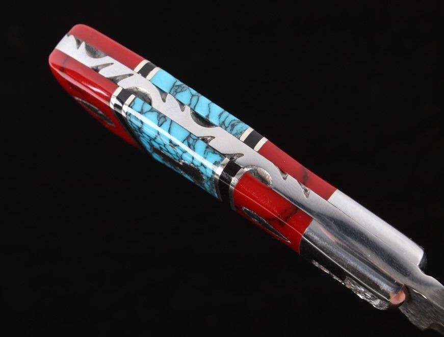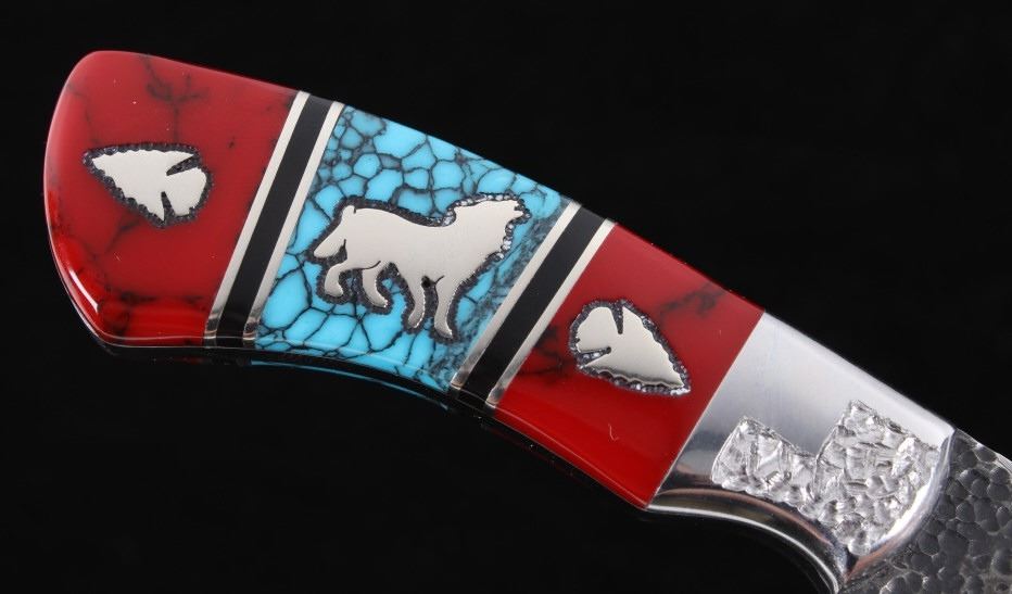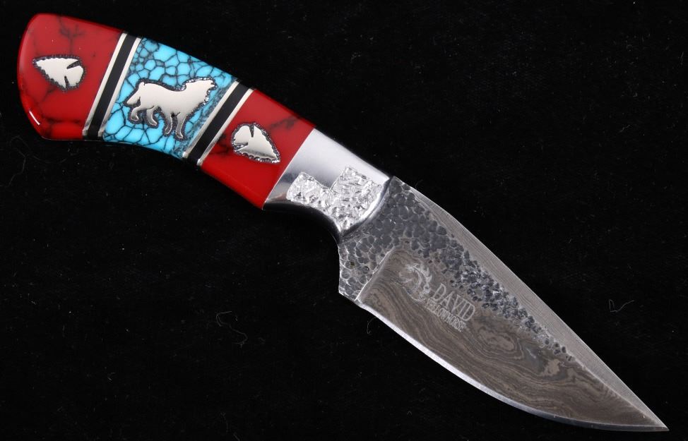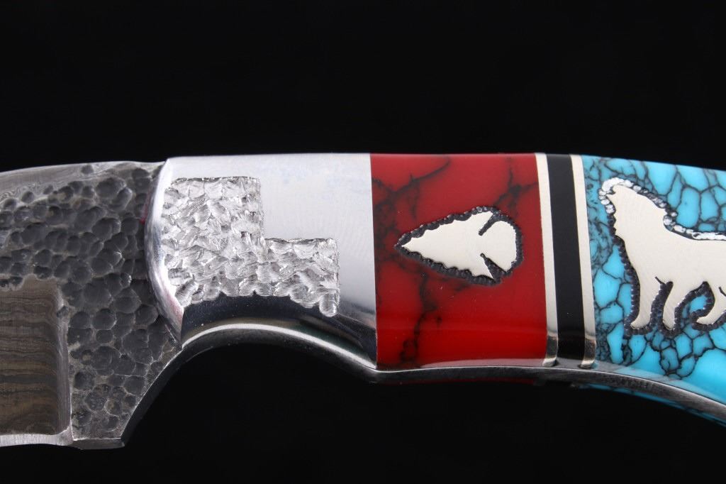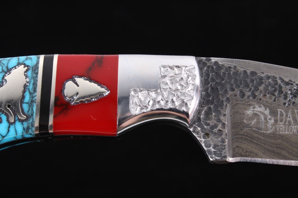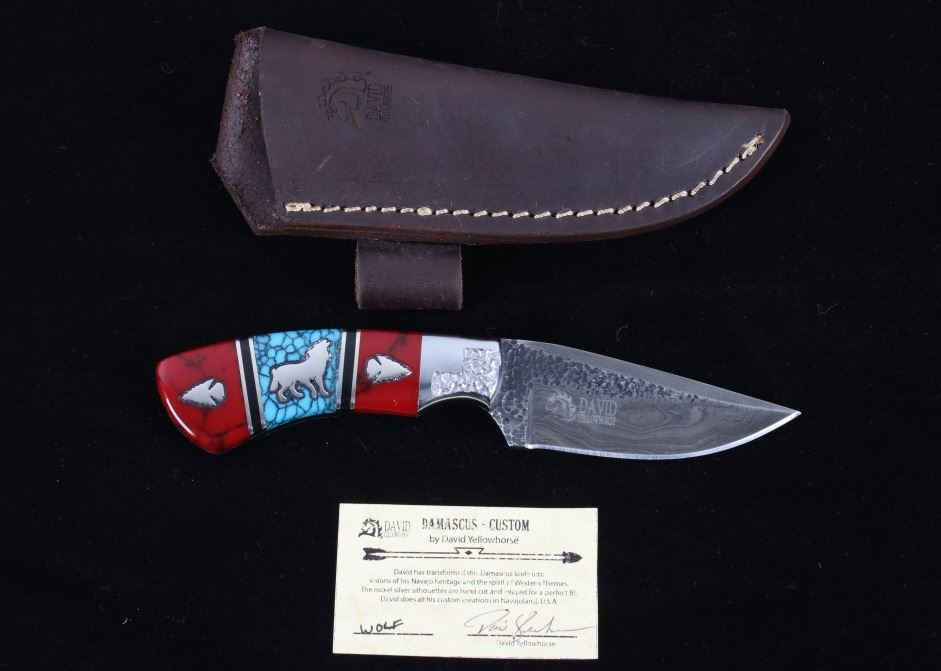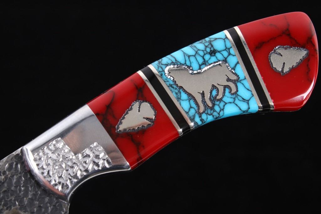 This is the newest offering from our partnership with David Yellowhorse, a Damascus knife set with turquoise, onyx, black matrix red jasper along with silver wolf profile. David Yellowhorse has transformed this knife into visions of his Navajo heritage and the spirit of Western themes. The piece shows a fine Damascus forged blade having a ladder pattern in a drop point camp shape with blacksmith hammered finish on the spine which also shows black spider matrix Turquoise, black matrix red jasper and black Onyx inlaid on both sides of the handle along with hand cutout silhouettes of a howling wolf. The silver inlays are shown on both sides of the grips. The bolsters have each been hand stippled / hammered by David Yellowhorse with his iconic stepped design. The spine of the handle has been vine file worked by hand. The bolster is marked with “David Yellowhorse Custom” along with his logo. The knife has been paired with a Great American Bison Buffalo leather hand crafted sheath which is also marked with David Yellowhorse name and logo. The knife is in brand new condition and comes with a Certificate of Authenticity which is marked as being "wolf" and is signed by David Yellowhorse. We are one of the only companies if not the only company offering directly sourced Damascus blades from David Yellowhorse custom knives with a with large blades of such a high quality. The knife measures 6 3/4" long overall with a 3 1/4" long blade. In the sheath is 7 1/2" long.