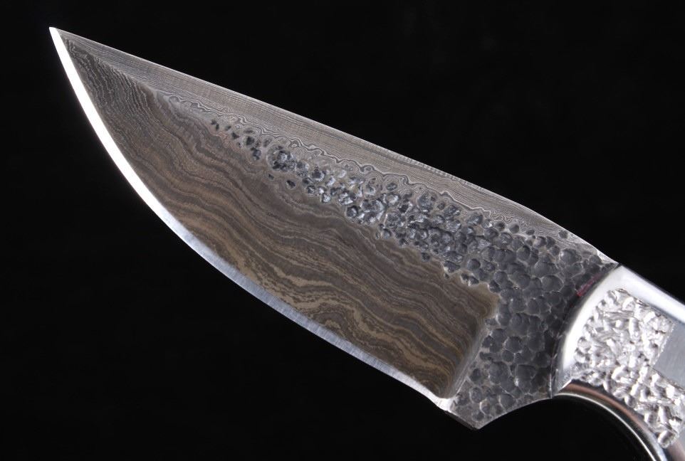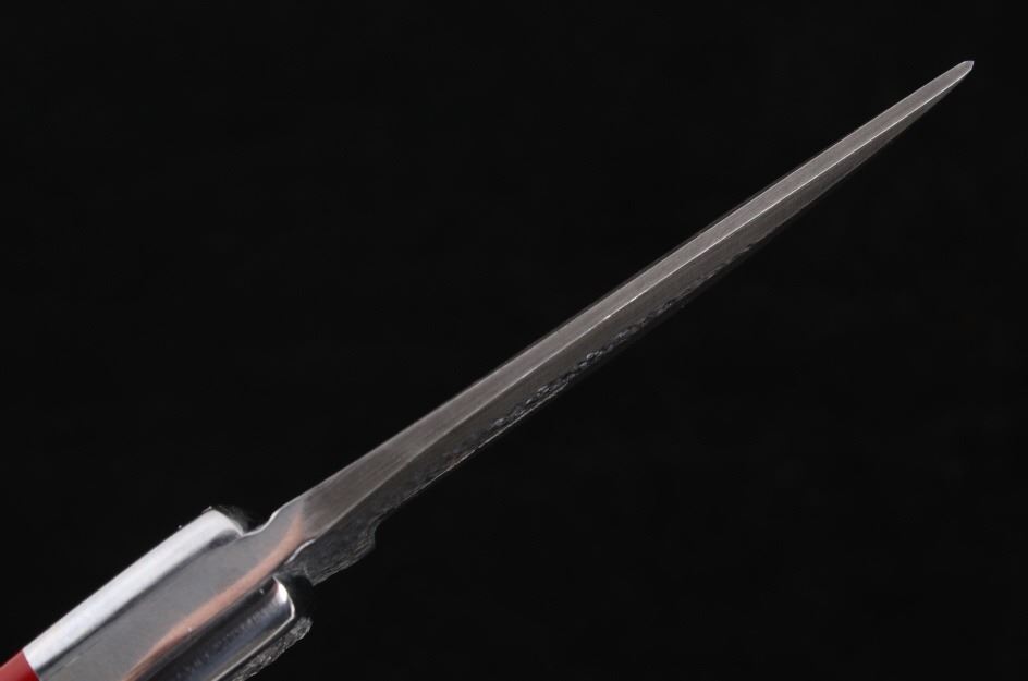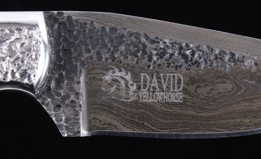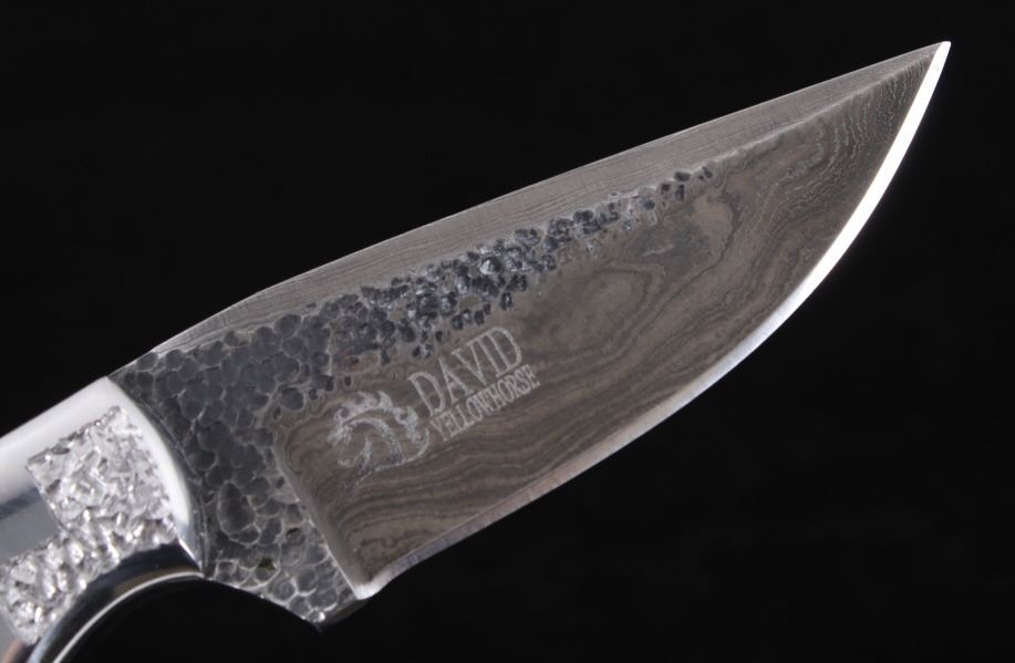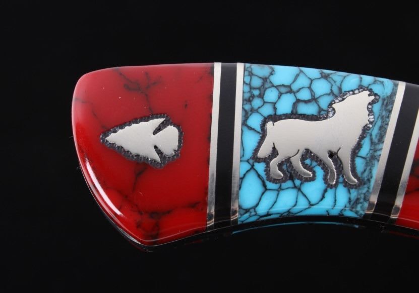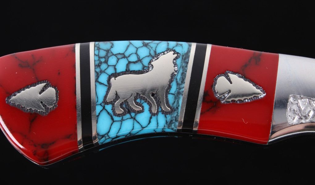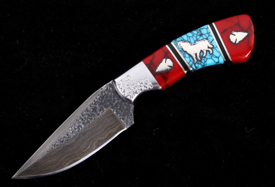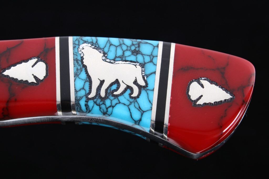 This is the newest offering from our partnership with David Yellowhorse, a Damascus knife set with turquoise, onyx, black matrix red jasper along with silver wolf profile. David Yellowhorse has transformed this knife into visions of his Navajo heritage and the spirit of Western themes. The piece shows a fine Damascus forged blade having a ladder pattern in a drop point camp shape with blacksmith hammered finish on the spine which also shows black spider matrix Turquoise, black matrix red jasper and black Onyx inlaid on both sides of the handle along with hand cutout silhouettes of a howling wolf. The silver inlays are shown on both sides of the grips. The bolsters have each been hand stippled / hammered by David Yellowhorse with his iconic stepped design. The spine of the handle has been vine file worked by hand. The bolster is marked with “David Yellowhorse Custom” along with his logo. The knife has been paired with a Great American Bison Buffalo leather hand crafted sheath which is also marked with David Yellowhorse name and logo. The knife is in brand new condition and comes with a Certificate of Authenticity which is marked as being "wolf" and is signed by David Yellowhorse. We are one of the only companies if not the only company offering directly sourced Damascus blades from David Yellowhorse custom knives with a with large blades of such a high quality. The knife measures 6 3/4" long overall with a 3 1/4" long blade. In the sheath is 7 1/2" long.