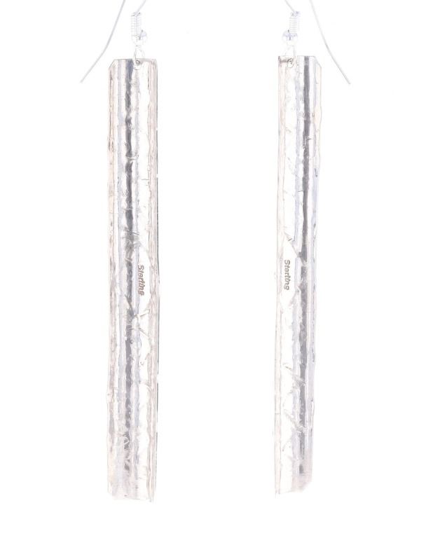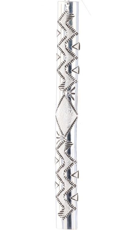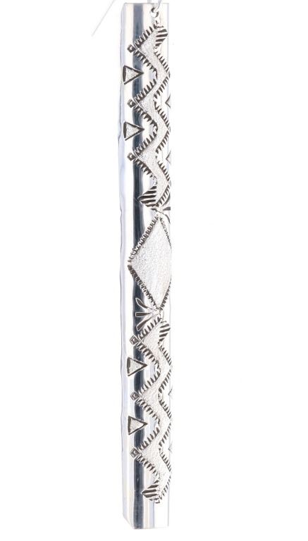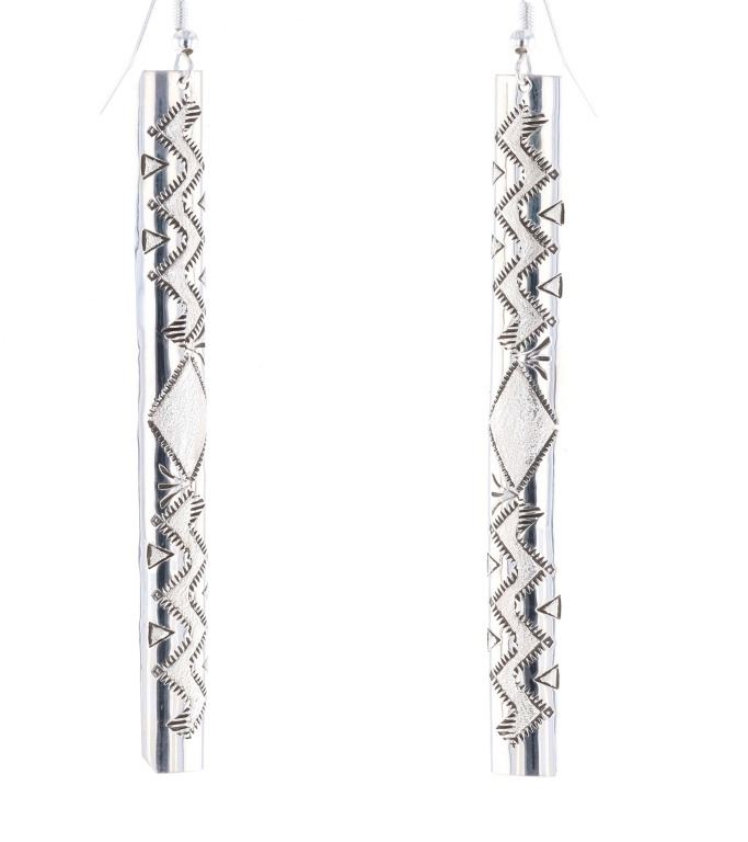 Featured in this lot is this embossed pair of sterling silver earrings from Navajo artist Zane Tahe. The earrings feature a beautiful embossed and textured face that features geometric patterns consistent with traditional Navajo decoration. The earrings are stamped 'sterling' on the backs. The condition of this pair of earrings is good, with no obvious signs of damage. The measurements of this pair of earrings are 3 5/8" x 3/8" x 1/8". The overall weight of these earrings is 7.7 g.