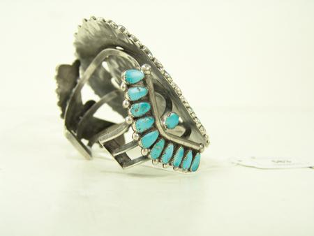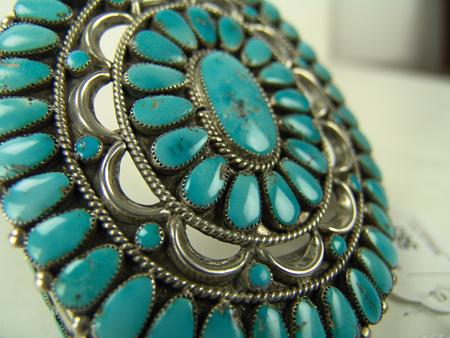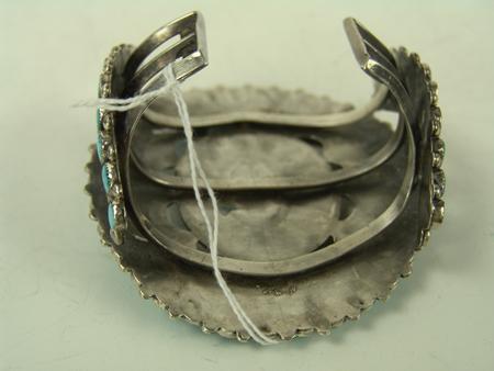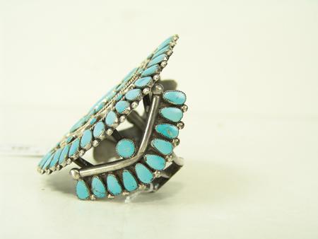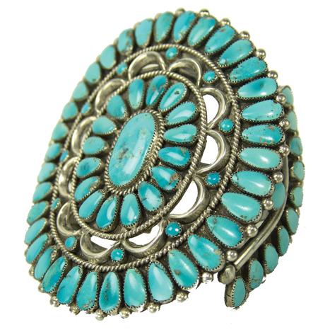 Circa 1980s, Classic design round cluster style silver cuff bracelet set with 85 individually cut and set matching turquoise stones on the top and sides. Very good condition. 5-3/4" x 4" + 1-1/4" gap