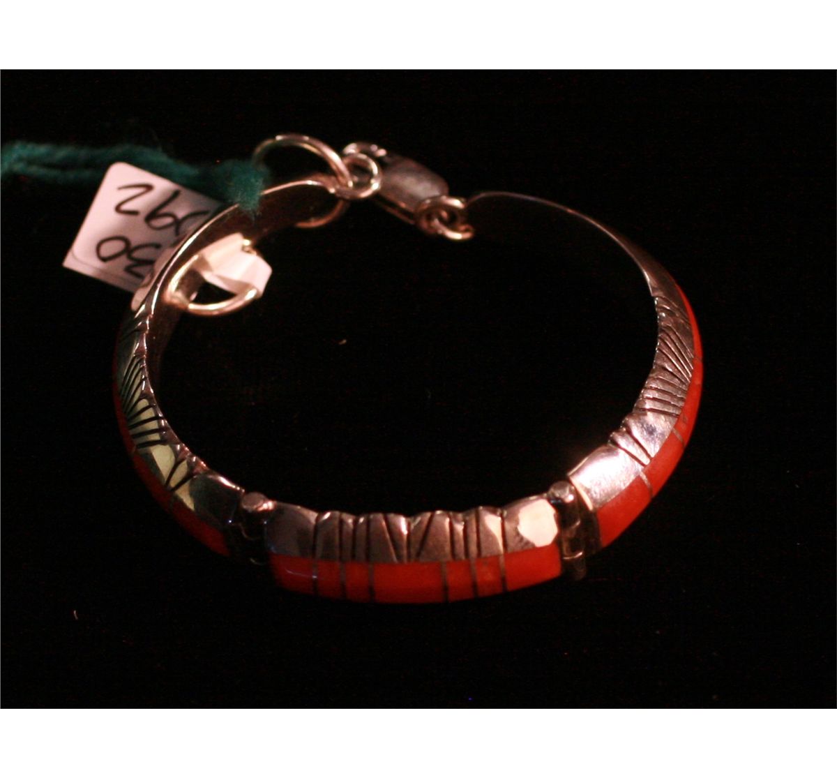 Sterling Silver Hinged Segment Bracelet, Channel inlaid with ox blood coral, 6" x 3/8" wide, -530092-