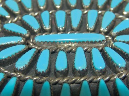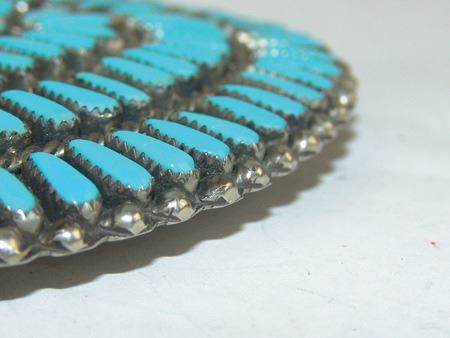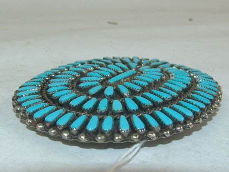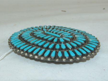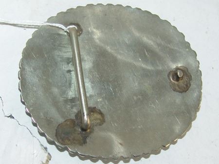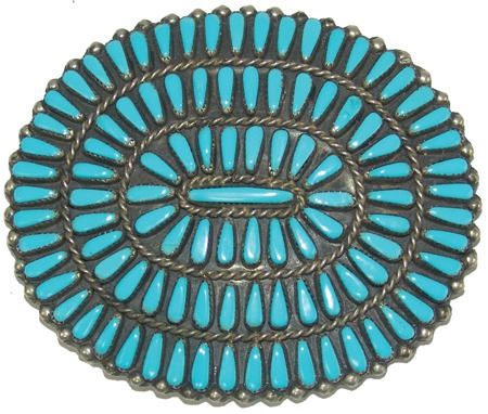 Ca. 1980s, Large classic cluster design oval-shaped turquoise and silver belt buckle. Very good condition, unsigned. 4" x 3-1/2"