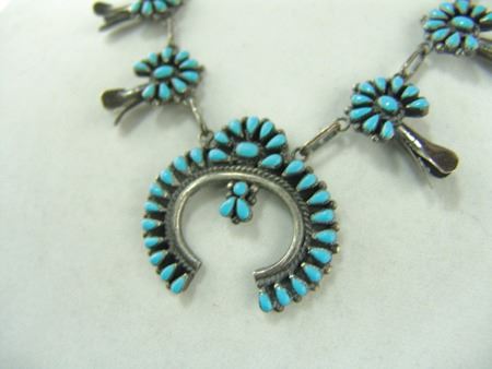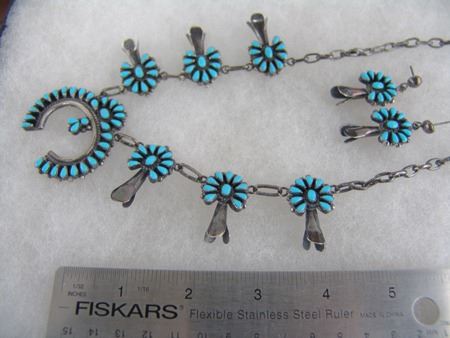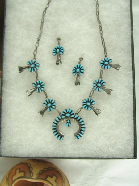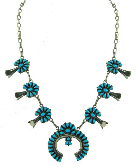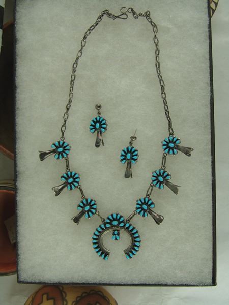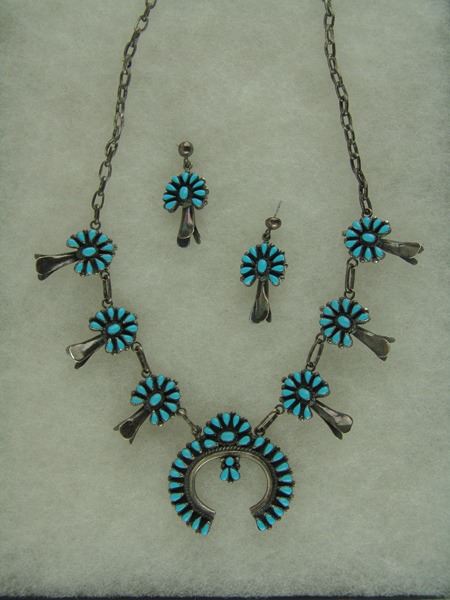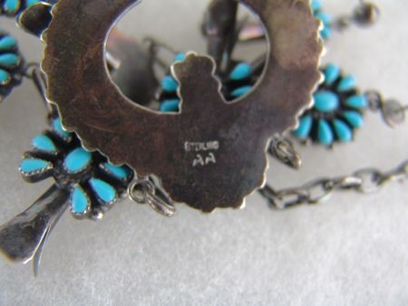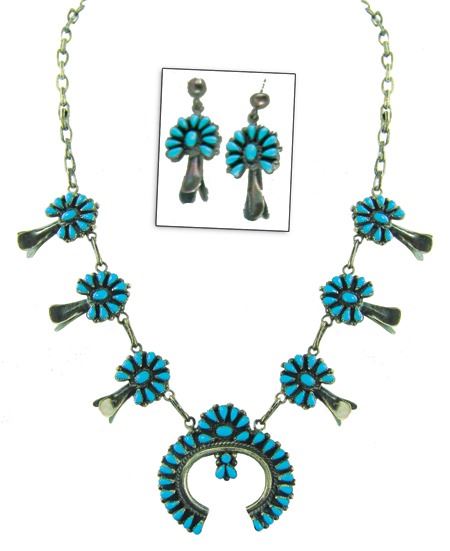 Late 1900s, Fine petite-sized all-silver cluster design necklace with traditional horseshoe naja, six blossom sections, plus matching blossom earrings, with a total of 110 matching blue turquoise stones. Very good condition. Signed "AA." 21" plus naja