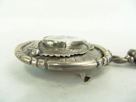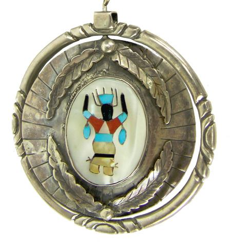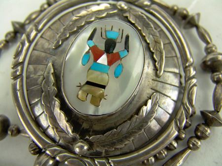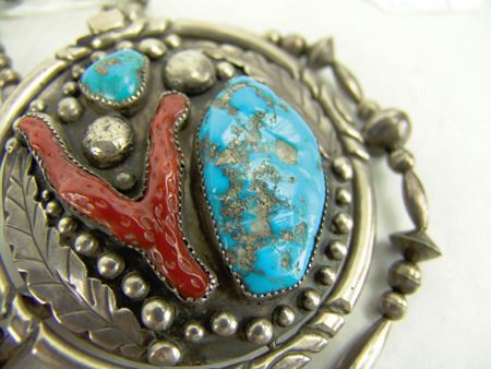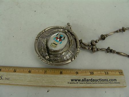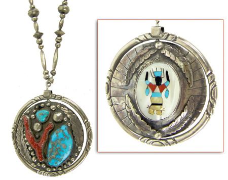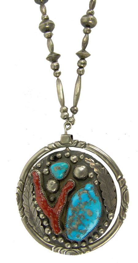 Ca. 1970s, One of a kind, two-sided heavy gauge all-silver "spinner necklace," one-side done with a Zuni inlay panel, the other in Navajo style with turquoise and coral, on silver beads. Very good condition. Unsigned. 3-1/4" dia.