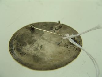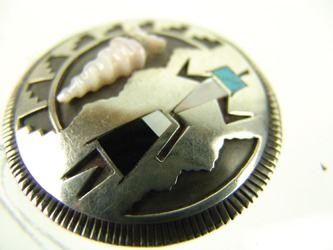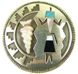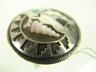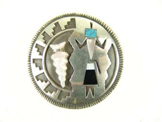 Fine, silver-on-silver overlay, round disk blouse pin or pendant, with basketry influenced design that includes a carved shell arrowhead, and a very fine, inlaid, Yei-Bei-Chai figure. Very good condition, signed "J". Mid/Late 1900s. 2-1/4"