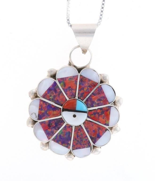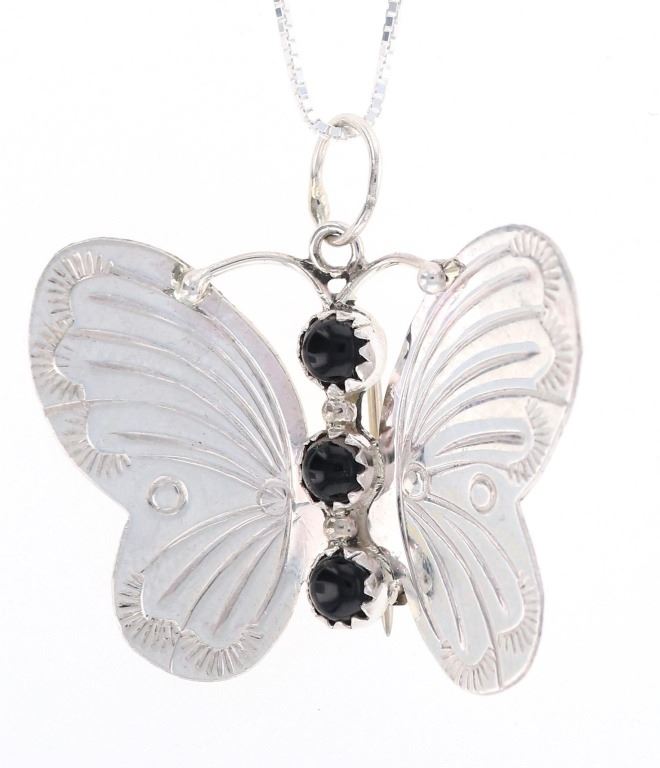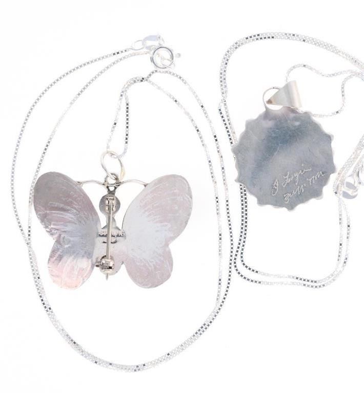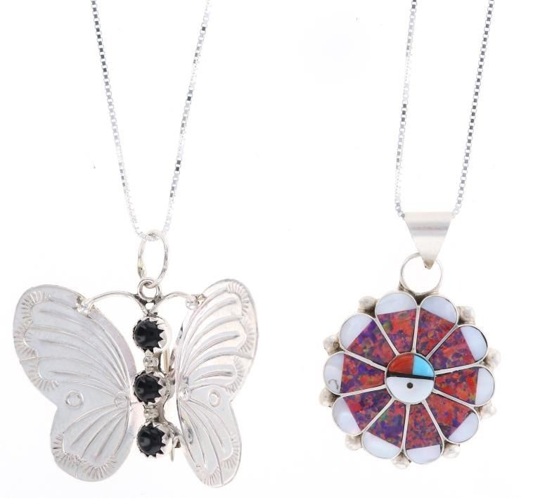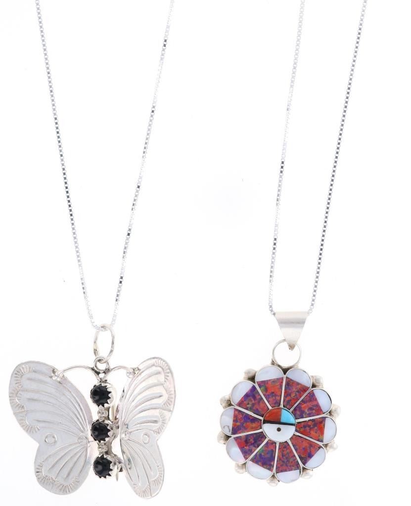Featured in this lot is this sterling silver multi stone necklaces from Navajo artist John Chavez and Zuni artist O. Login. There are two necklaces in this collection. The first is a wonderfully and professionally crafted sterling silver construction that features a lovely multi stone inlaid mosaic that features turquoise, red branch coral, mother of pearl, jet, and Morado purple opal cabochon set into the face of the pendant. The pendant is marked on the back 'O Login Zuni NM' and shows a '.925 Italy' mark on the clasp of the necklace. The second necklace is a wonderfully and professionally crafted sterling silver construction that features a butterfly design to the pendant and shows three total round jet cabochon set into the spine of the butterfly and shows a pin design to the backside of the pendant; the pendant is marked 'sterling' and shows a hallmark underneath of 'JJ' for John Chavez. The condition of this collection of necklaces is good with no obvious signs of damage and shows good overall condition. The measurements of these necklaces are 18" from clasp to clasp and the pendant measures 1 3/8" x 1" x 1/4, and the measurements of this necklace is 18" from clasp to clasp and the pendant measures 1 1/4" x 1 1/2" x 1/2". The collective weight of these necklaces is 12g.