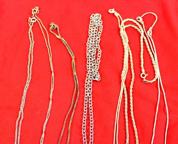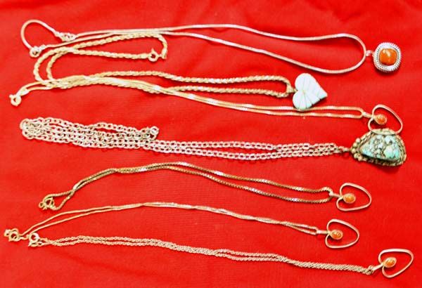Native American Navajo Zuni Turquoise Coral Sterling 7 Necklaces. Some are sterling silver. There is one Zuni necklace in this group - the silver channel inlay heart pendant on a 24'' Italian sterling chain. The other 6 necklaces are Navajo. Longest is the large turquoise nugget pendant necklace which is 24'' end to end. 4 necklaces have small coral stones in a heart shape pendant. The last necklace has a larger nugget and is not sterling.
