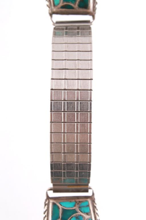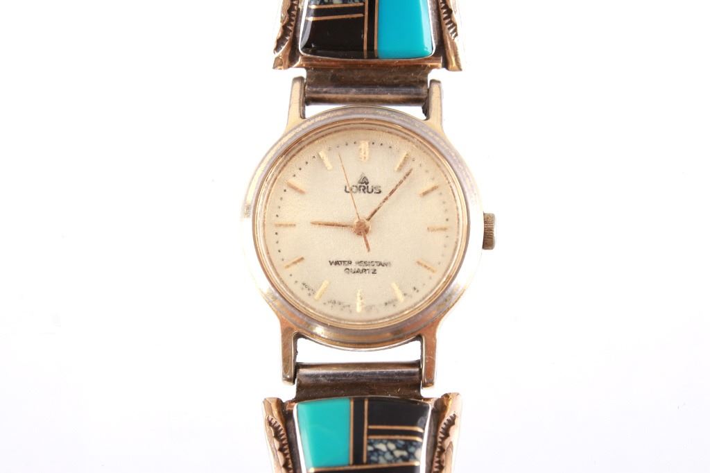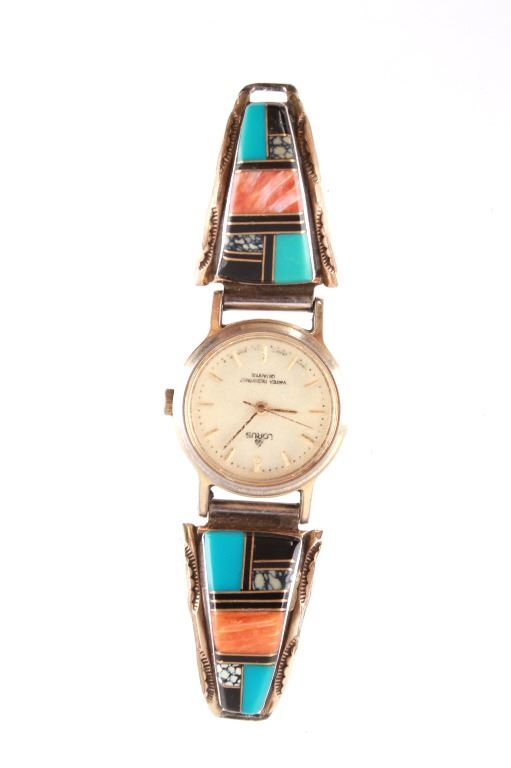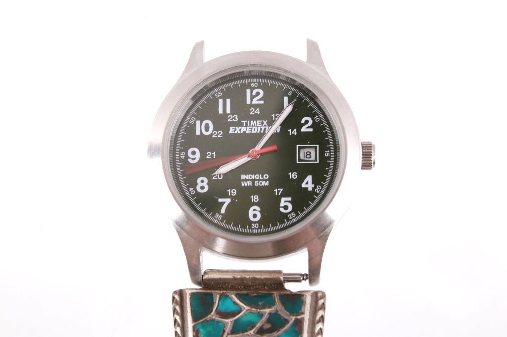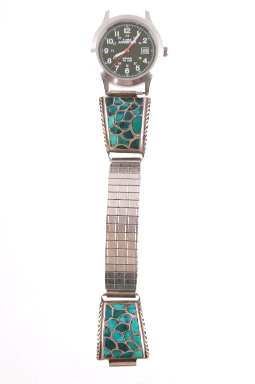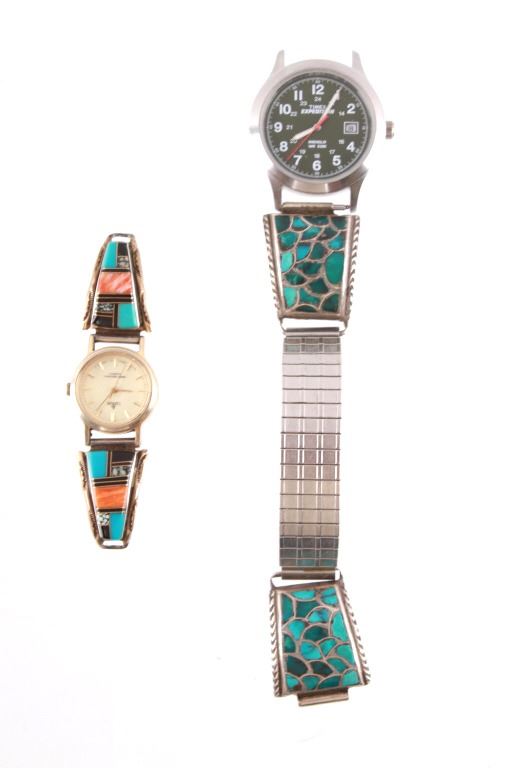 For your consideration in this lot are two watches with Navajo and Zuni turquoise inlay tabs. The first watch is a women's Lorus watch. The tabs on this watch have Zuni style inlayed turquoise, branch coral, onyx and snowflake obsidian. These stones are in various geometric shapes edged in silver with a frame that has sun burst stamps. These tabs are stamped on the back Sterling. The Lorus watch is currently running. This watch has no band between the tabs. The second watch is a TIMEX Expedition with a green face. The tabs are silver with turquoise chips in the "humming bird" style bordered by twisted silver rope. The tabs are connected with a Speidel band. One tab is missing a pin to attach it to the watch face. This watch is also currently running.