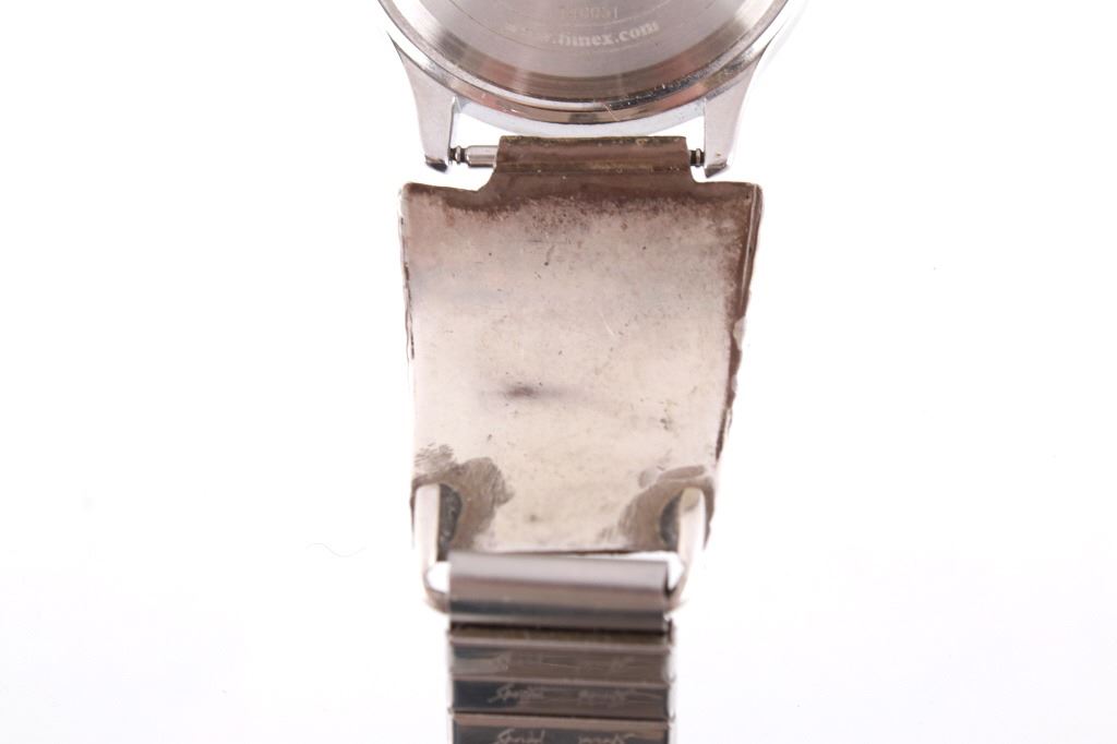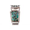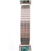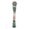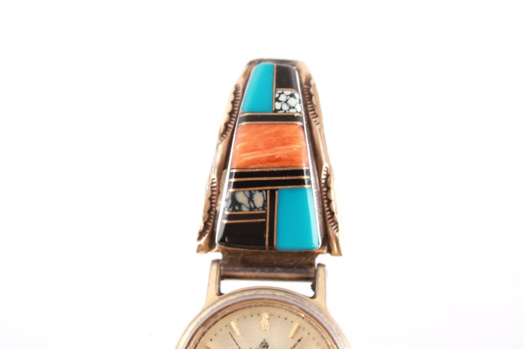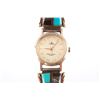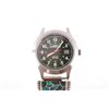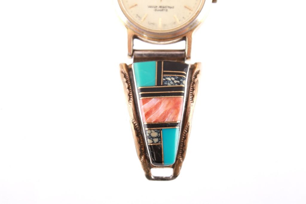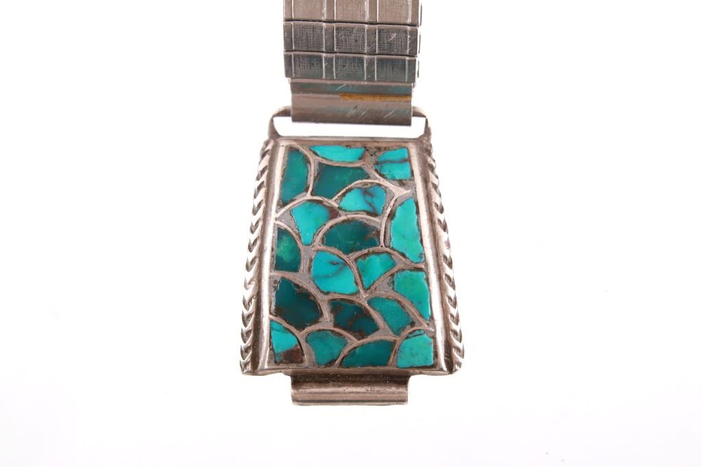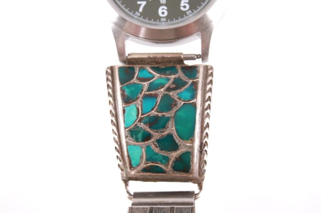 For your consideration in this lot are two watches with Navajo and Zuni turquoise inlay tabs. The first watch is a women's Lorus watch. The tabs on this watch have Zuni style inlayed turquoise, branch coral, onyx and snowflake obsidian. These stones are in various geometric shapes edged in silver with a frame that has sun burst stamps. These tabs are stamped on the back Sterling. The Lorus watch is currently running. This watch has no band between the tabs. The second watch is a TIMEX Expedition with a green face. The tabs are silver with turquoise chips in the "humming bird" style bordered by twisted silver rope. The tabs are connected with a Speidel band. One tab is missing a pin to attach it to the watch face. This watch is also currently running.