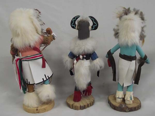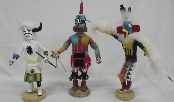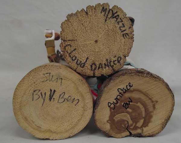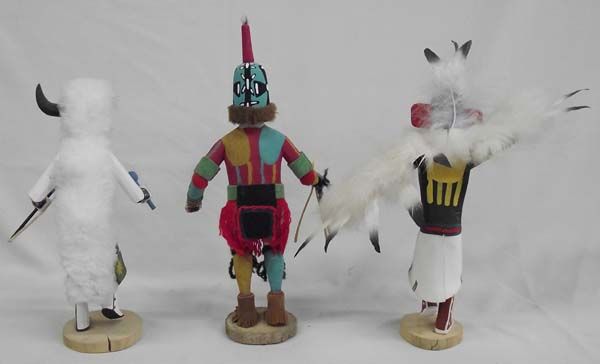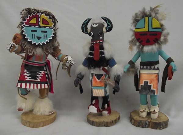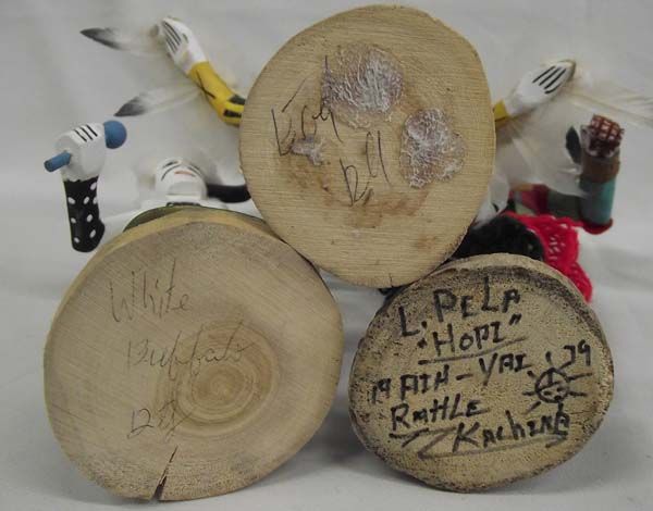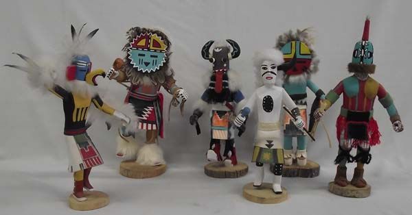 Native American Navajo and Hopi Kachinas. Six Kachinas in all. Includes a sun face Kachina signed on the bottom, ''By V Ben.'' It is the largest and measures 10''Hx6''W. There is another sunface Kachina signed on the bottom, ''BW.'' There is a Navajo ''Cloud Dancer'' (has horns with brown and turquoise paint) and signged on the bottom, ''M Yazzie.'' The ''White Buffalo'' Kachina is missing a horn. Another Hopi Kachina, with the turquoise mask is signed on the bottom, ''L Pela Hopi''. The last Kachina is the eagle.