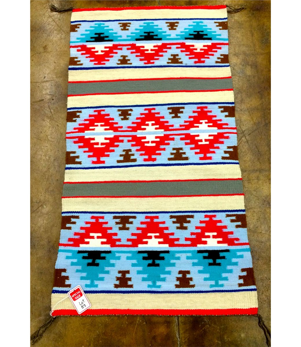 This brightly colored Navajo weaving was done by Cordelia Chatter (according to the previous owner). It measures approximately 23 ½” wide by 44 ½” long.