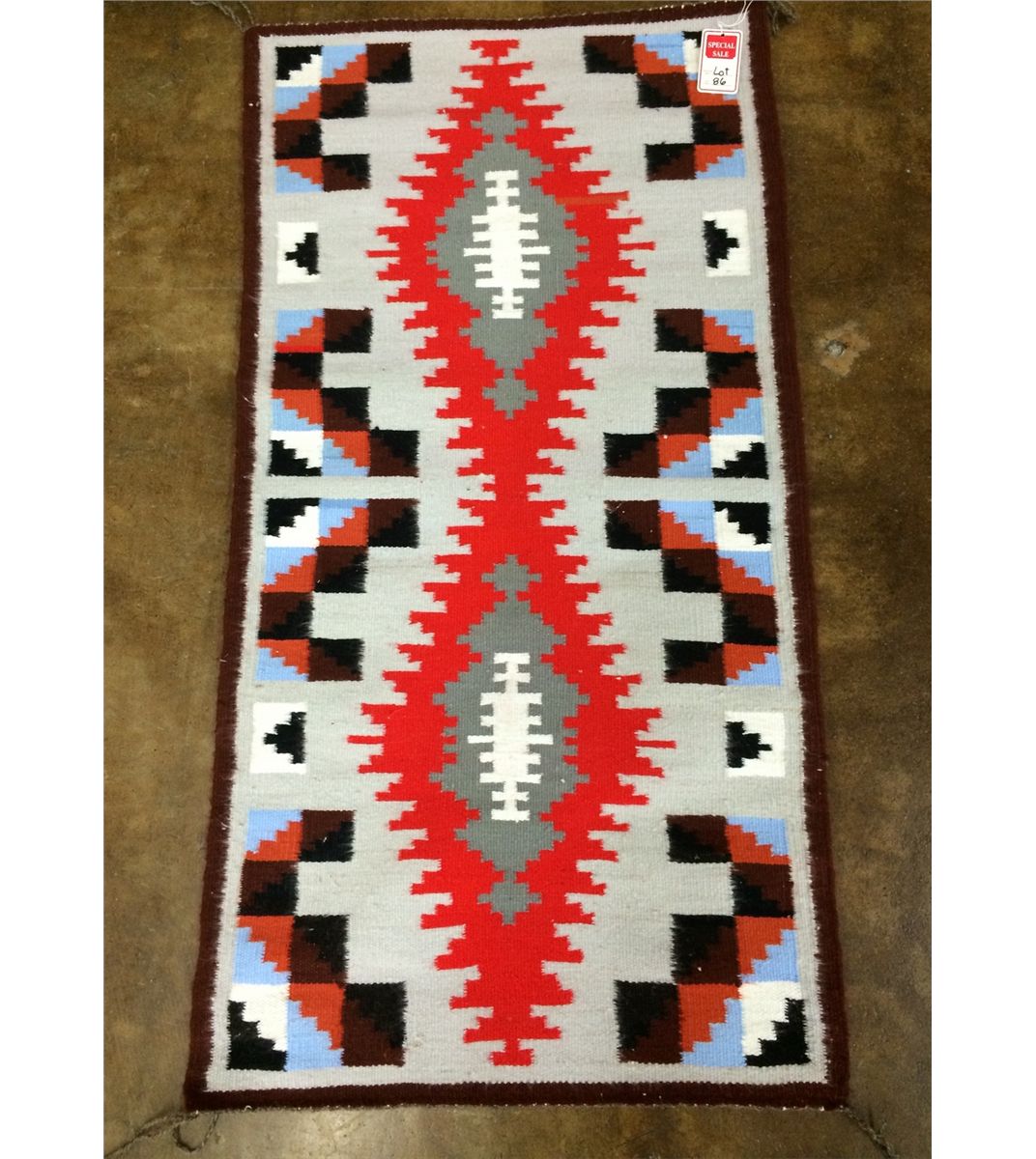 This brightly colored Navajo weaving was done by Cordelia Chatter (according to the previous owner). It measures approximately 22” wide by 44" long.