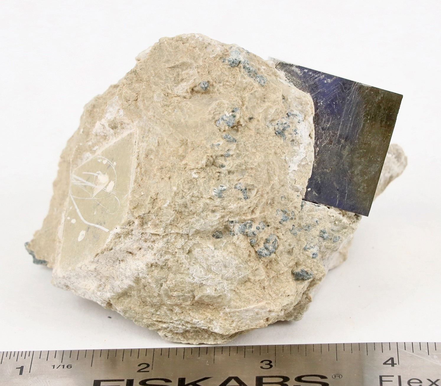 Large pyrite cube in matrix from Navajun, Spain. Near flawless. Cube about 1" square.