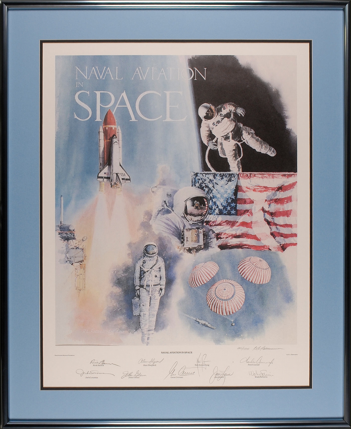 Color limited edition print titled ‘Naval Aviation in Space,’ 21.5 x 27, #343/1000, signed in pencil by nine astronauts, all former Naval aviators, representing all of NASA’s space programs. Signers are: Alan Shepard (first American in Space and Apollo 14 Commander/moonwalker), Neil Armstrong (Apollo 11 Commander and first moonwalker), Pete Conrad (Commander of Gemini, Apollo 12 moonwalker, and Skylab missions), Jack Lousma (Skylab astronaut), John Glenn (first American to orbit the earth), Gene Cernan (Commander of Apollo 17 and the "Last man on the Moon”), Jim Lovell (Commander of Apollo 8, the first flight to/around the moon), Wally Schirra (the only Mercury Astronaut to fly in the Mercury, Gemini, and Apollo programs), and Rick Hauck (Commander of the first shuttle flight after the Challenger tragedy), and also signed by the artist, R. L. Rasmussen. Double matted and framed to an overall size of 29.25 x 36. In fine condition. The signatures represent the first American in space, and the first American to orbit the earth, and the first and last men to walk on the moon. The nine astronauts who signed were part of a symposium held at the Naval Aviation Museum in 1989 and the print was originally issued as a fund-raiser.