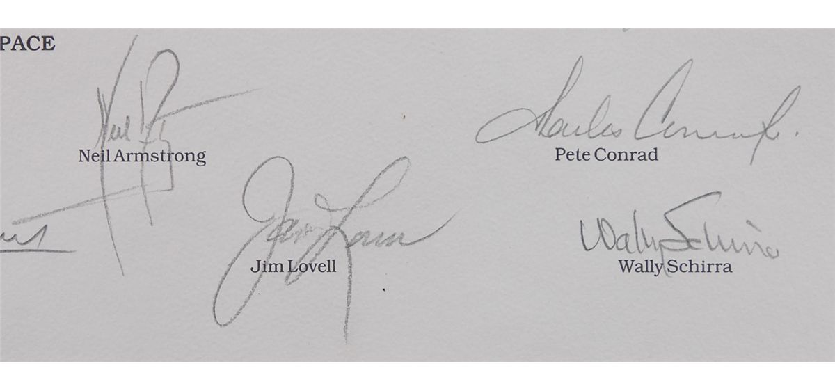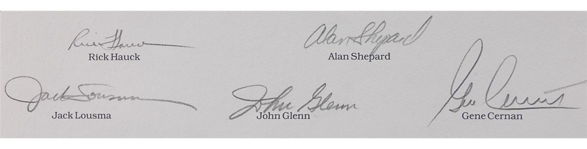 Color limited edition lithograph titled ‘Naval Aviation in Space,’ 25 x 30, numbered 613/1000, signed in the lower border in pencil by nine astronauts, all former Naval aviators. Signers are: Neil Armstrong, Alan Shepard, Charles Conrad, Jack Lousma, John Glenn, Gene Cernan, Jim Lovell, Wally Schirra, and Rick Hauck. Also signed in pencil by the artist, R. L. Rasmussen. In fine condition. The signatures represent all of NASA’s space programs, and include the first American in space, the first American to orbit the earth, and the first and last men to walk on the moon. The nine astronauts who signed were part of a symposium held at the Naval Aviation Museum in 1989 and the print was originally issued as a fund-raiser.