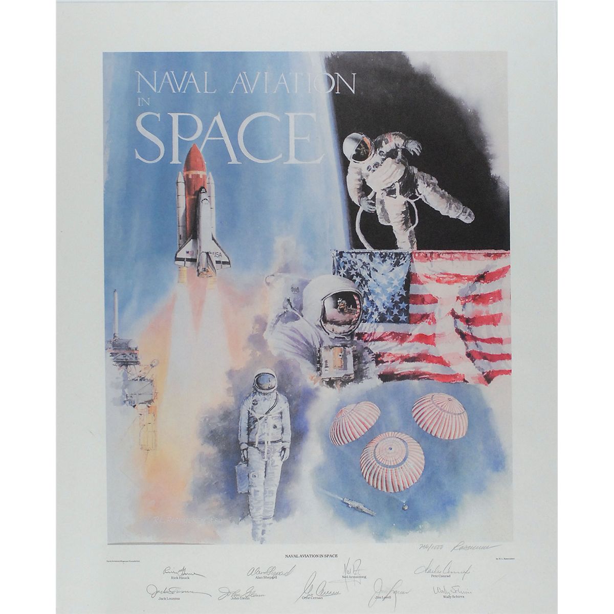 Color limited edition lithograph titled ‘Naval Aviation in Space,’ 25 x 30, numbered 736/1000, signed in the lower border in pencil by nine astronauts, all former naval aviators. Signers are: Neil Armstrong, Alan Shepard, Charles Conrad, Jack Lousma, John Glenn, Gene Cernan, Jim Lovell, Wally Schirra, and Rick Hauck. Also signed in pencil by the artist, R. L. Rasmussen. Rolled and in very fine condition. The signatures represent all of NASA’s space programs, and include the first American in space, the first American to orbit Earth, and the first and last men to walk on the moon. The nine astronauts who signed were part of a symposium held at the Naval Aviation Museum in 1989 and the print was originally issued as a fund-raiser.