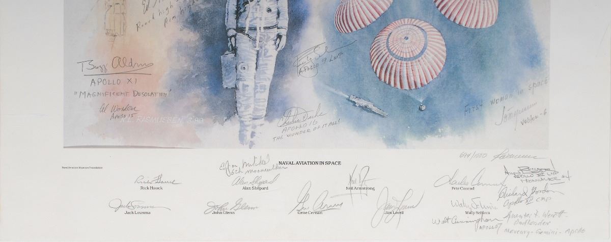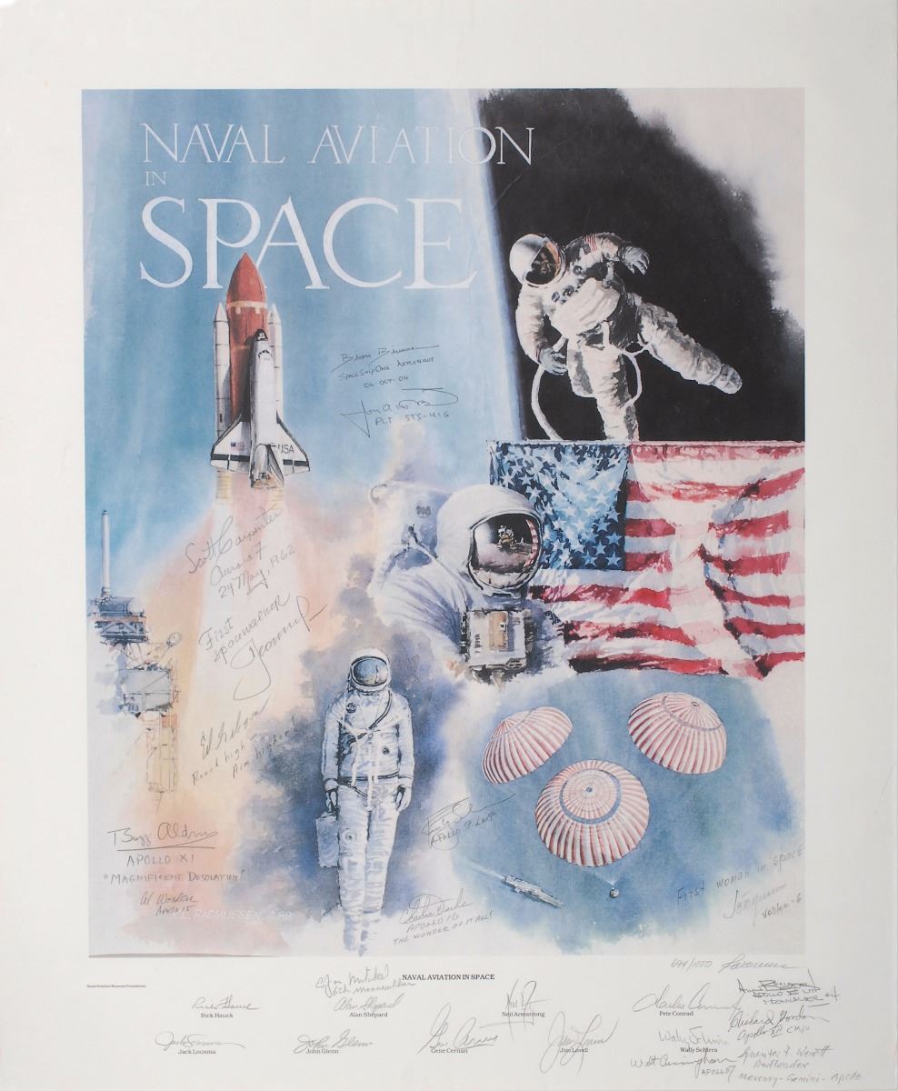 Color limited edition 25 x 30 print entitled ‘Naval Aviation in Space,’ numbered 694/1000, signed in pencil in the lower border by the original nine astronauts: Rick Hauck, Alan Shepard, Neil Armstrong, Charles Conrad Jr., Jack Lousma, John Glenn, Gene Cernan, James Lovell, and Wally Schirra. The print is also signed in pencil by an additional 15 astronauts and cosmonauts, obtained over the course of several years. Signers include: "Brian Binnie, SpaceShipOne Astronaut 04-Oct-04”; "Jon A McBride, Plt STS-41G”; "Scott Carpenter, Aurora 7 24 May, 1962”; "First Spacewalker Alexei Leonov”; "Ed Gibson Reach high—Aim higher!”; "Buzz Aldrin Apollo XI 'Magnificent Desolation’”; "Al Worden Apollo 15”; "Rusty Schweickart Apollo 9 LMP”; "Charlie Duke Apollo 16, The Wonder of it All!”; "Edgar Mitchell, 6th Moonwalker”; "First Woman in Space, Valentina Tereshkova Vostok 6”; "Alan Bean Apollo XII LMP, Moonwalker #4”; "Richard Gordon Apollo XII CMP”; "Walt Cunningham Apollo 7”; and "Guenter F. Wendt Pad Leader, Mercury—Gemini—Apollo.” Also signed by the artist, R. L. Rasmussen. Rolled and in fine condition, with light creasing to borders. A rare combination of signatures.