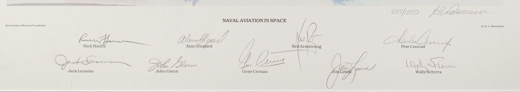 Limited edition color 22 x 28.5 print entitled ‘Naval Aviation in Space,’ numbered 537/1000, signed in pencil in the lower border by the original nine astronauts: Rick Hauck, Alan Shepard, Neil Armstrong, Charles Conrad, Jack Lousma, John Glenn, Gene Cernan, James Lovell, and Wally Schirra. Also signed by the artist, R. L. Rasmussen. Patriotically matted and framed to an overall size of 27.75 x 34. In fine condition. The signatures represent all of NASA's space programs, and include the first American in space, the first American to orbit the earth, and the first and last men to walk on the moon. The nine astronauts who signed were part of a symposium held at the Naval Aviation Museum in 1989 and the print was originally issued as a fundraiser.