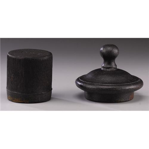 <B>Naval Inspector Marked Tompion for 3 Inch Gun.</B></I> Cast iron cap with wooden plug, 6.5” long, marked on the base of the wooden plug with an anchor and “US”, inspector's mark “P.L.E.”, and “3” to designate the intended size of gun. The tampion shows little, if any, wear. In fine condition. <BR><BR><b>Shipping:</b> Miscellaneous Collectibles, Smal (<a target="_blank" href="http://www.heritageauctions.com/common/shipping.php">view shipping information</a>)