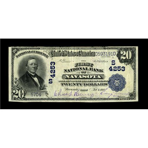 <B>Navasota, TX</B></I> - $20 1902 Plain Back Fr. 653 <B>The First NB</B></I> Ch. # (S)4253<BR>An attractive large example which is one of the nicest notes listed in the census from this Grimes County community. Bright <B>Very Fine</B></I> with sharp purple signatures, ex-Jack Everson collection.<BR><BR><b>Shipping:</b> Coin/Currency (<a target="_blank" href="http://www.heritageauctions.com/common/shipping.php">view shipping information</a>)