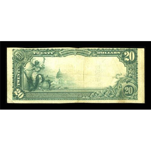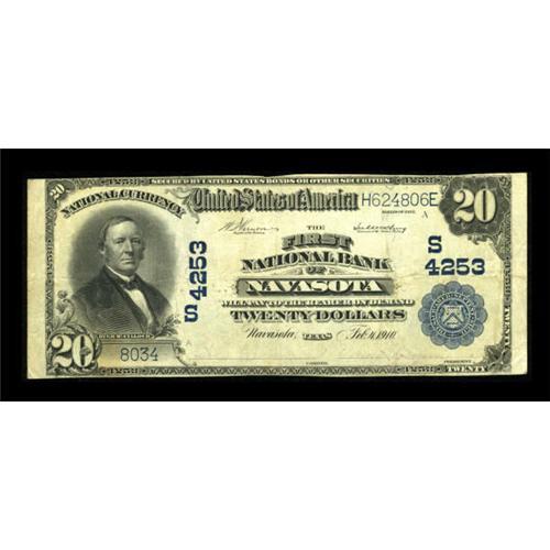 <B>Navasota, TX</B></I> - $20 1902 Plain Back Fr. 653 <B>The First NB</B></I> Ch. # (S)4253<BR> This is an evenly circulated $20 that has traces of the purple stamped signature of the president remaining. <B>Fine</B></I>.<BR><BR><b>Shipping:</b> Coins & Currency (<a target="_blank" href="http://www.heritageauctions.com/common/shipping.php">view shipping information</a>)