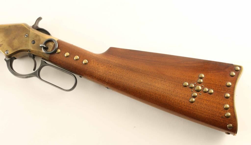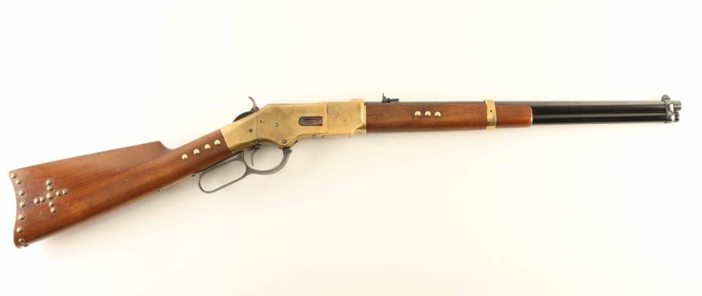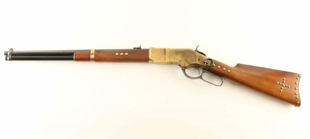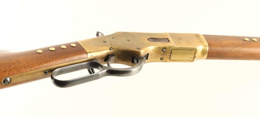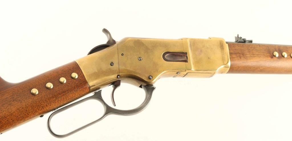 Rifle. Lever-Action. Italian made copy of the 1866 yellow boy carbine for Navy Arms. 19" round barrel, with front blade, and flip notch rear sights. Brass 2-piece frame, with saddle ring. Fed from a tube magazine. Oil finished Italian walnut stock, and forearm. Brass buttplate. Brass tacks have been added to wood . Bore appears excellent/bright. Action is crisp/tight. Blued barrel, and tube are about 98%, with minor scratches. Brass frame is tarnished, with minor scratches. Wood is very good, with minor scratches. NRA Condition-Very Good. Modern Firearm.