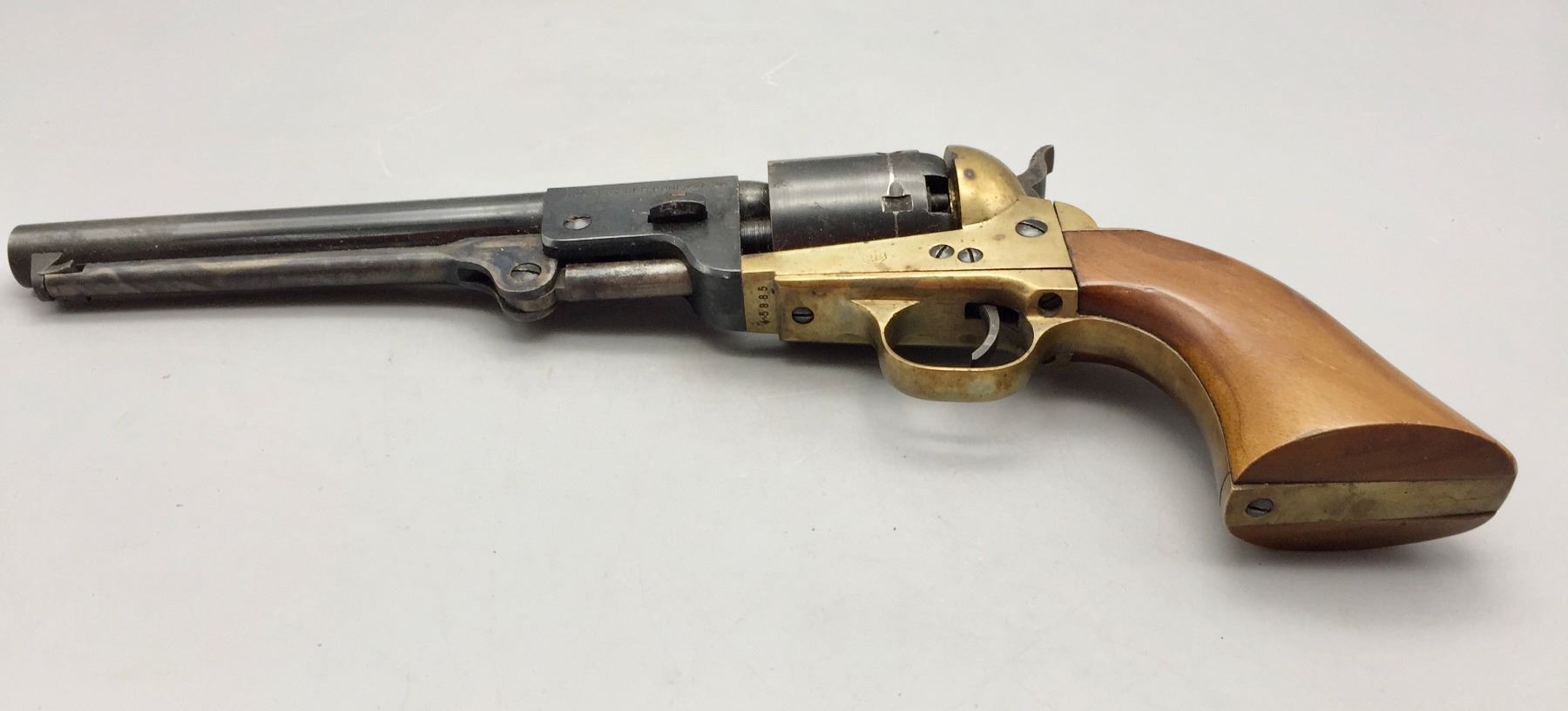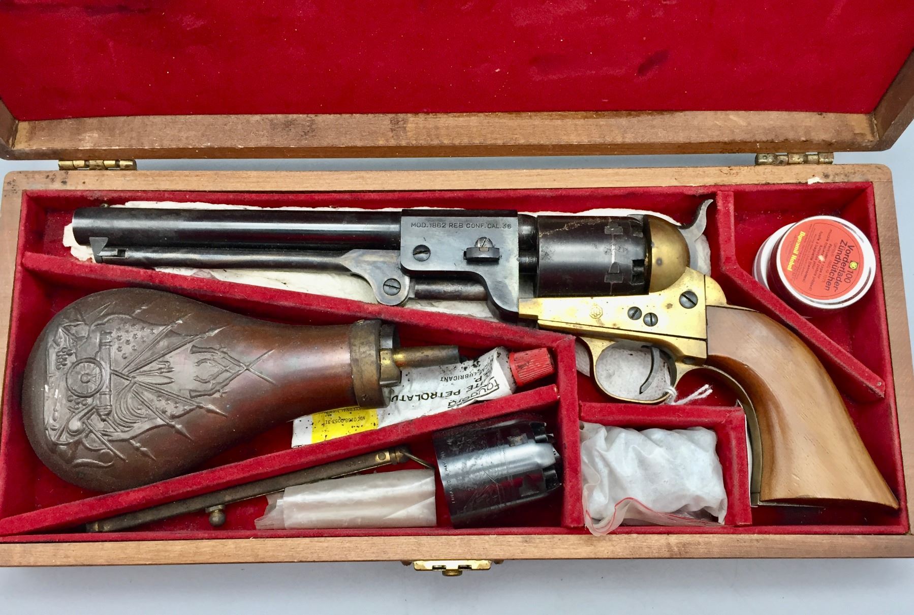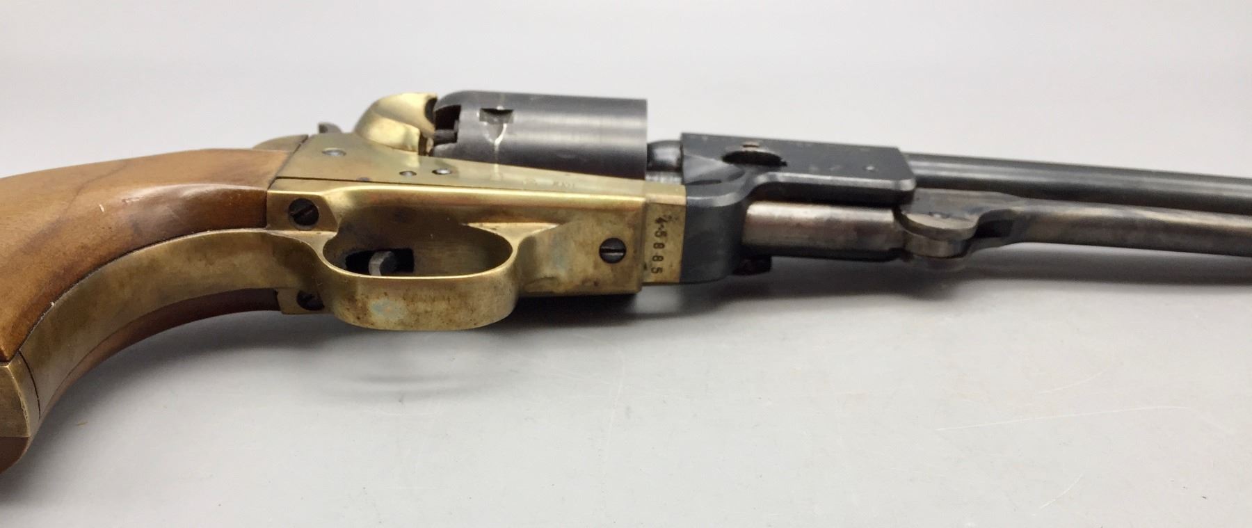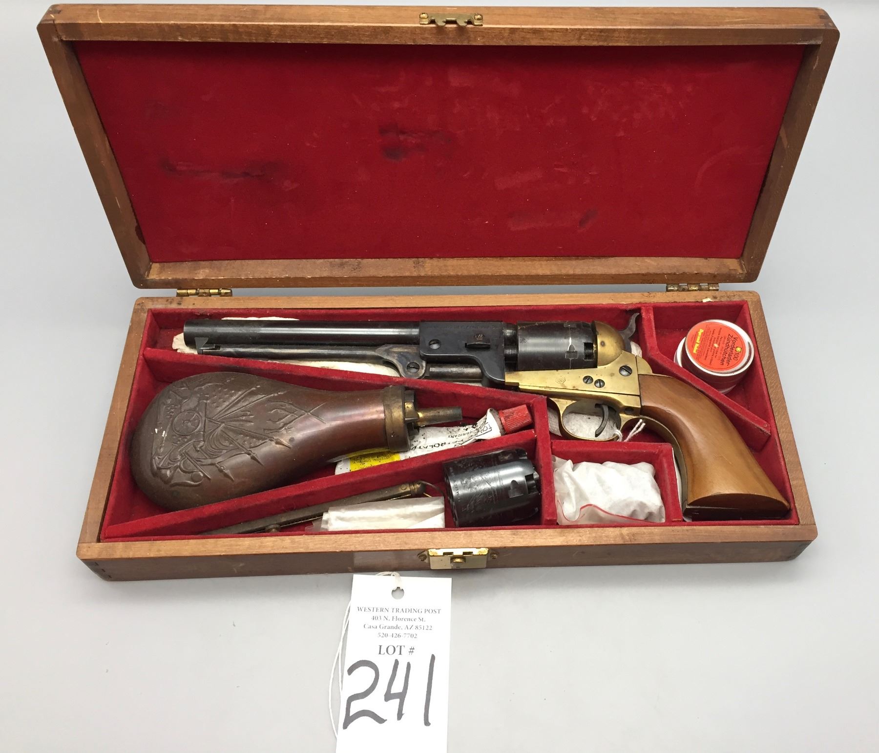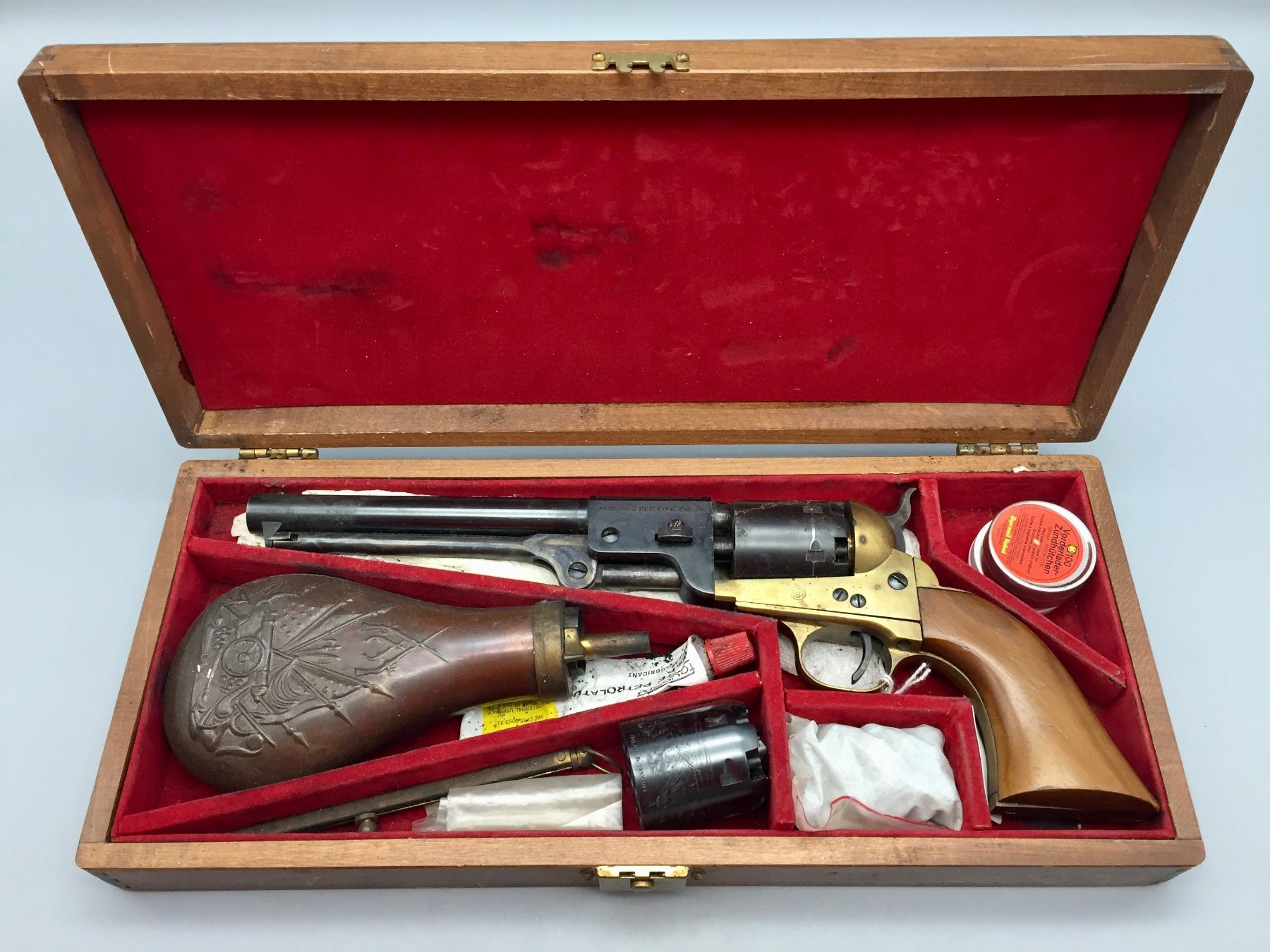 Description: For your enjoyment we offer for sale this Navy Arms .36 caliber pistol with nice wooden box and many accessories. Ready to go, take a look! Maker: Navy Arms Co., Ridgefield, NJ. Approx. Age: Modern reproduction of the Navy, .36 cal. pistol. Size: Barrel measures 7-3/8” with an overall length of 14”. Box measures 14-1/2”w x 6-1/4” tall x 2-1/4” deep. Condition: Pretty good for their age, normal wear expected. Please look closely at the pictures - they are an important part of our description. Shipping: There will be a $10 handling / packaging fee for shipping this lot. The actual cost of postage will be added on top of that. ***Black Powder - This firearm DOES NOT REQUIRE an FFL Transfer***