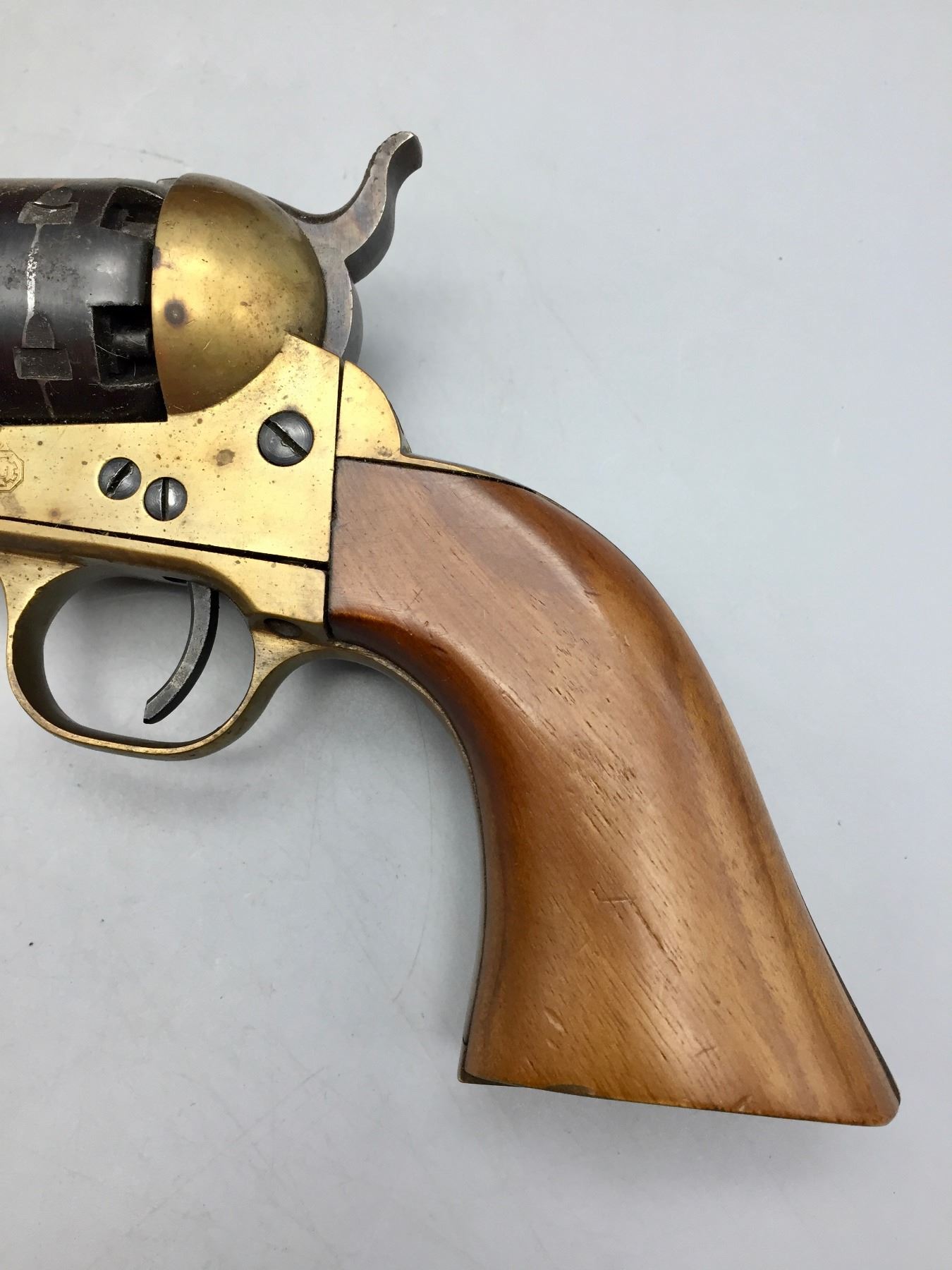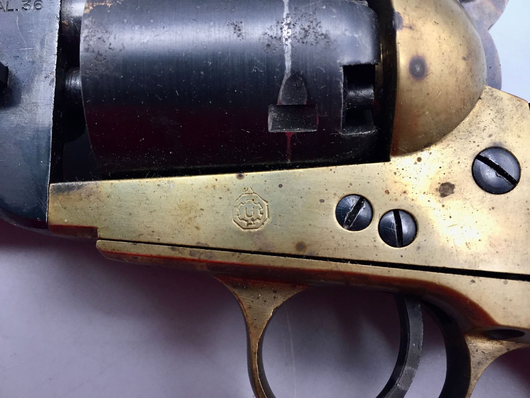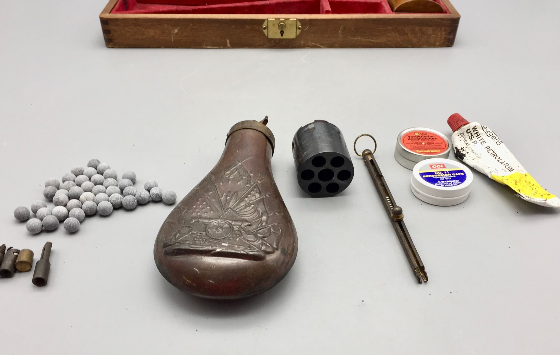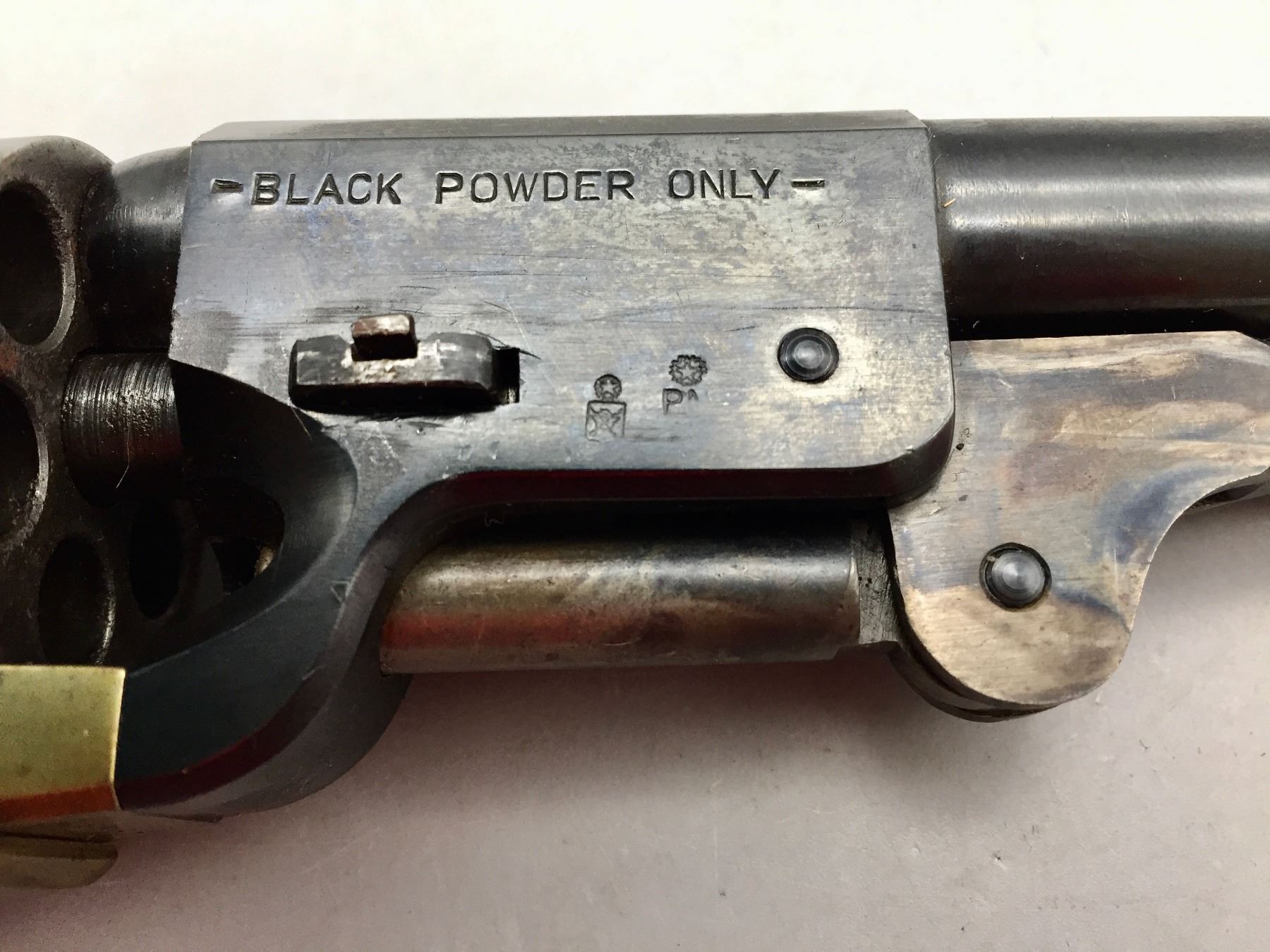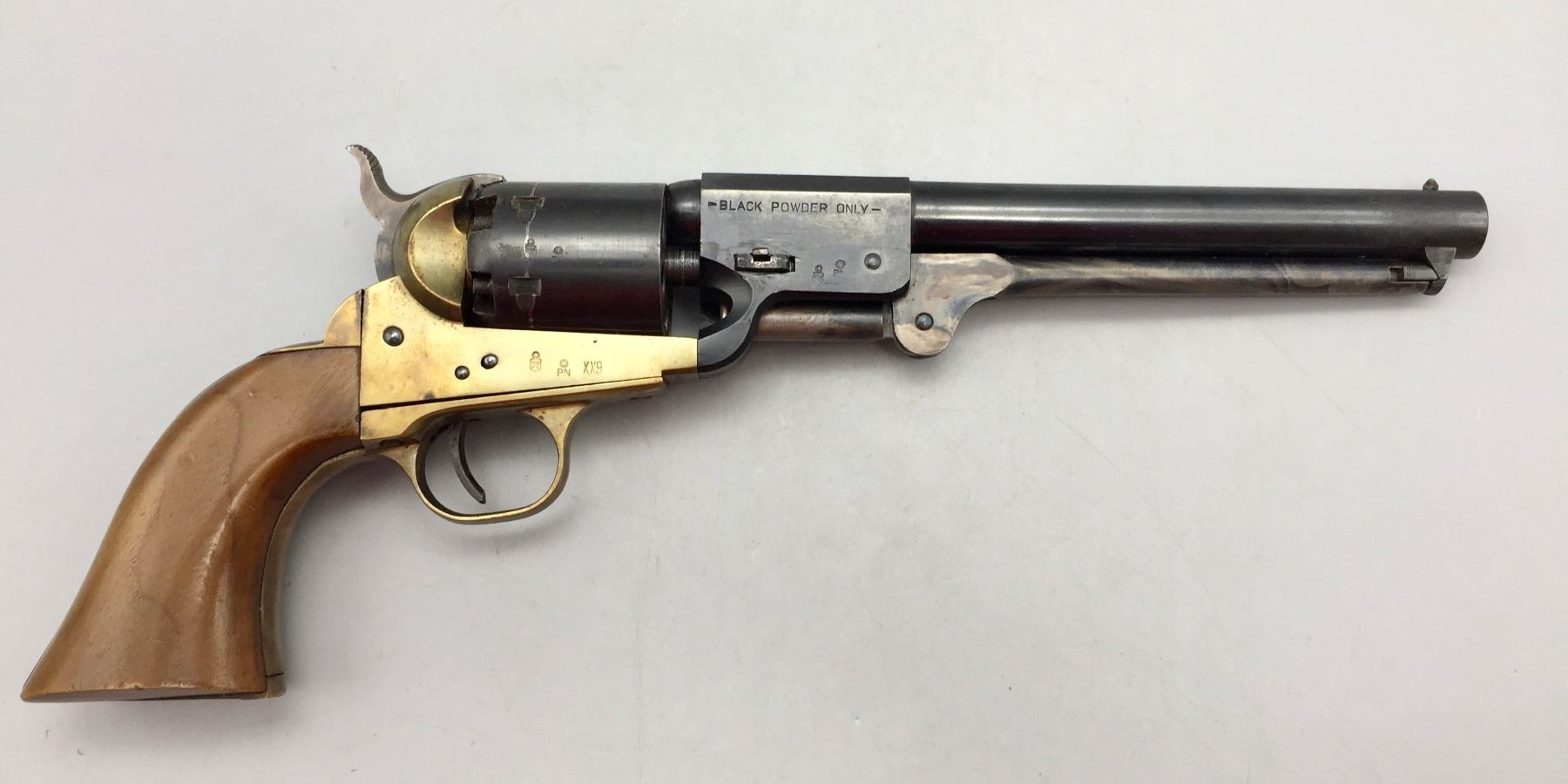 Description: For your enjoyment we offer for sale this Navy Arms .36 caliber pistol with nice wooden box and many accessories. Ready to go, take a look! Maker: Navy Arms Co., Ridgefield, NJ. Approx. Age: Modern reproduction of the Navy, .36 cal. pistol. Size: Barrel measures 7-3/8” with an overall length of 14”. Box measures 14-1/2”w x 6-1/4” tall x 2-1/4” deep. Condition: Pretty good for their age, normal wear expected. Please look closely at the pictures - they are an important part of our description. Shipping: There will be a $10 handling / packaging fee for shipping this lot. The actual cost of postage will be added on top of that. ***Black Powder - This firearm DOES NOT REQUIRE an FFL Transfer***