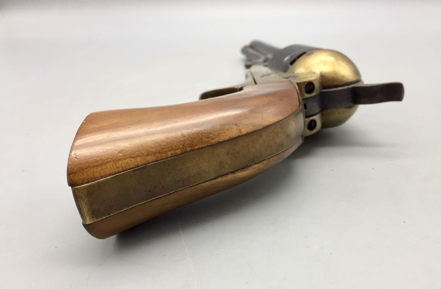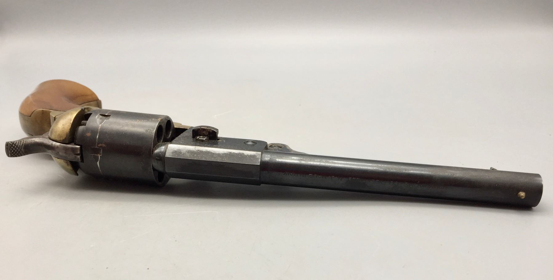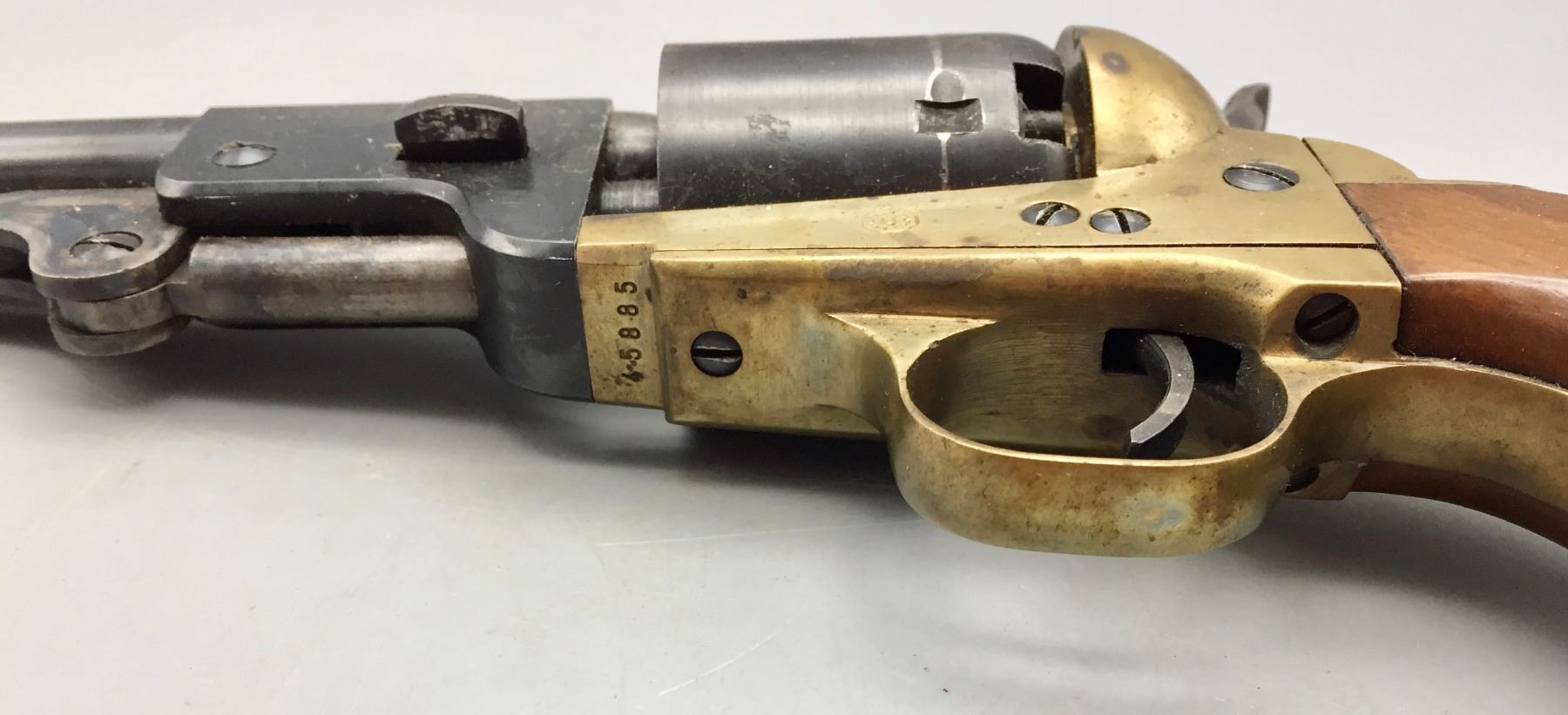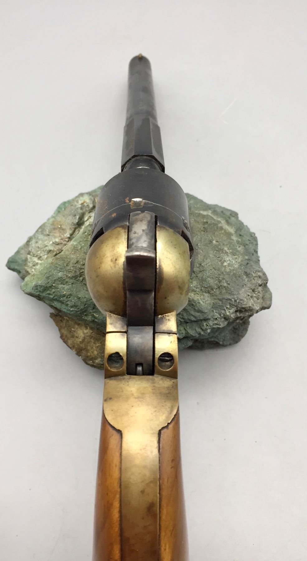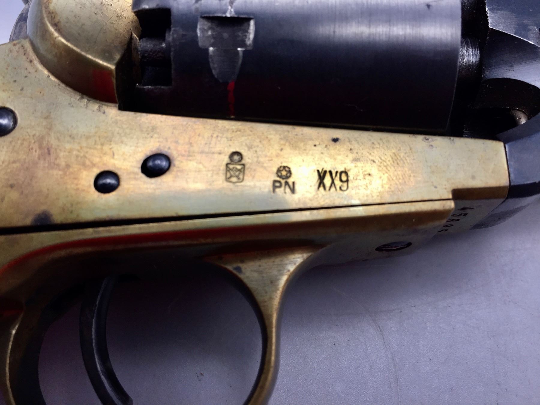 Description: For your enjoyment we offer for sale this Navy Arms .36 caliber pistol with nice wooden box and many accessories. Ready to go, take a look! Maker: Navy Arms Co., Ridgefield, NJ. Approx. Age: Modern reproduction of the Navy, .36 cal. pistol. Size: Barrel measures 7-3/8” with an overall length of 14”. Box measures 14-1/2”w x 6-1/4” tall x 2-1/4” deep. Condition: Pretty good for their age, normal wear expected. Please look closely at the pictures - they are an important part of our description. Shipping: There will be a $10 handling / packaging fee for shipping this lot. The actual cost of postage will be added on top of that. ***Black Powder - This firearm DOES NOT REQUIRE an FFL Transfer***