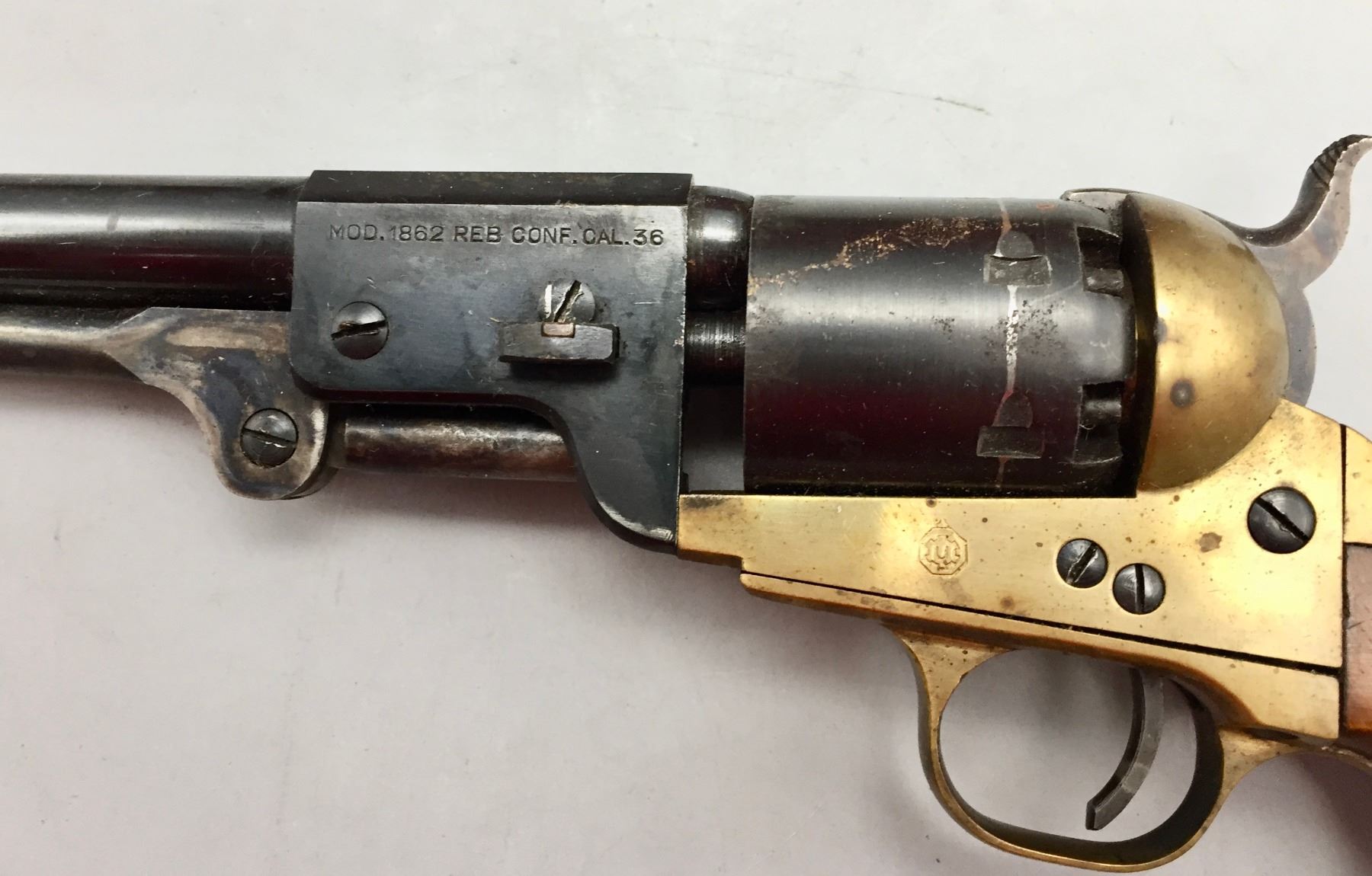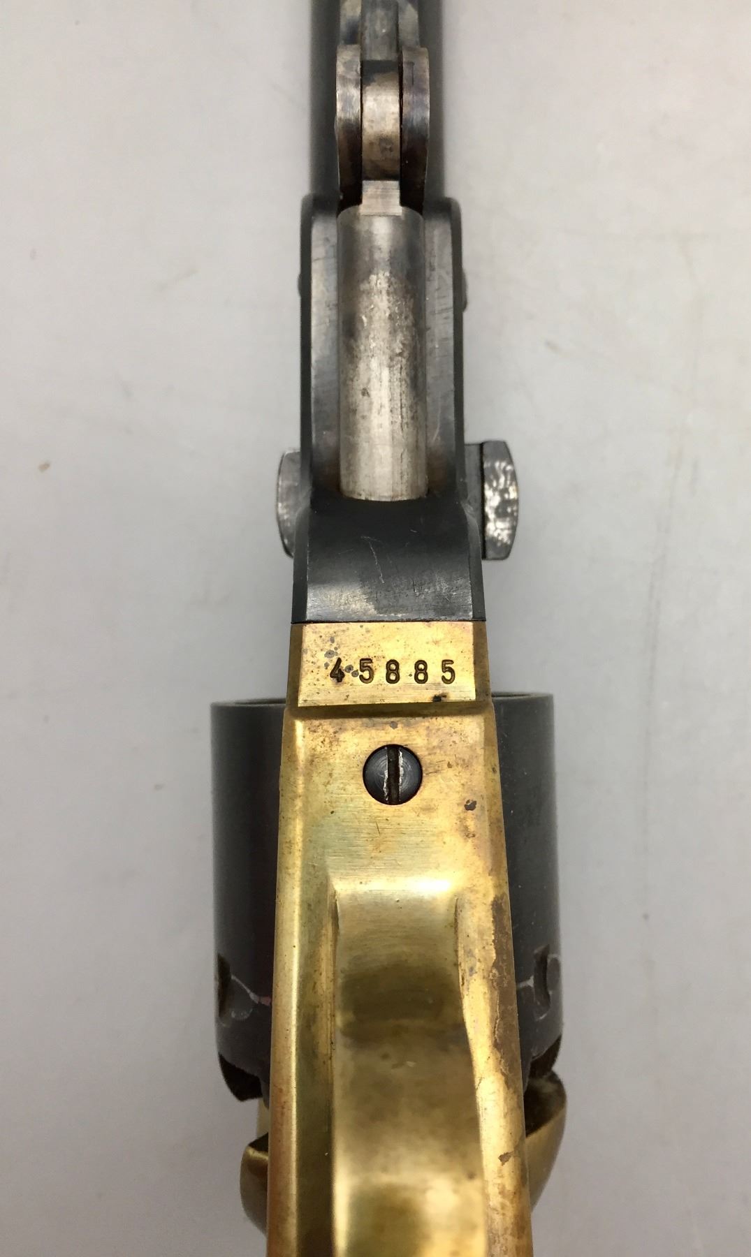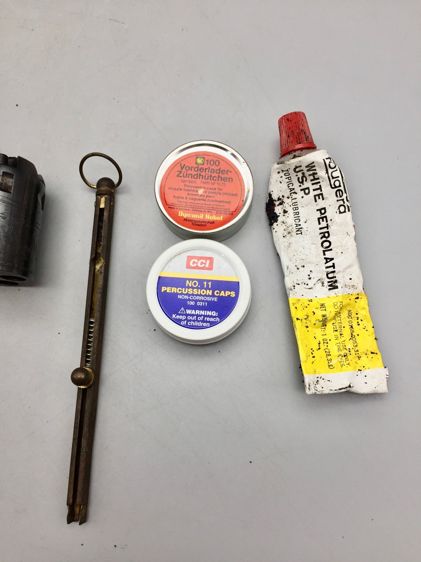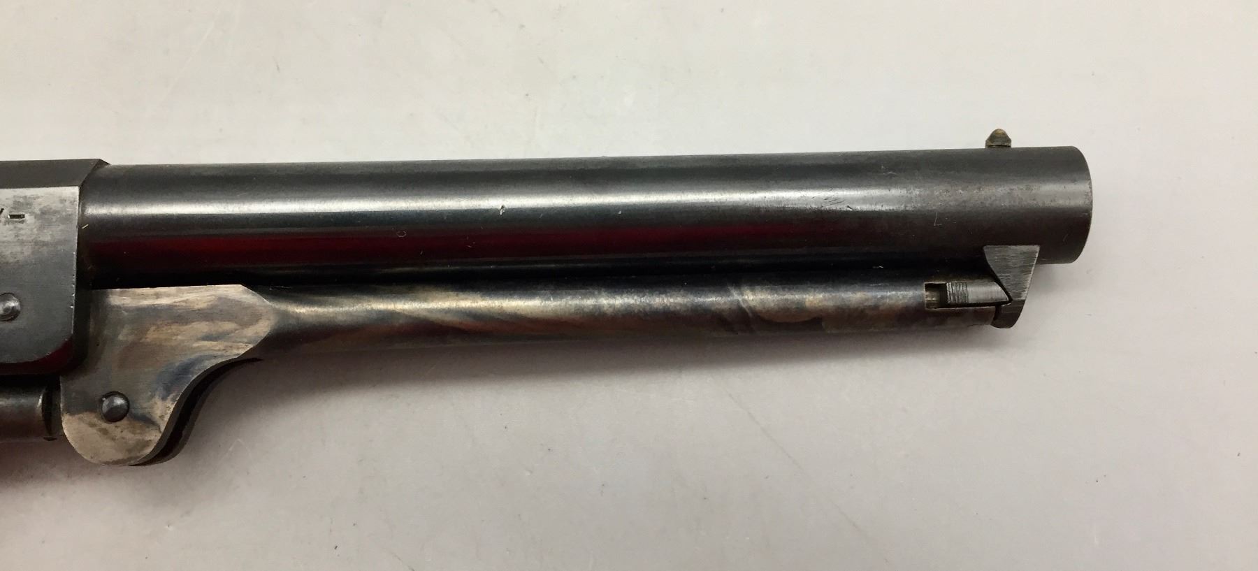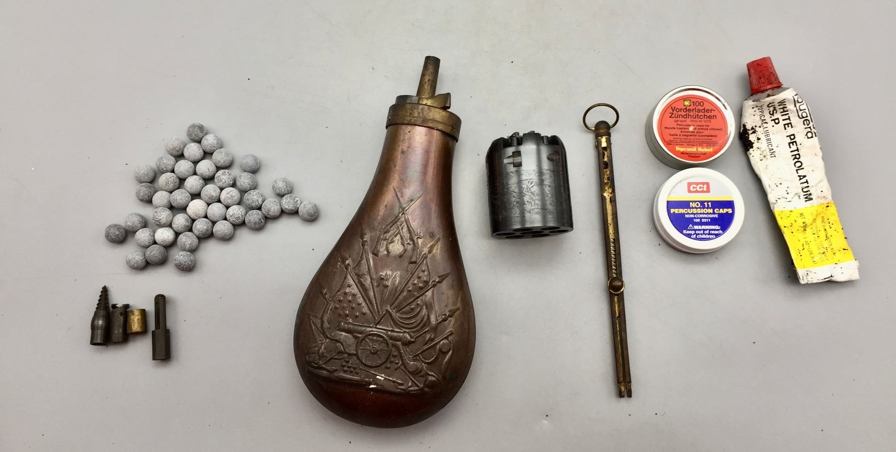 Description: For your enjoyment we offer for sale this Navy Arms .36 caliber pistol with nice wooden box and many accessories. Ready to go, take a look! Maker: Navy Arms Co., Ridgefield, NJ. Approx. Age: Modern reproduction of the Navy, .36 cal. pistol. Size: Barrel measures 7-3/8” with an overall length of 14”. Box measures 14-1/2”w x 6-1/4” tall x 2-1/4” deep. Condition: Pretty good for their age, normal wear expected. Please look closely at the pictures - they are an important part of our description. Shipping: There will be a $10 handling / packaging fee for shipping this lot. The actual cost of postage will be added on top of that. ***Black Powder - This firearm DOES NOT REQUIRE an FFL Transfer***