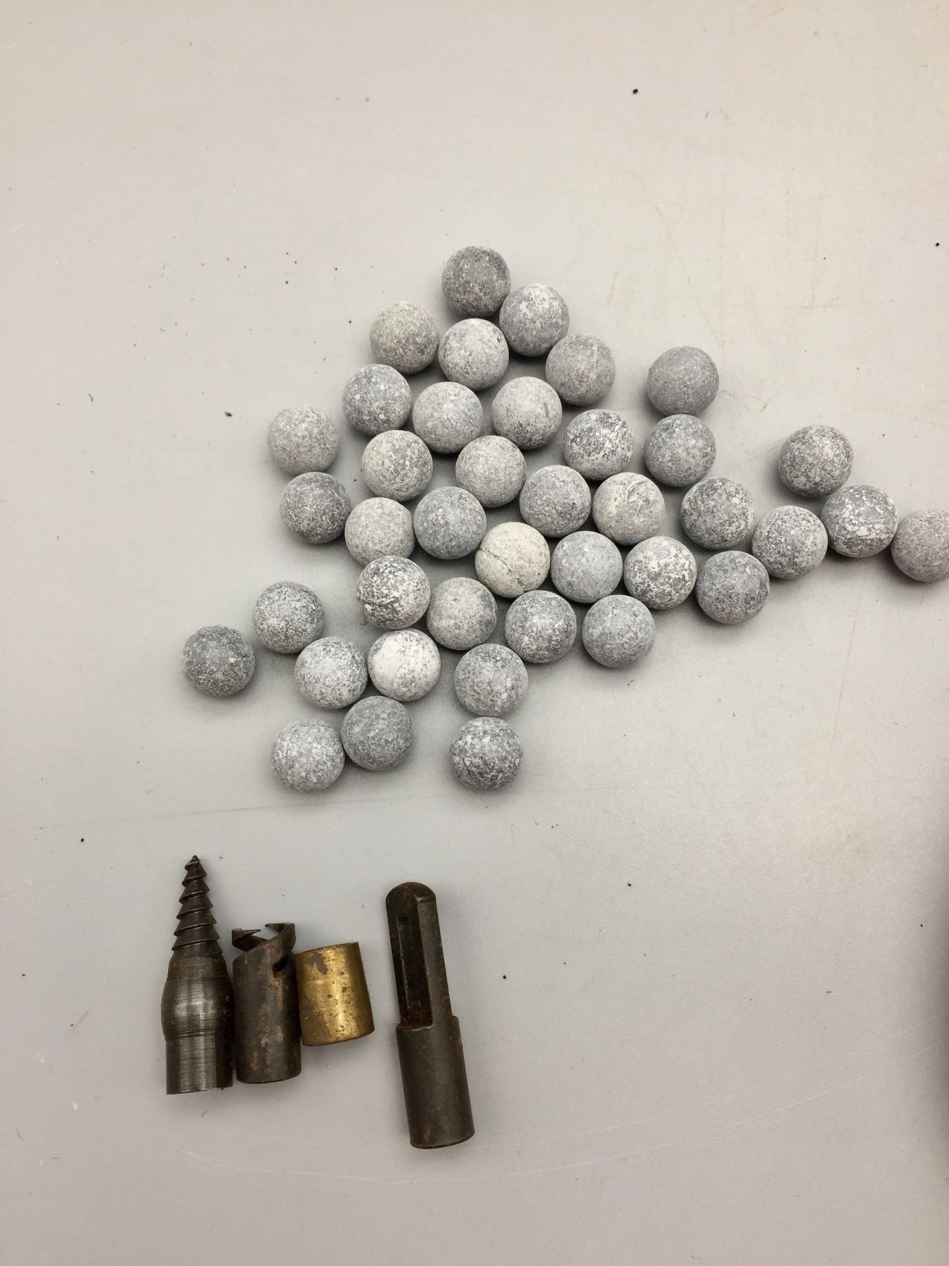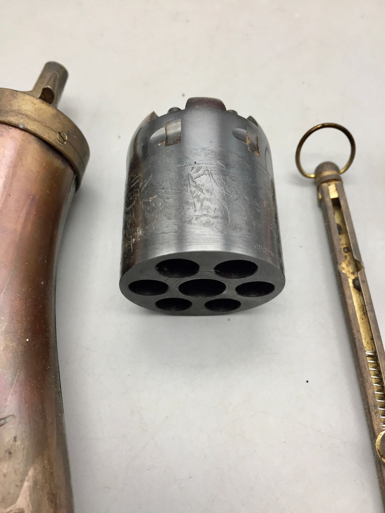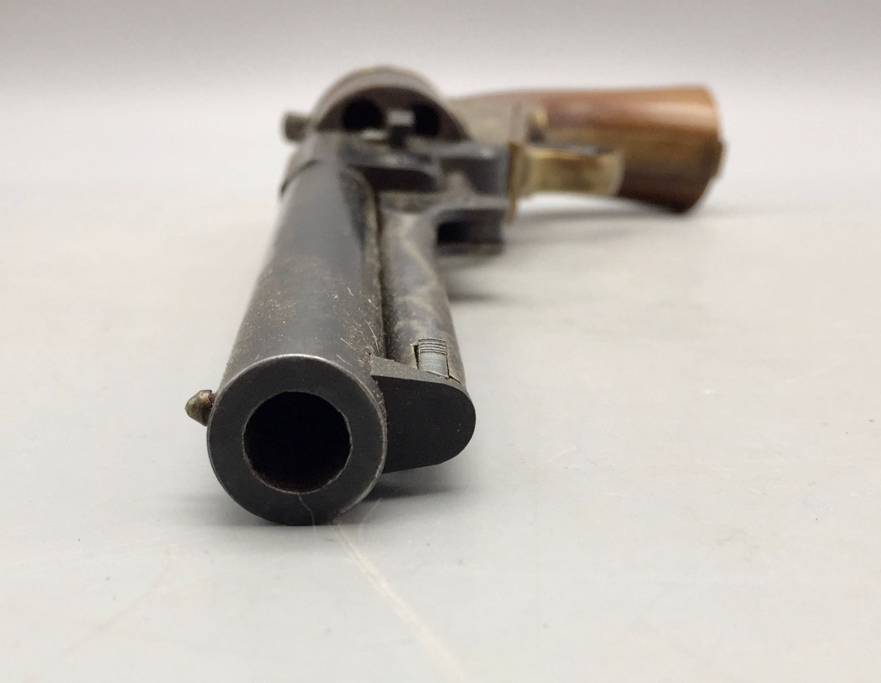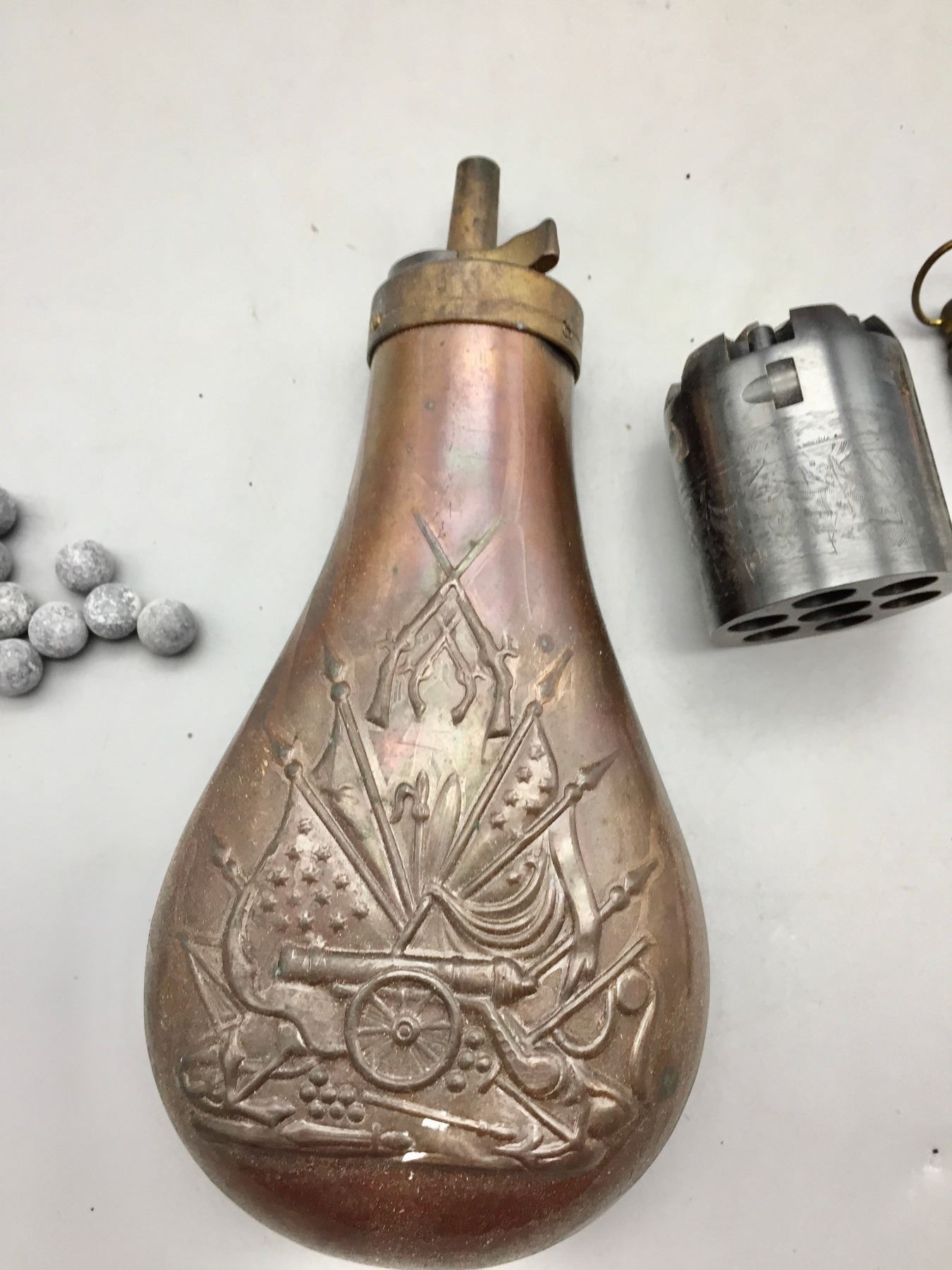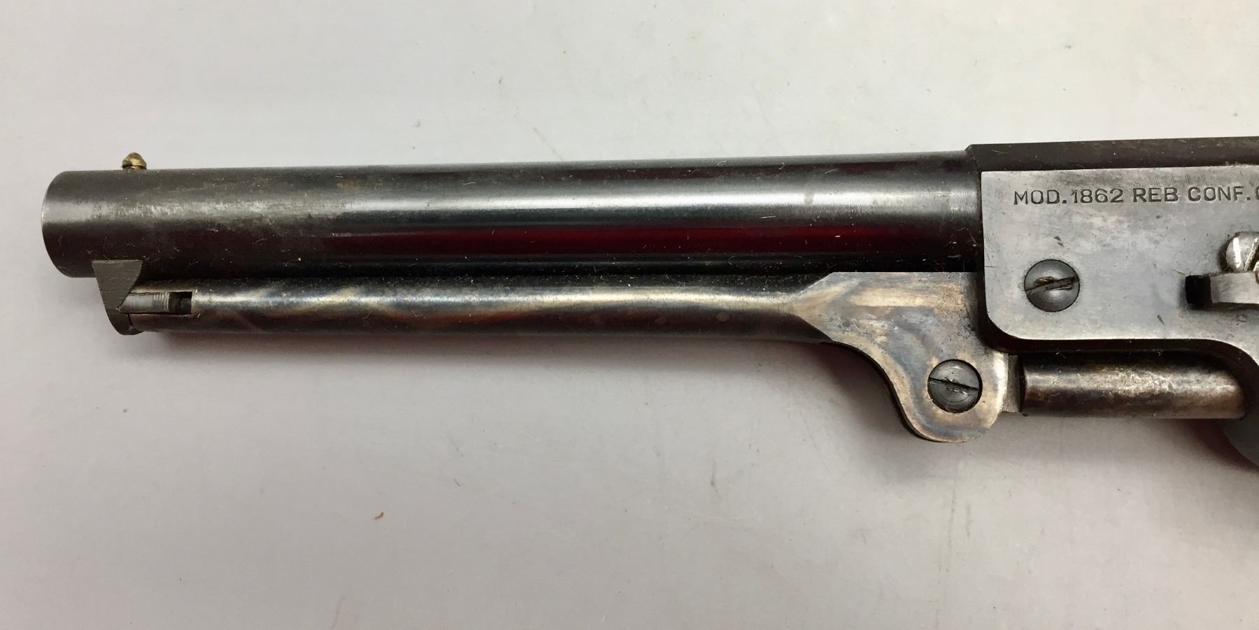 Description: For your enjoyment we offer for sale this Navy Arms .36 caliber pistol with nice wooden box and many accessories. Ready to go, take a look! Maker: Navy Arms Co., Ridgefield, NJ. Approx. Age: Modern reproduction of the Navy, .36 cal. pistol. Size: Barrel measures 7-3/8” with an overall length of 14”. Box measures 14-1/2”w x 6-1/4” tall x 2-1/4” deep. Condition: Pretty good for their age, normal wear expected. Please look closely at the pictures - they are an important part of our description. Shipping: There will be a $10 handling / packaging fee for shipping this lot. The actual cost of postage will be added on top of that. ***Black Powder - This firearm DOES NOT REQUIRE an FFL Transfer***
