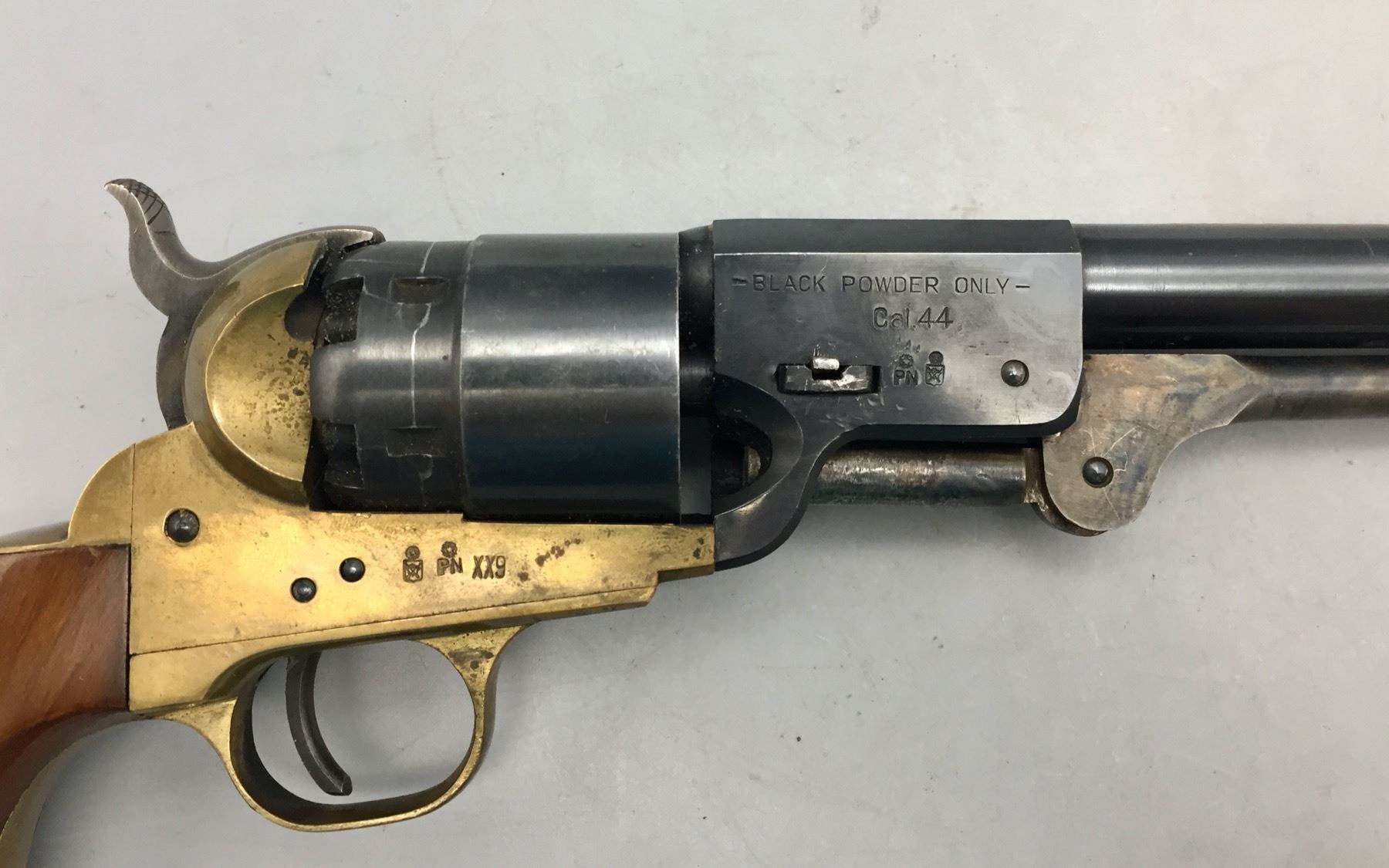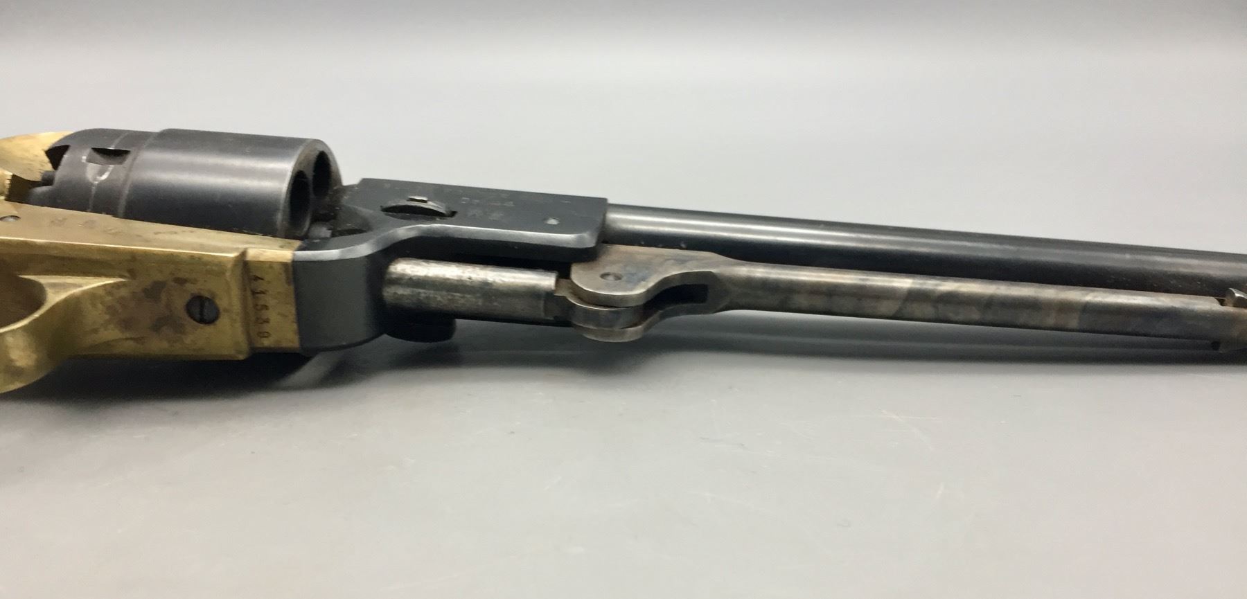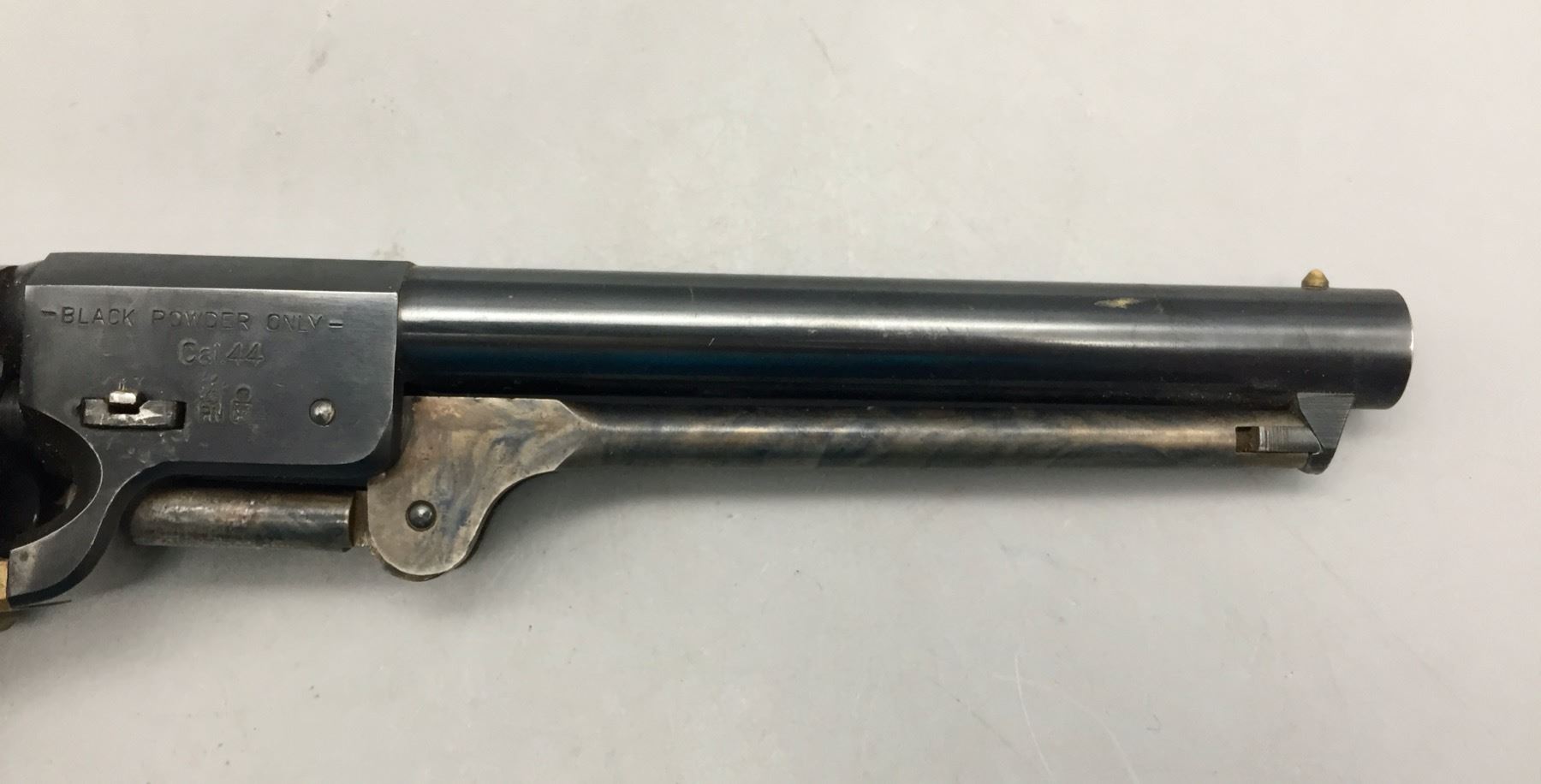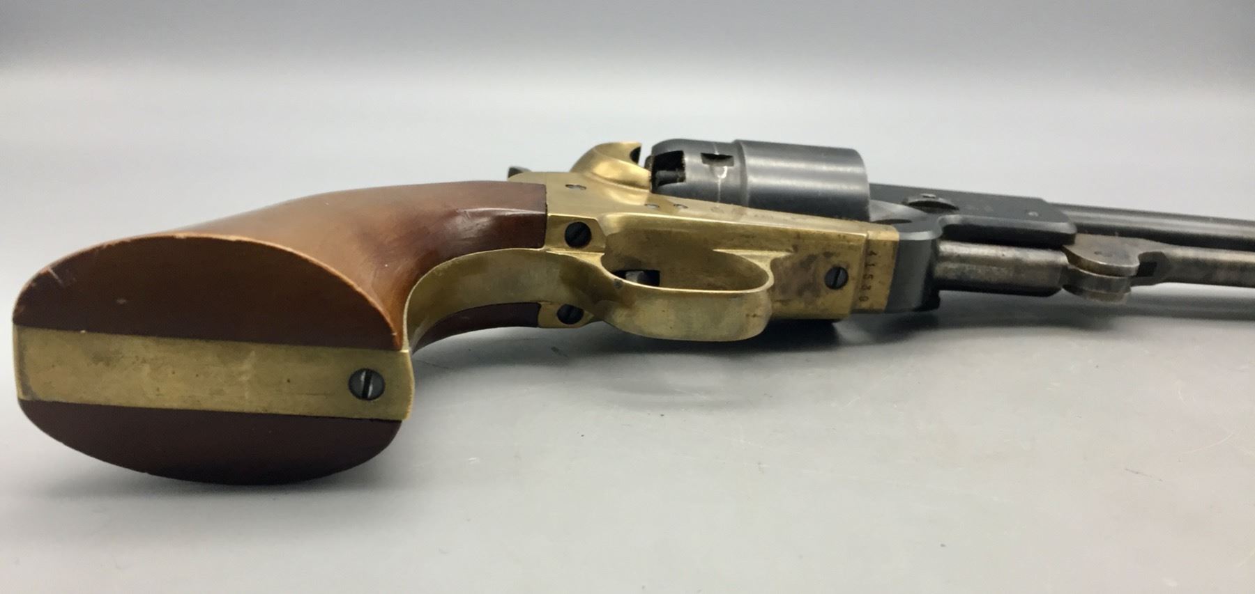 Description: Offered for sale in this lot is a Navy Arms, 1860 Army Replica, .44 caliber black powder, percussion cap revolver. Maker: Navy Arms Co. Approx. Age: Moern. Serial No. 41539. Size: Barrel measures 7.5†with an overall length of 14â€. Condition: Good for its age, minimal wear expected. One grip has marks from an old tag or from tape. Please look closely at the pictures - they are an important part of our description. Shipping: There will be a $15 handling / packaging fee for shipping this lot. The actual cost of postage will be added on top of that. *BLACK POWDER Replica firearm DOES NOT REQUIRE an FFL Transfer*