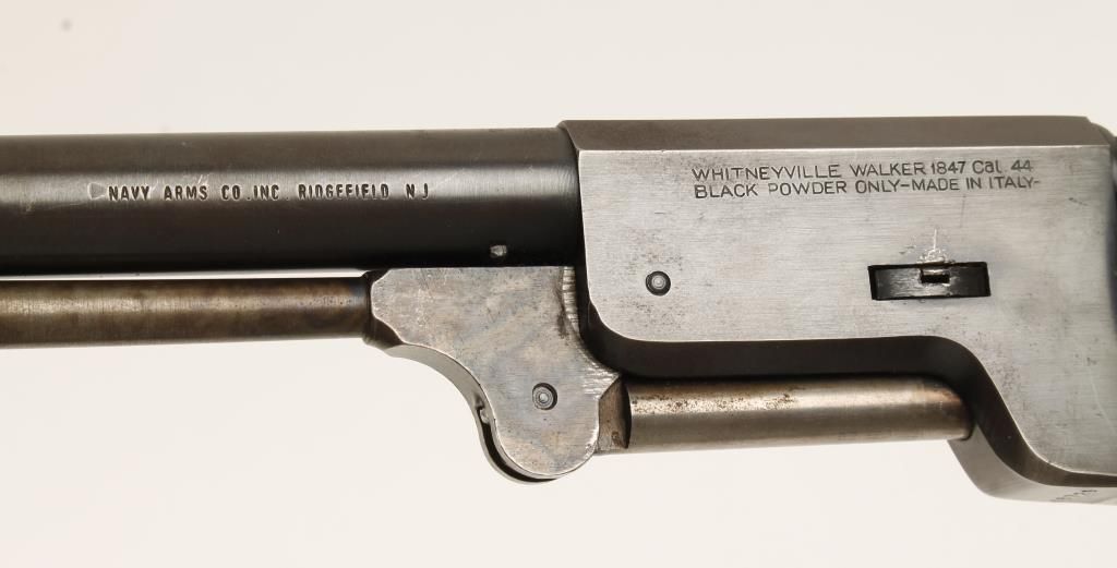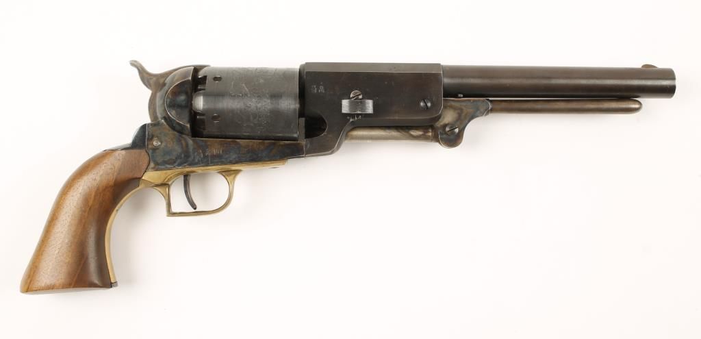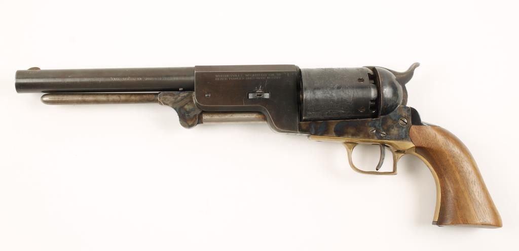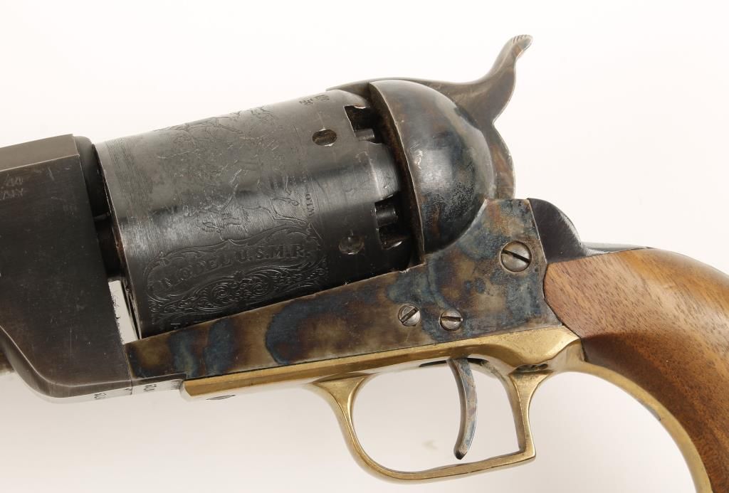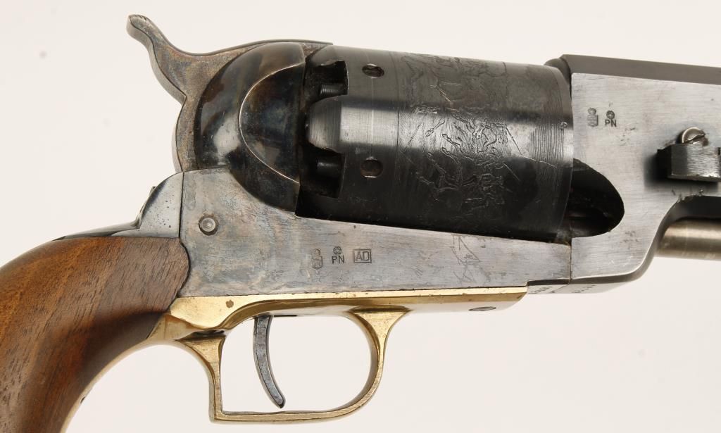 Replica black powder single action 6-shot pistol. 9" barrel. Color cased loading lever. Engraved cylinder showing an indian battle scene. Color cased frame, hammer and trigger. Square backed brass trigger guard. Steel backstrap. Not milled for shoulder stock. Condition is very good with few blemishes to metal or wood. *Antique Firearm*