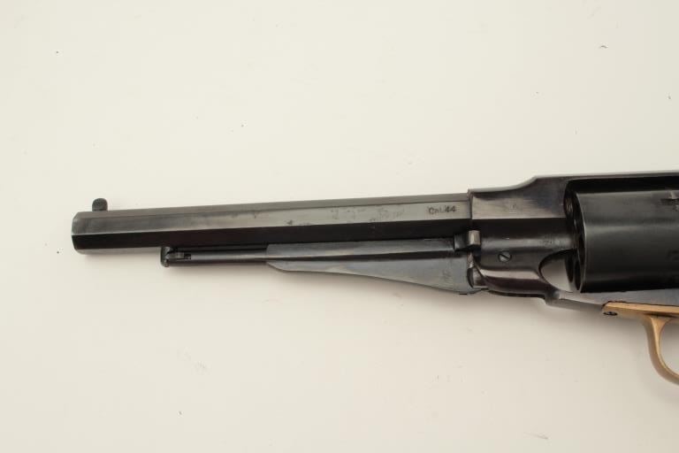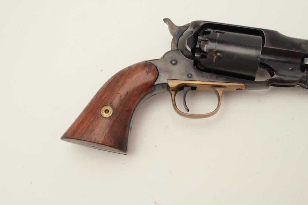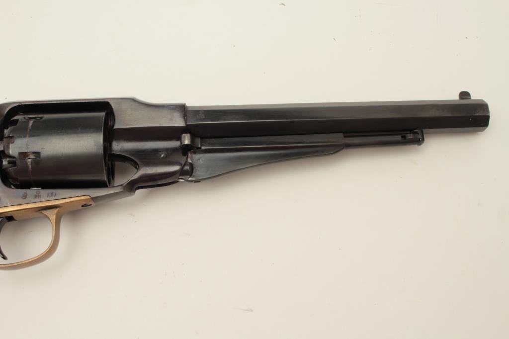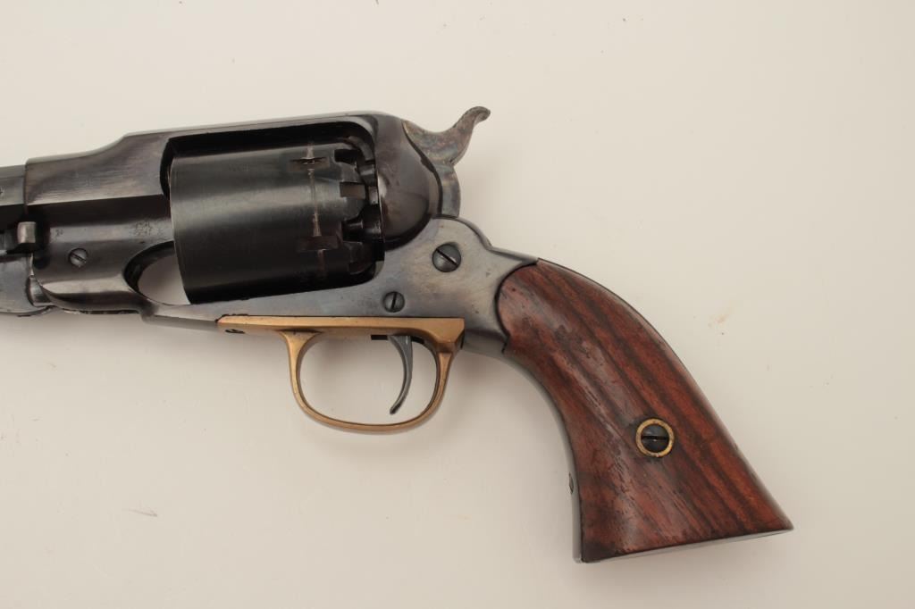 Navy Arms Co. replica of a Remington Model 1858 single action percussion revolver, .44 caliber, 8” octagon barrel, blued finish, wood grips, S/N 12168, in overall very good condition with majority of its blued finishremaining, crisp action and very good grip displaying some wear to grips finish. (Percussion). Est.: $100-$200.
