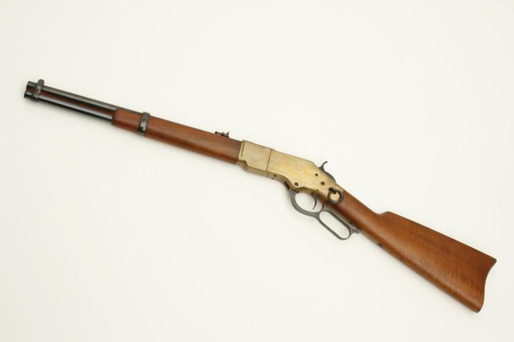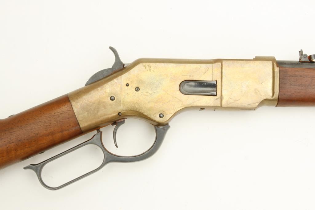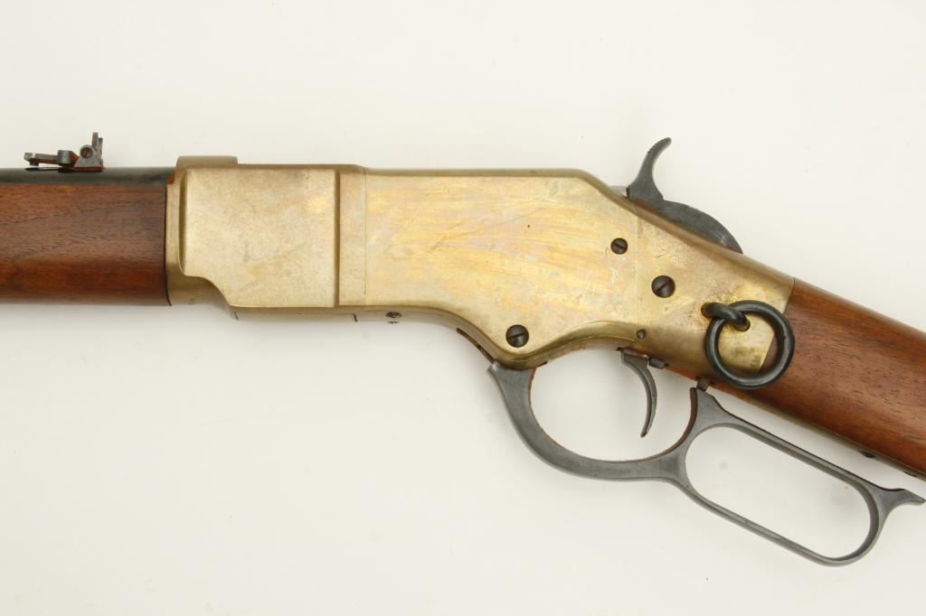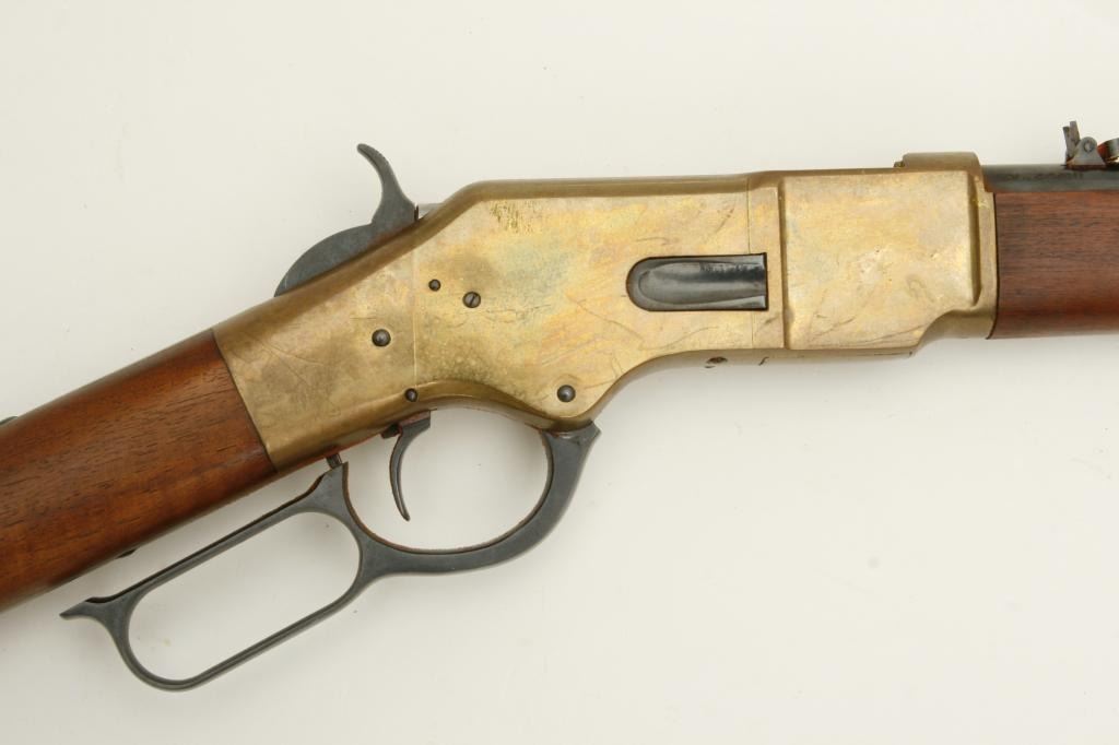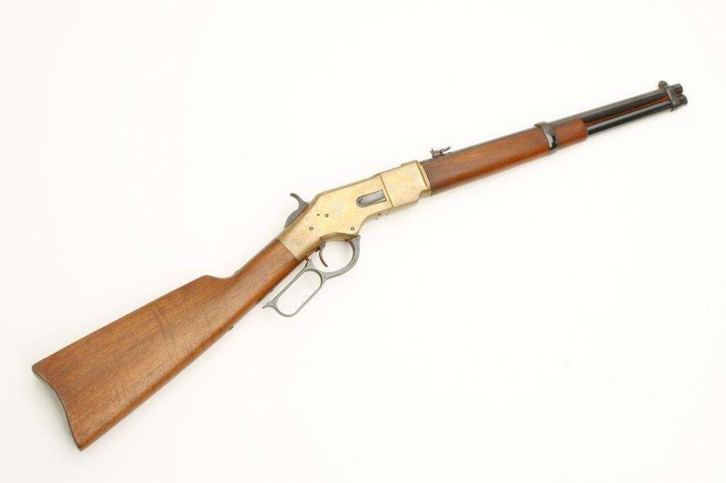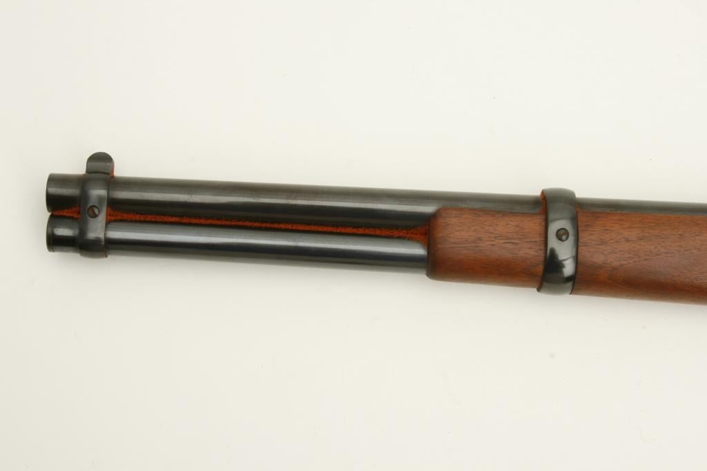 caliber, serial #37381. The gun is in very good overall condition with a 16” round barrel featuring a post front and folding rear sights. The barrel and magazine tube retain nearly all of their polished blue finish while the receiver is done in brass and the saddle ring is retained. The smooth wood stocks are in very good condition with only slight handling marks noted. The butt stock ends with a smooth, brass butt plate. The bore is very dirty, but should clean to good. The action is crisp, the markings are sharp and this carbine has seen little use. (Modern) Est.: $400-$800.